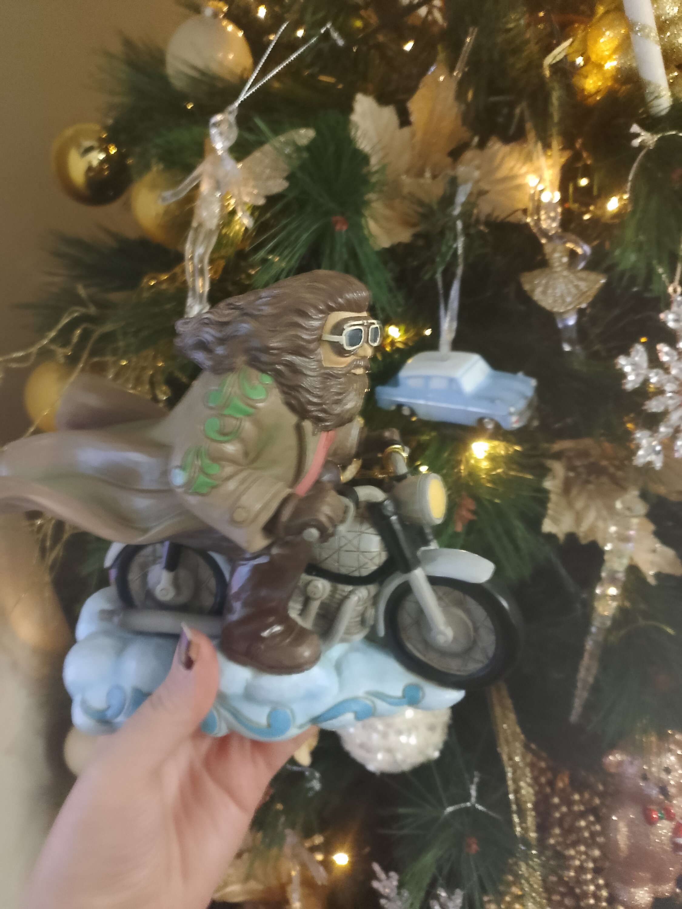 Vivez le frisson du vol avec cette scène de Jim Shore mettant en scène Hagrid sur sa moto volante emblématique. Avec son long manteau flottant et ses lunettes fermement en place, Hagrid fonce dans le ciel, capturant l'excitation du monde des sorciers.