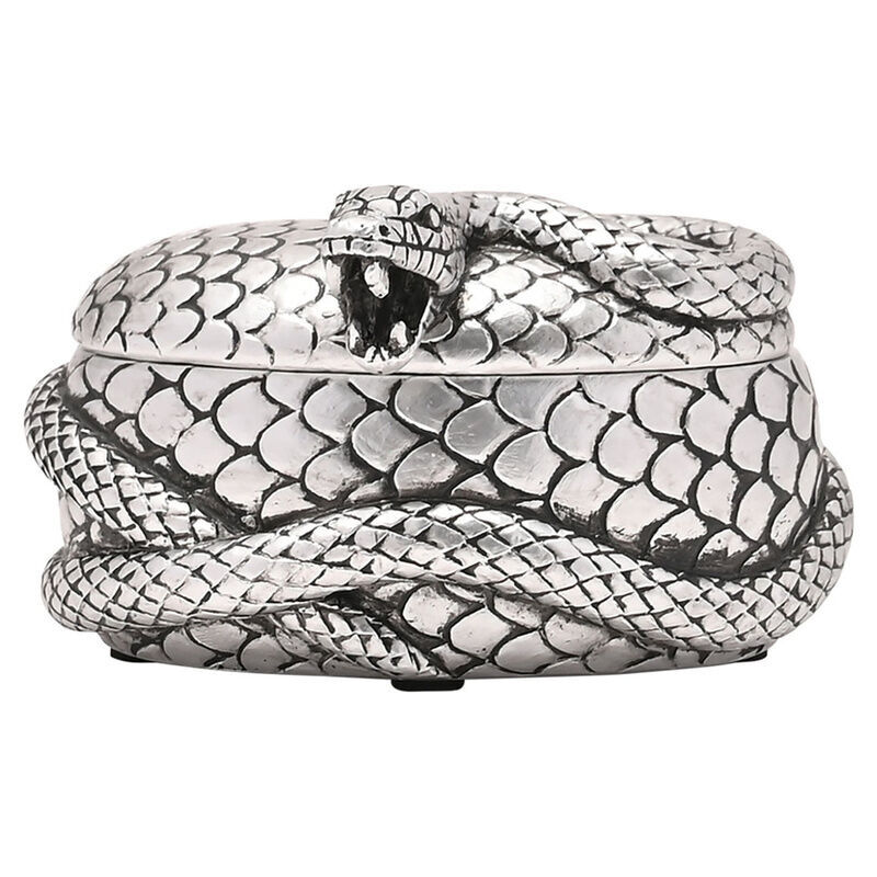 Son design met en scène Nagini, le redoutable serpent de Lord Voldemort, élégamment enroulé autour de la boîte argentée.