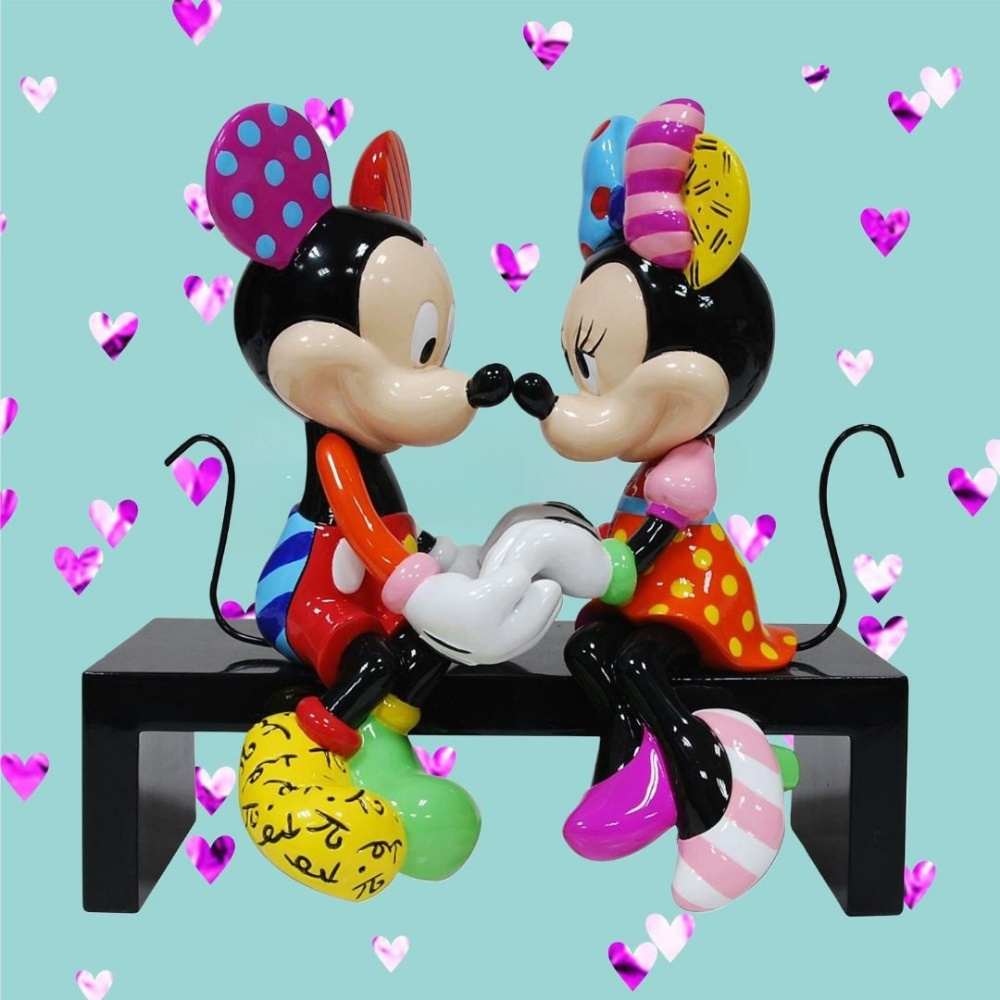 Conçu par l'artiste pop Romero Britto, Mickey & Minnie partage un doux moment en se tenant la main assise sur un banc de parc. Cet hommage affectueux au couple le plus aimé de Disney est orné de couleurs vives par les motifs et les couleurs emblématiques et audacieux de Britto, ce qui en fait un objet unique.