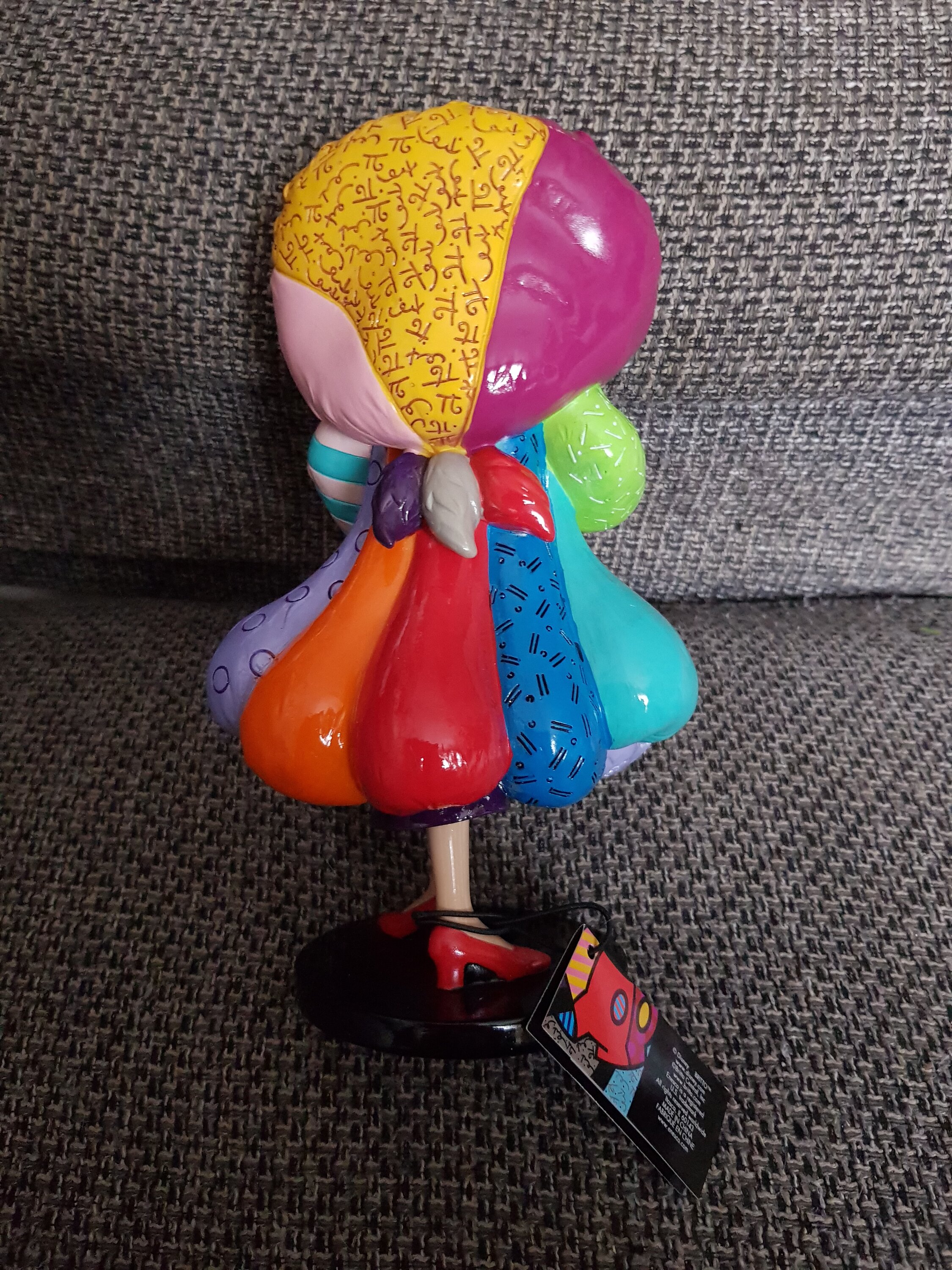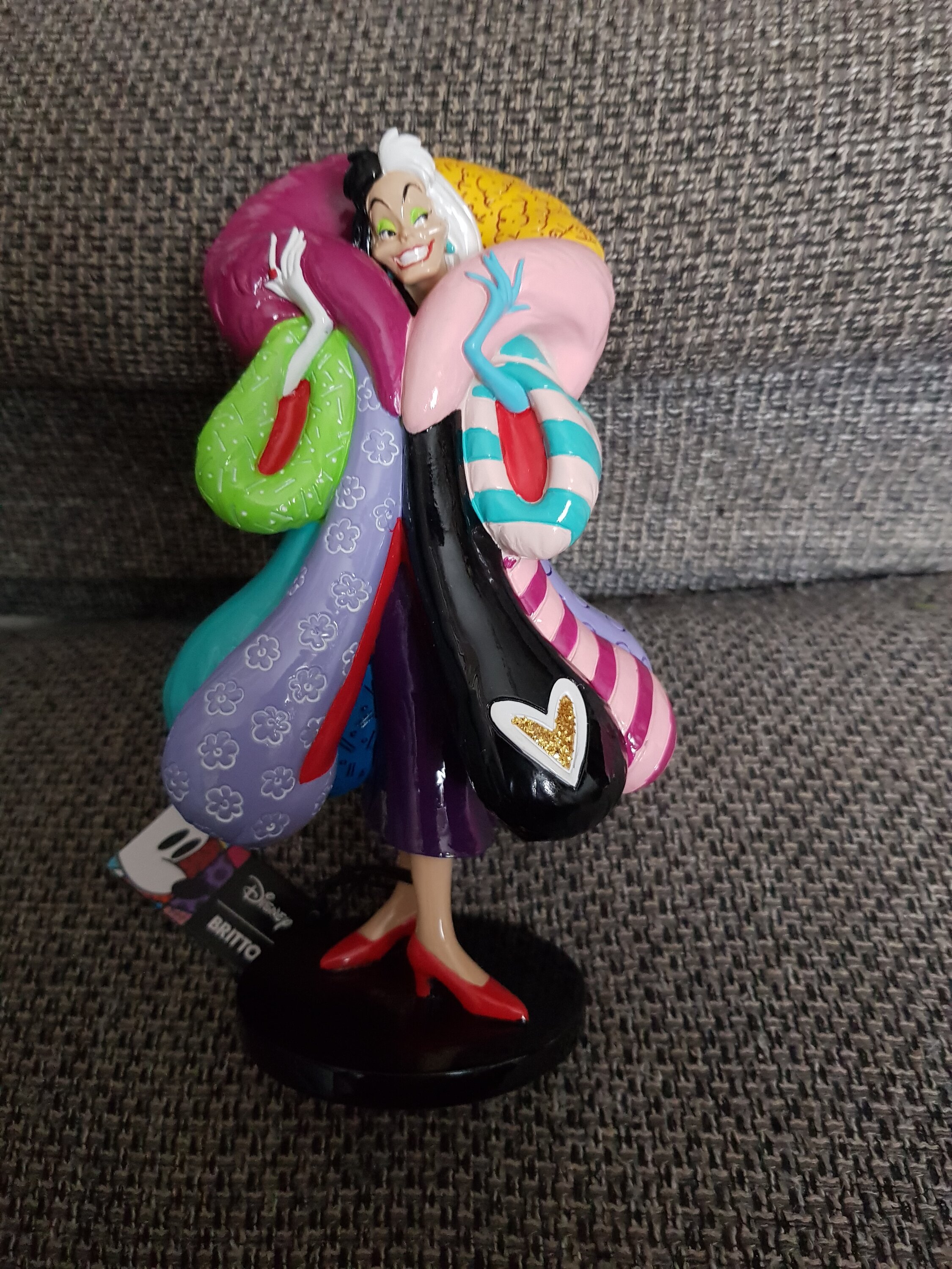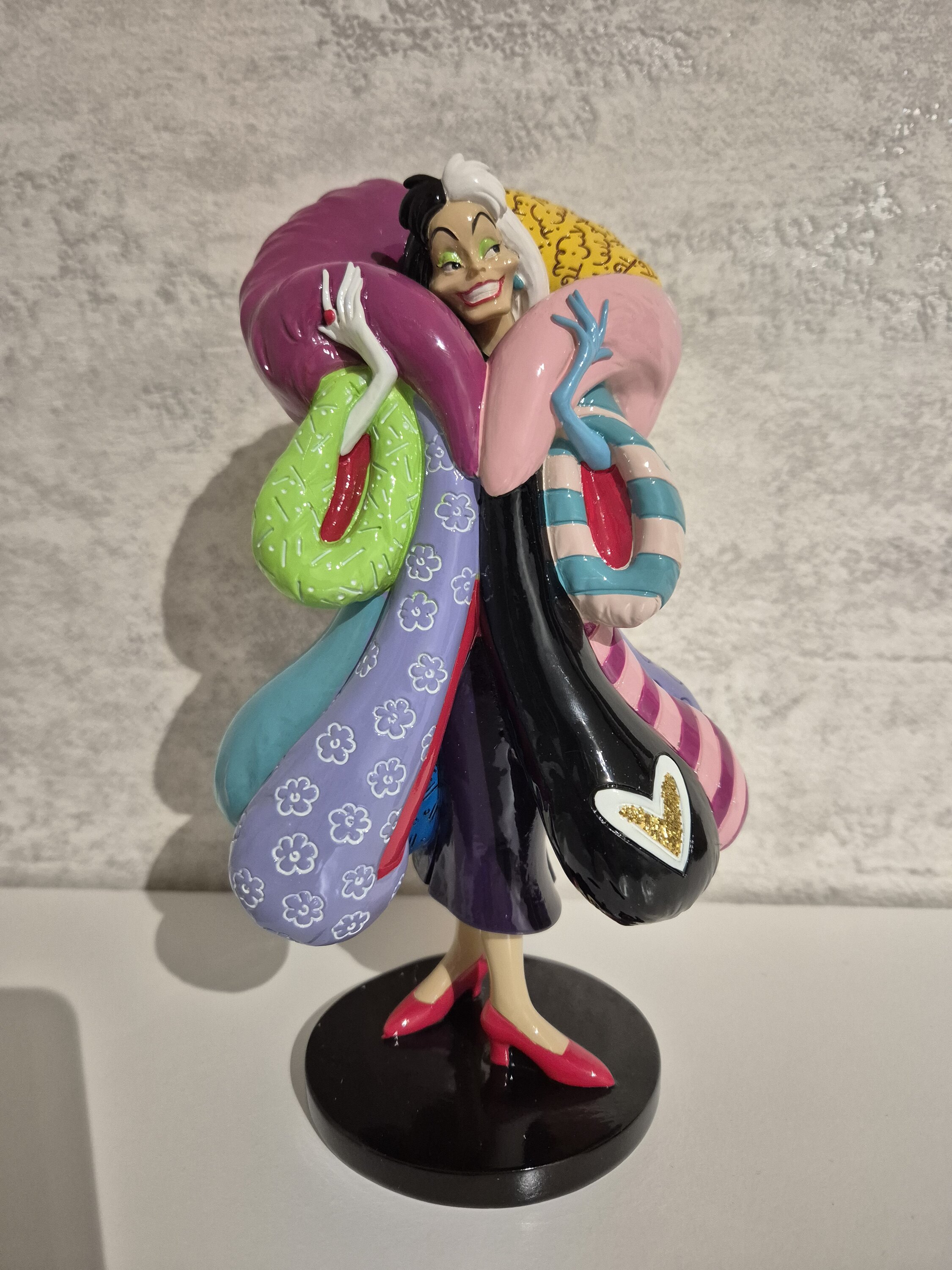 Audacieuse et iconique, Cruella d'Enfer se voit réinterprétée dans un style pop art vibrant, grâce à la signature inimitable de l'artiste Romero Britto. Avec ses couleurs éclatantes et ses motifs graphiques contrastés, cette figurine capture à merveille sa personnalité extravagante et son assurance. Une pièce décorative saisissante qui apporte une touche artistique moderne à une méchante Disney classique.