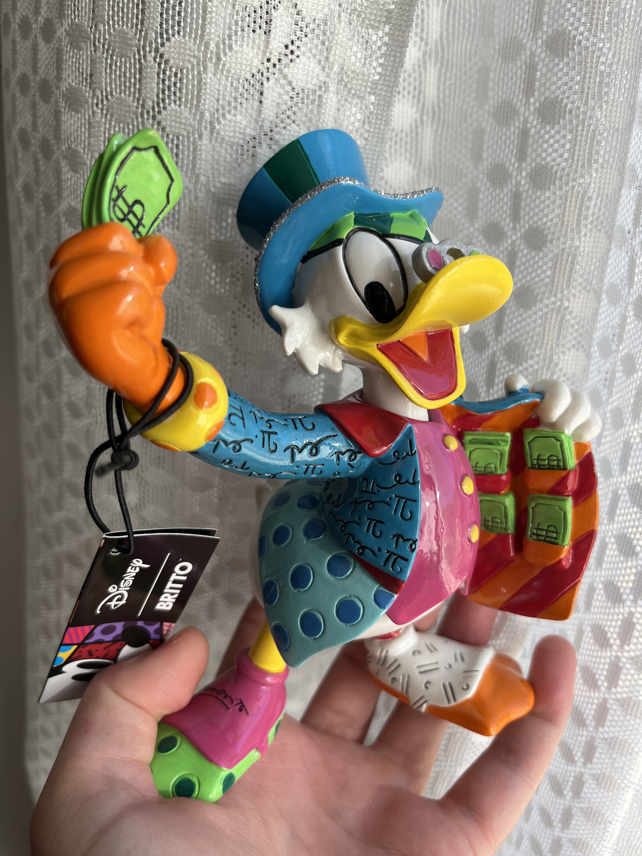 Dans cette figurine, l'oncle Picsou avec les poches pleines de billets montre sa richesse. Chaque figurine Disney by Britto, décoré dans un style pop art par l'artiste international Roméro Britto, est en résine peinte à la main avec une finition laquée et brillante.