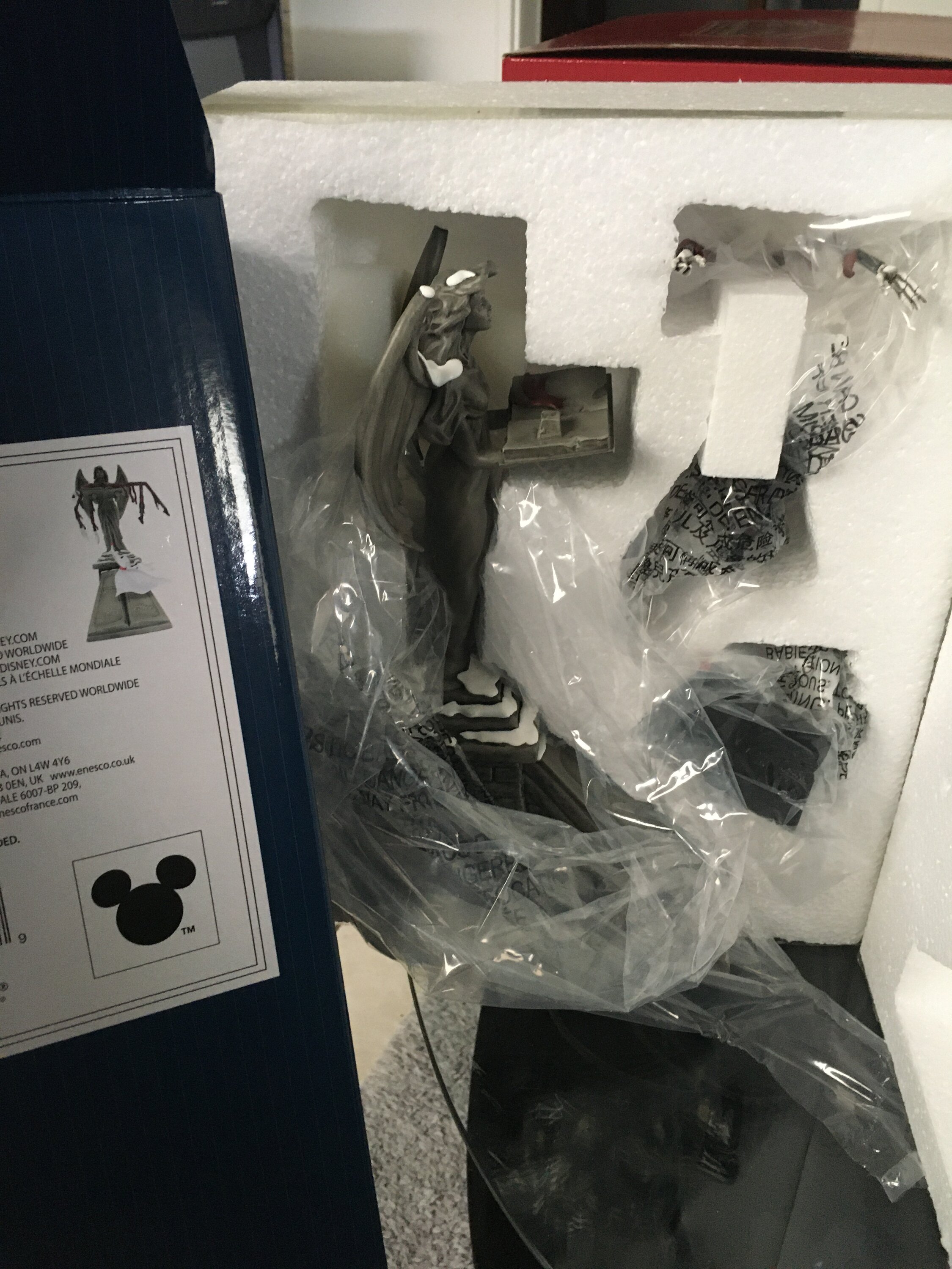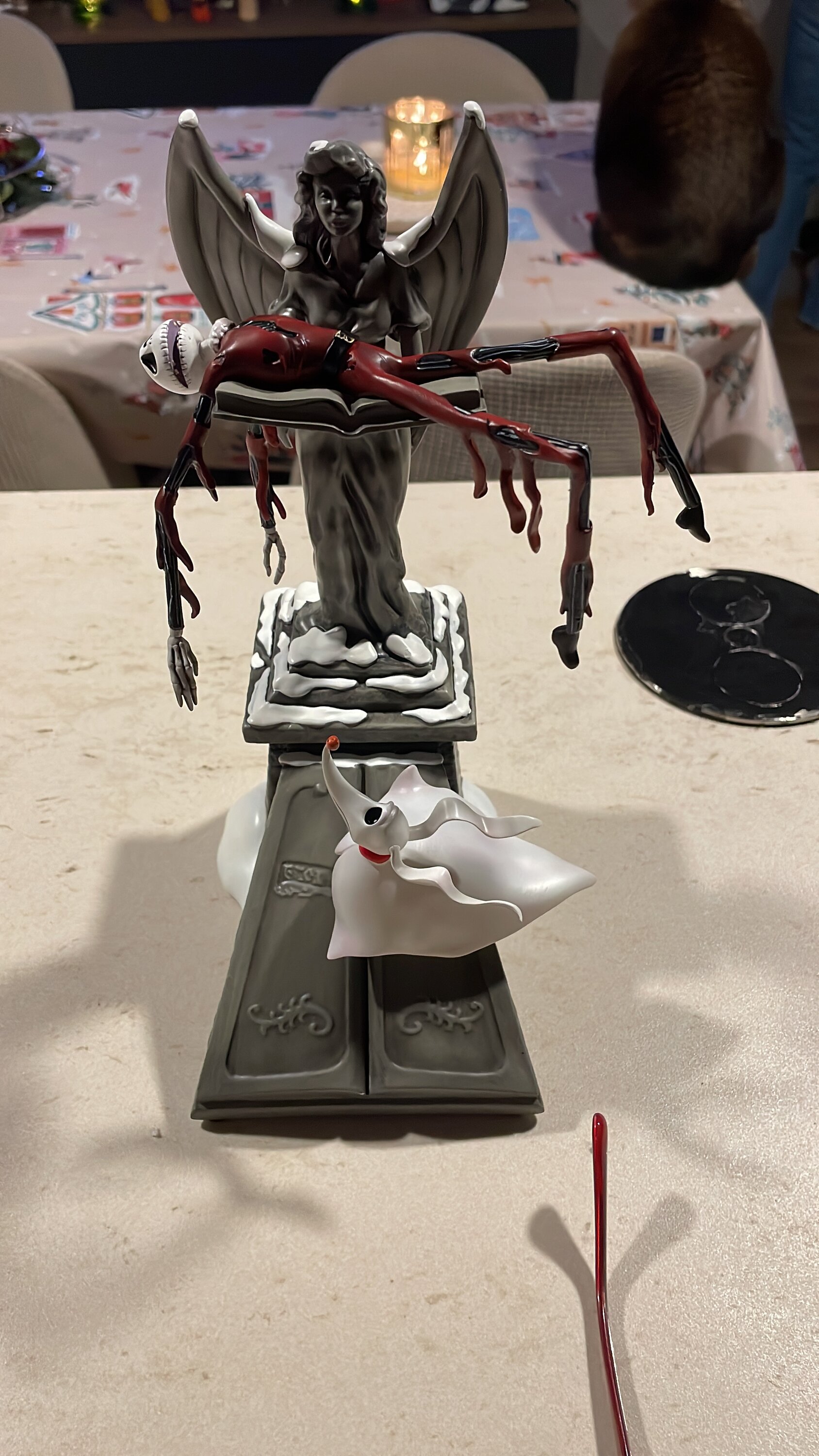 Un Zéro illuminé lève les yeux vers son maître vaincu Jack Skellington alors qu'il tombe du ciel dans les bras d'un ange sur une pierre tombale. Fabriquée de main de maître et très détaillée, il s'agit d'une nouvelle statue célébrant L'étrange Noël de Monsieur Jack de Tim Burton, le film préféré des fans.