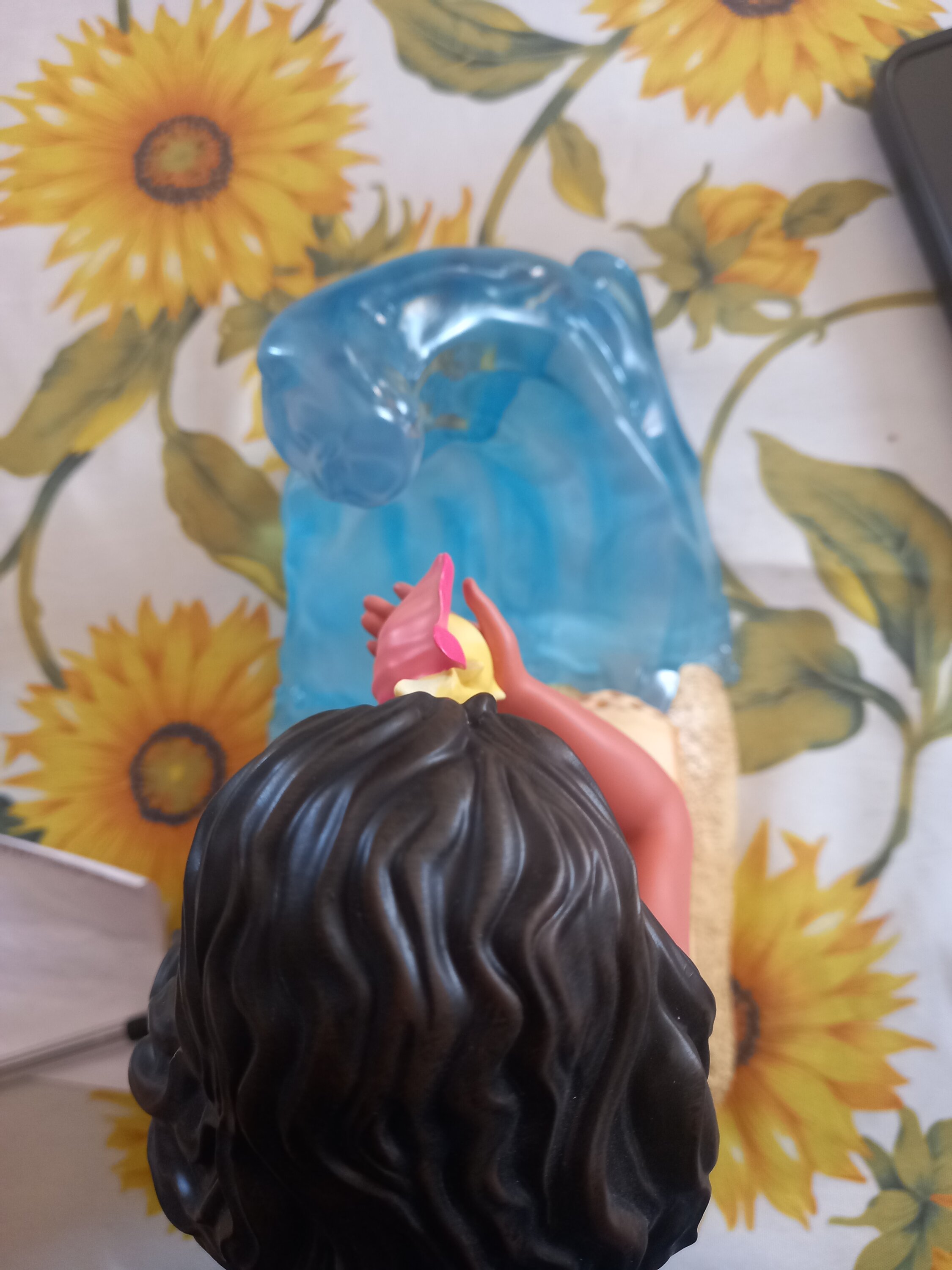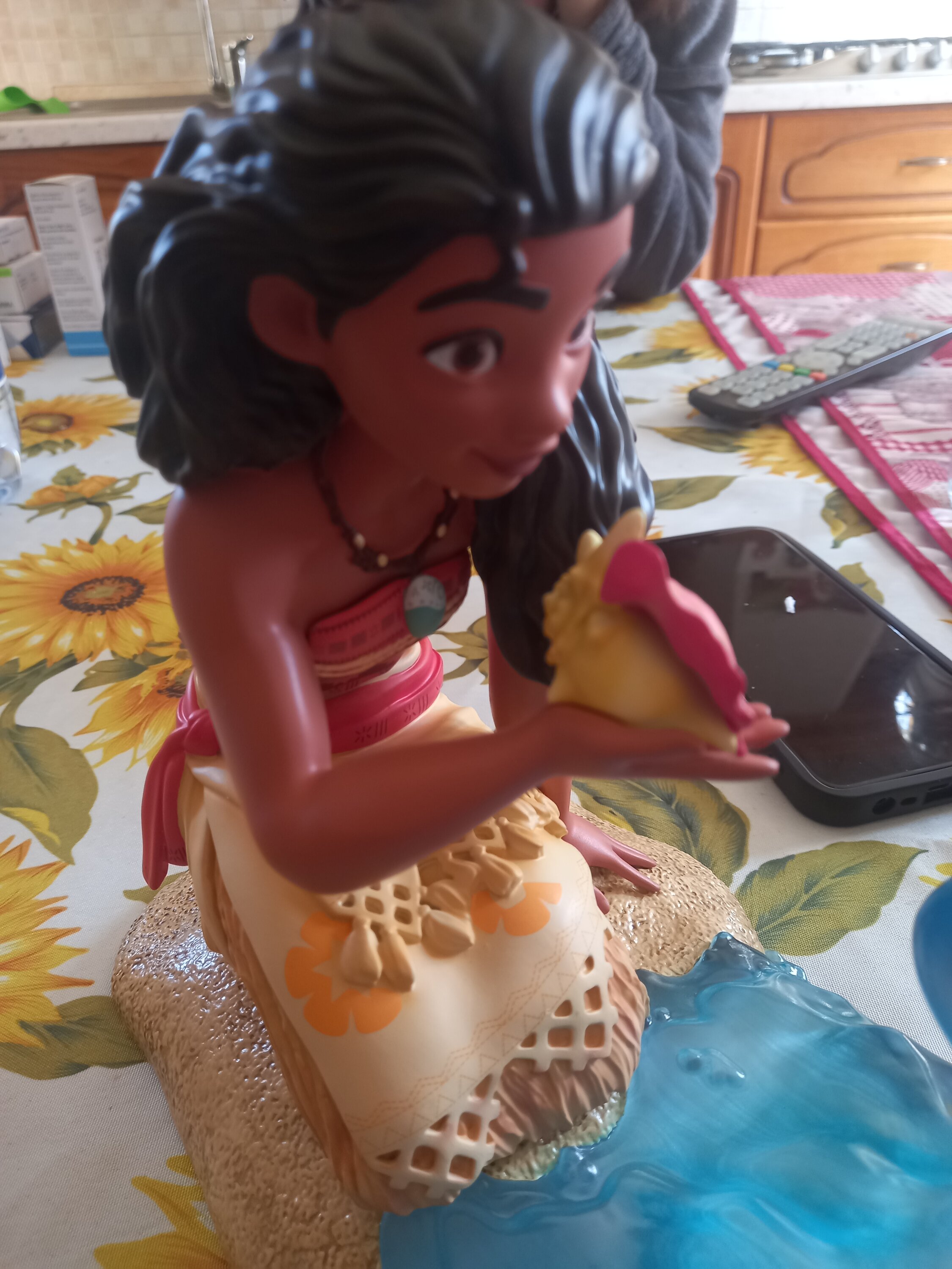 Vaiana tient un cadeau des eaux polynésiennes dans sa main alors qu'elle est assise sur une plage de sable de Motunui entourée de vagues de mer en résine transparente.