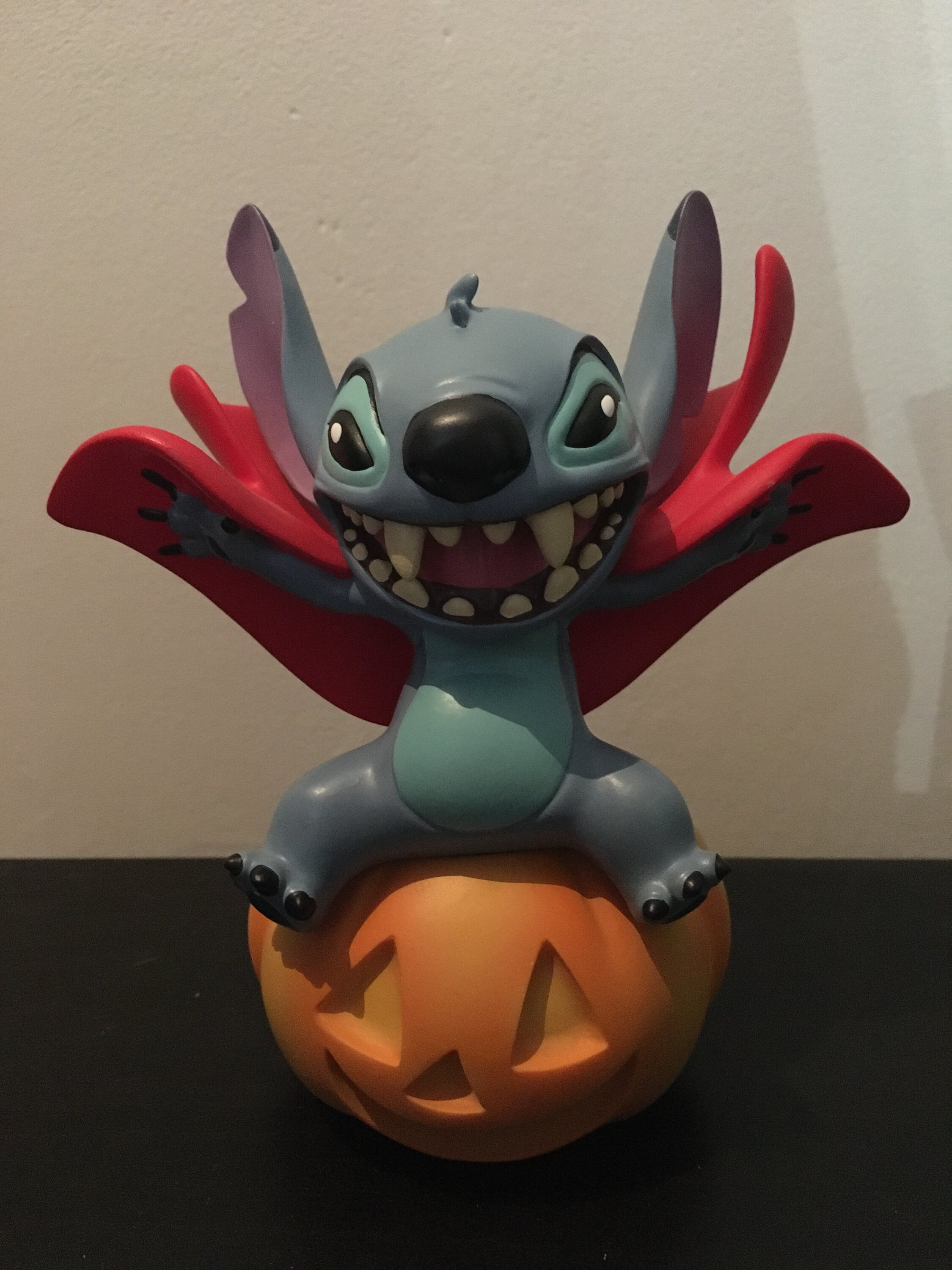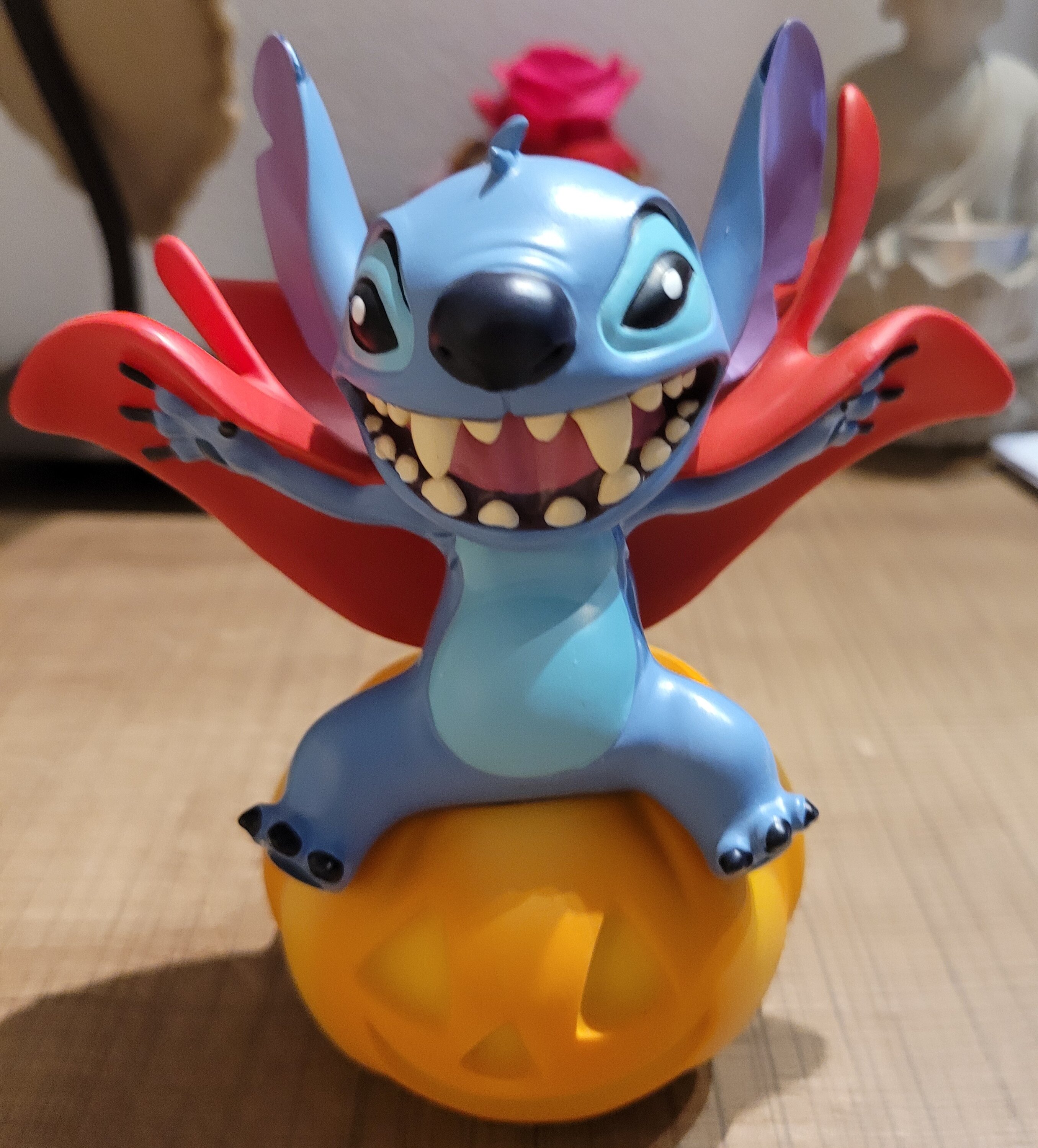 Célébrez les fêtes avec Stitch! Pour Halloween, Stitch enfile une cape de vampire et dévoile ses crocs extraterrestres pour une pose effrayante parfaite pour votre décoration Halloween .