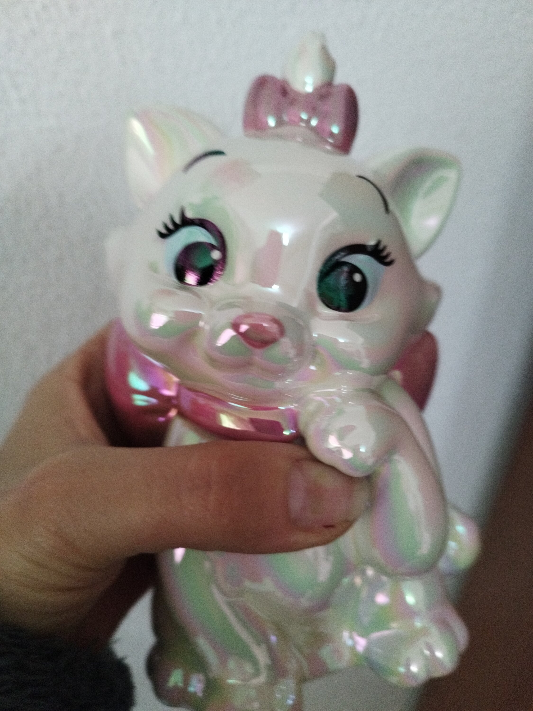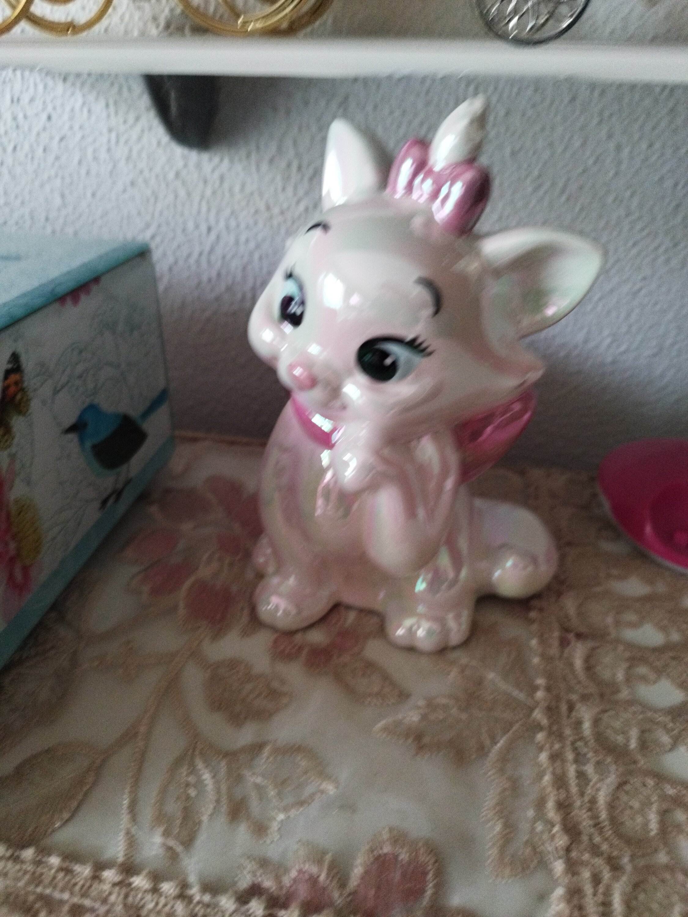 Marie, l'adorable chaton du classique animé de Disney Les Aristochats, est représentée dans cette tirelire en céramique moulée et peinte à la main. Un procédé de galvanoplastie spécial donne à Marie une brillance irisée unique et très attrayante.