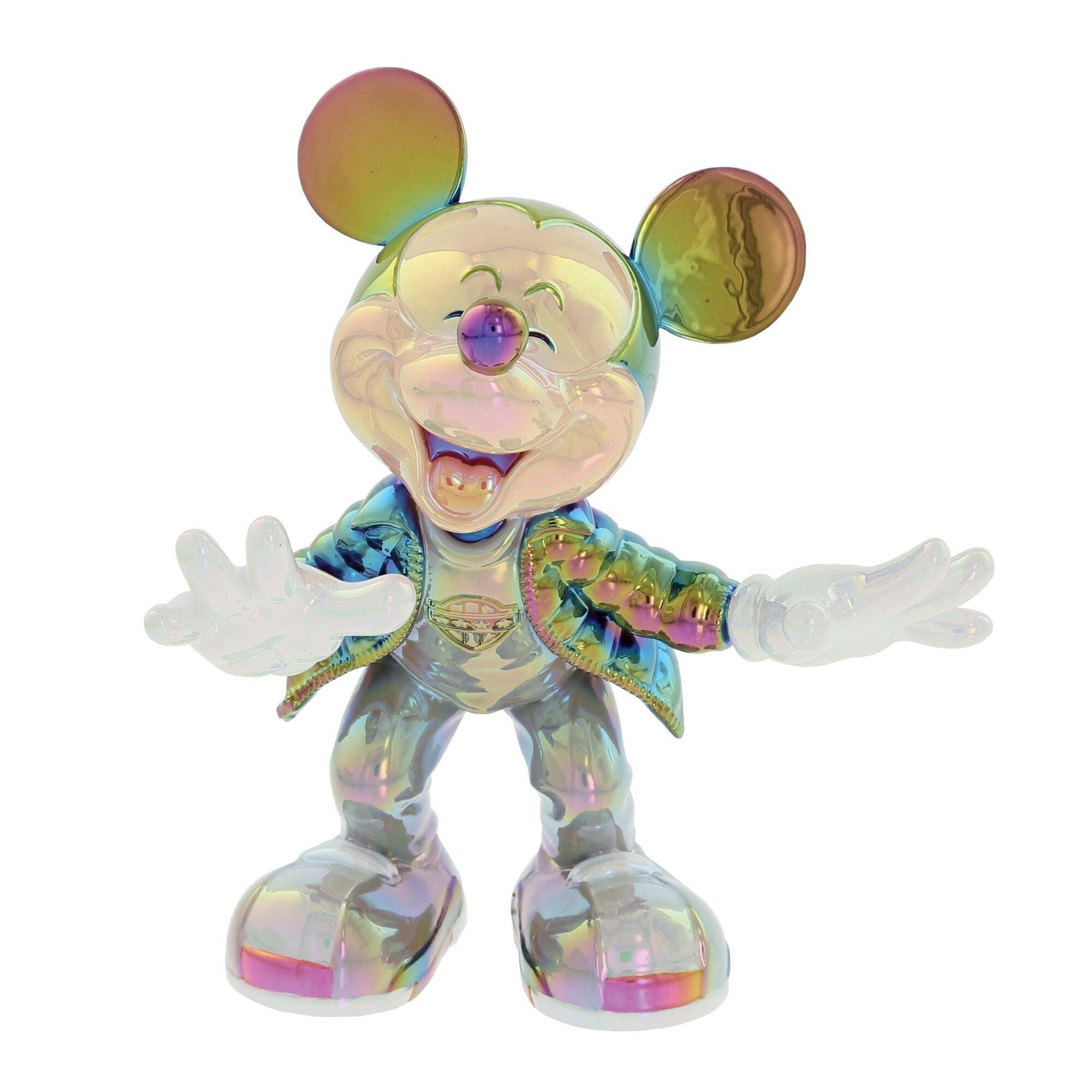 Cette figurine représente Mickey Mouse dans une pose joyeuse et expressive, capturant parfaitement son énergie et son sourire emblématique. Ses bras ouverts et son expression riante traduisent toute la gaieté et l'esprit ludique propres à l'univers Disney. La particularité de cette pièce réside dans sa finition électroplaquée aux reflets irisés, lui conférant un aspect moderne et lumineux. Les nuances métalliques changeantes ajoutent une touche contemporaine à ce personnage iconique tout en mettant en valeur les détails de la sculpture. À la fois décorative et originale, cette figurine est idéale pour les fans et collectionneurs Disney souhaitant ajouter une pièce unique à leur collection.