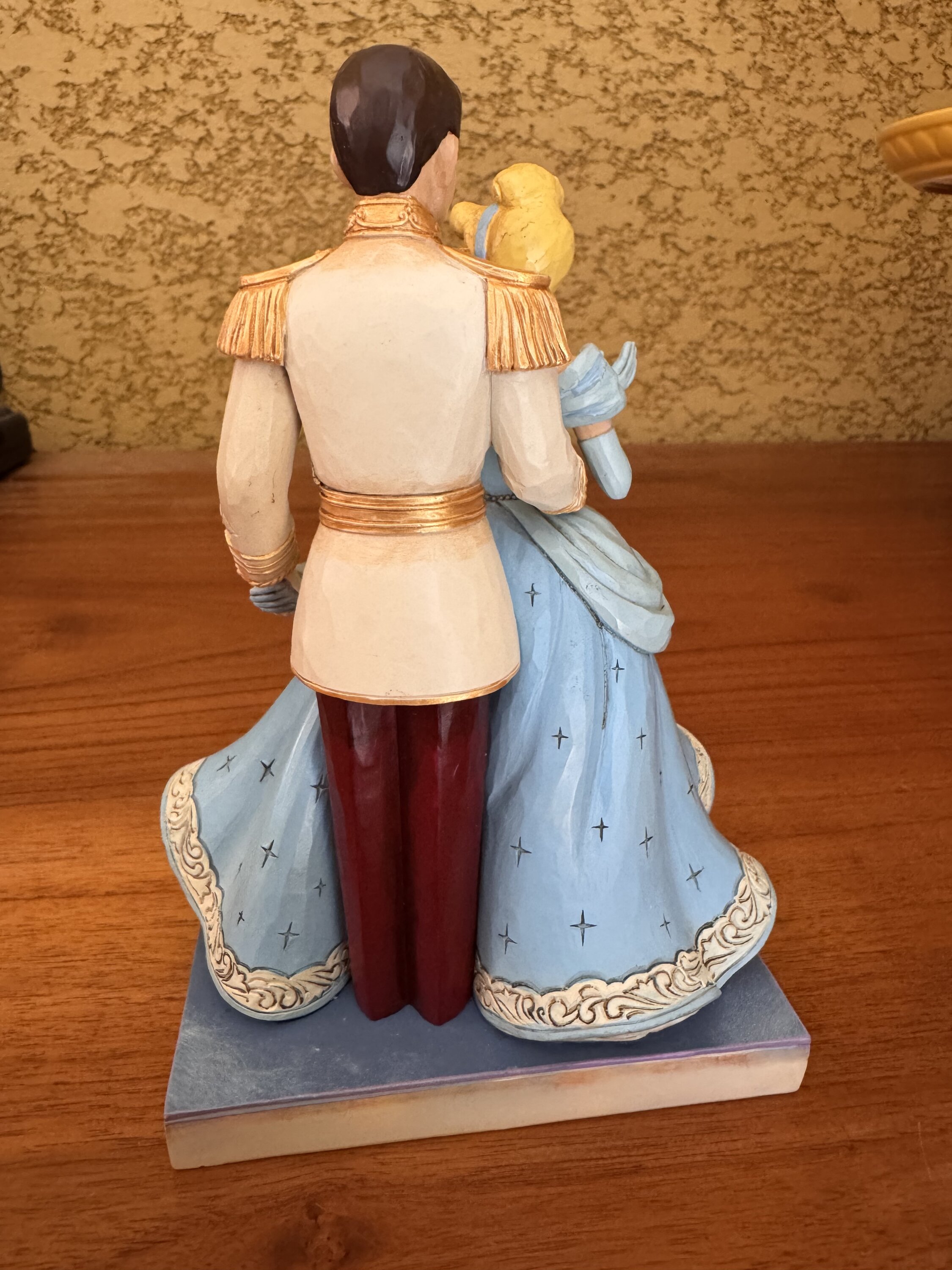 Cette magnifique création Disney de Jim Shore célèbre le 75ème anniversaire de l'histoire de Cendrillon. Ce superbe design représente Cendrillon dans sa robe de bal bleue emblématique avec des détails de conception complexes. Le prince charmant lui tient la main dans sa tenue royale.