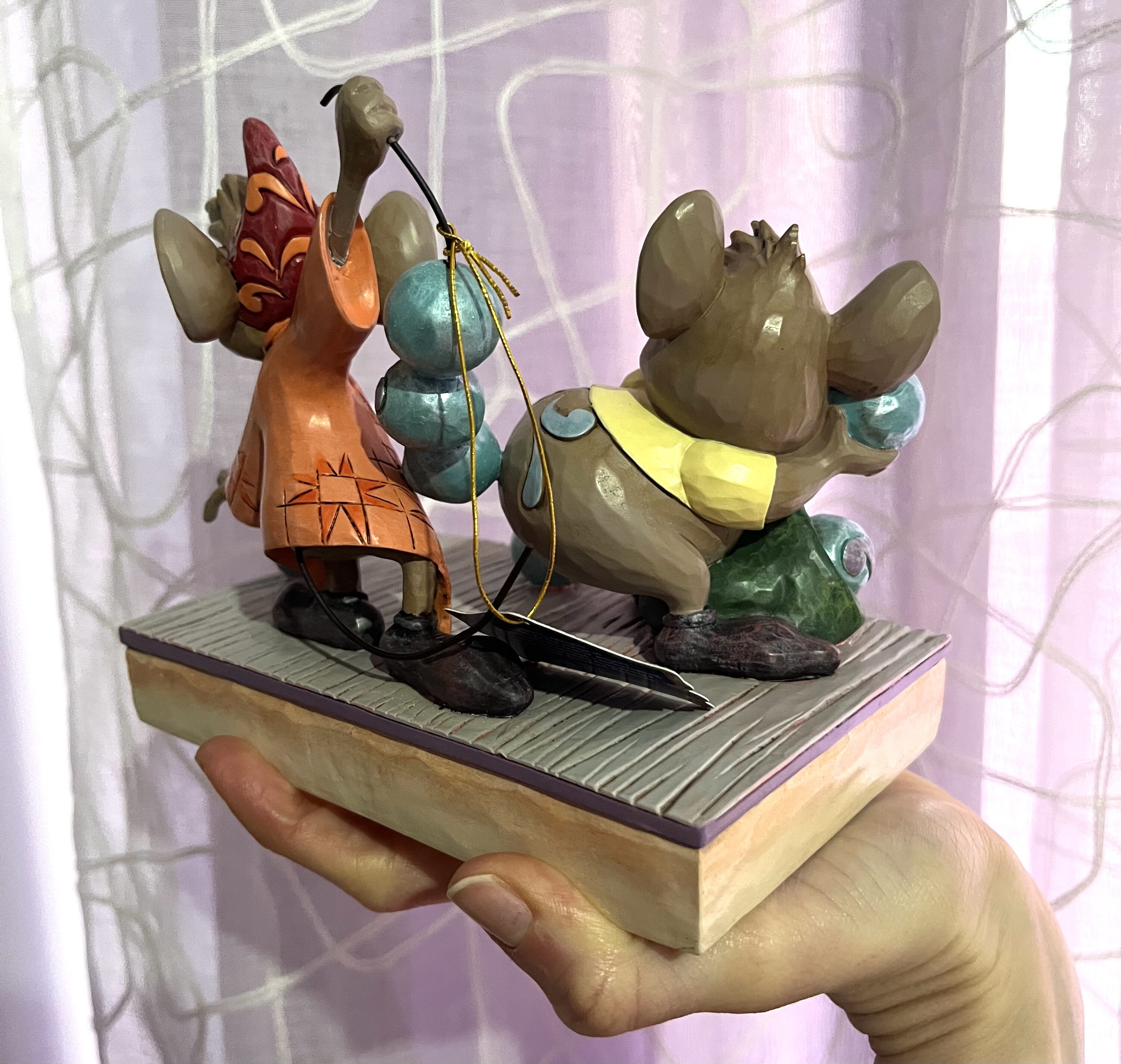 Cette création bien-aimée de Jim Shore présente les meilleurs amis de Cendrillon, Gus et Jaq. Ce duo ludique se retrouve toujours en difficulté mais reste des compagnons fidèles et serviables. Après avoir cassé un collier de perles de romarin, Jaq les récupère de la queue de Gus !