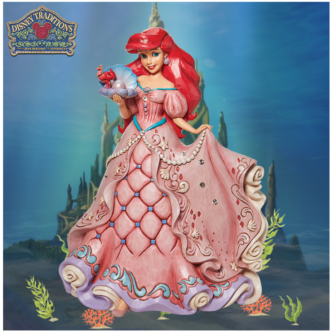 Deuxième de la série Enchanted Princesses, ce modèle Jim Shore met en scène Ariel dans une belle robe ornée de coquillages et de bijoux, tenant une huître avec une perle.