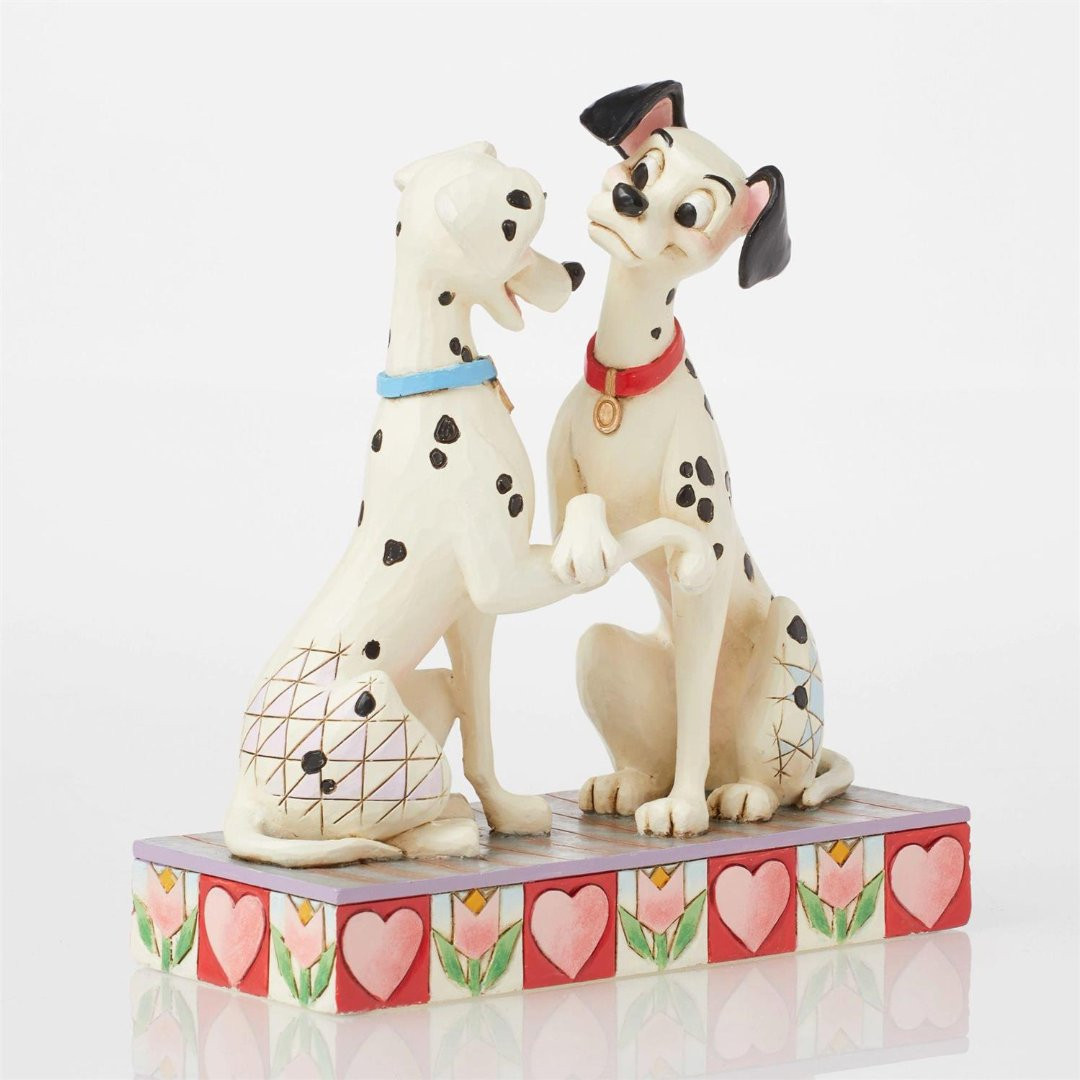 Les deux premiers des 101 Dalmatiens, Pongo et Perdita, tiennent la patte dans ce dessin Disney romantique de Jim Shore. Le couple partage l'amour dans leurs yeux alors qu'ils échangent des sourires aux joues roses dans cette adorable pièce des chiens bien-aimés.
