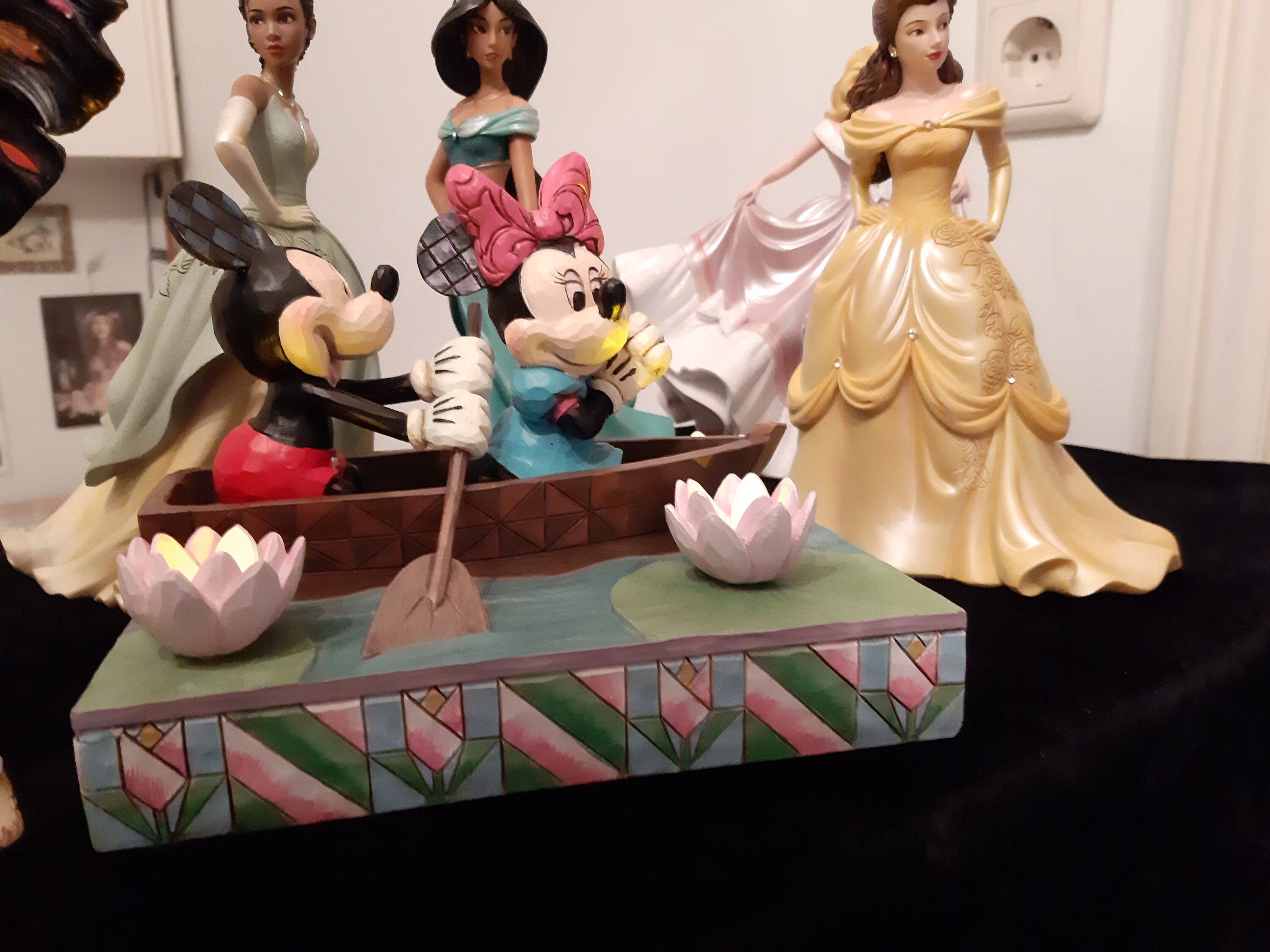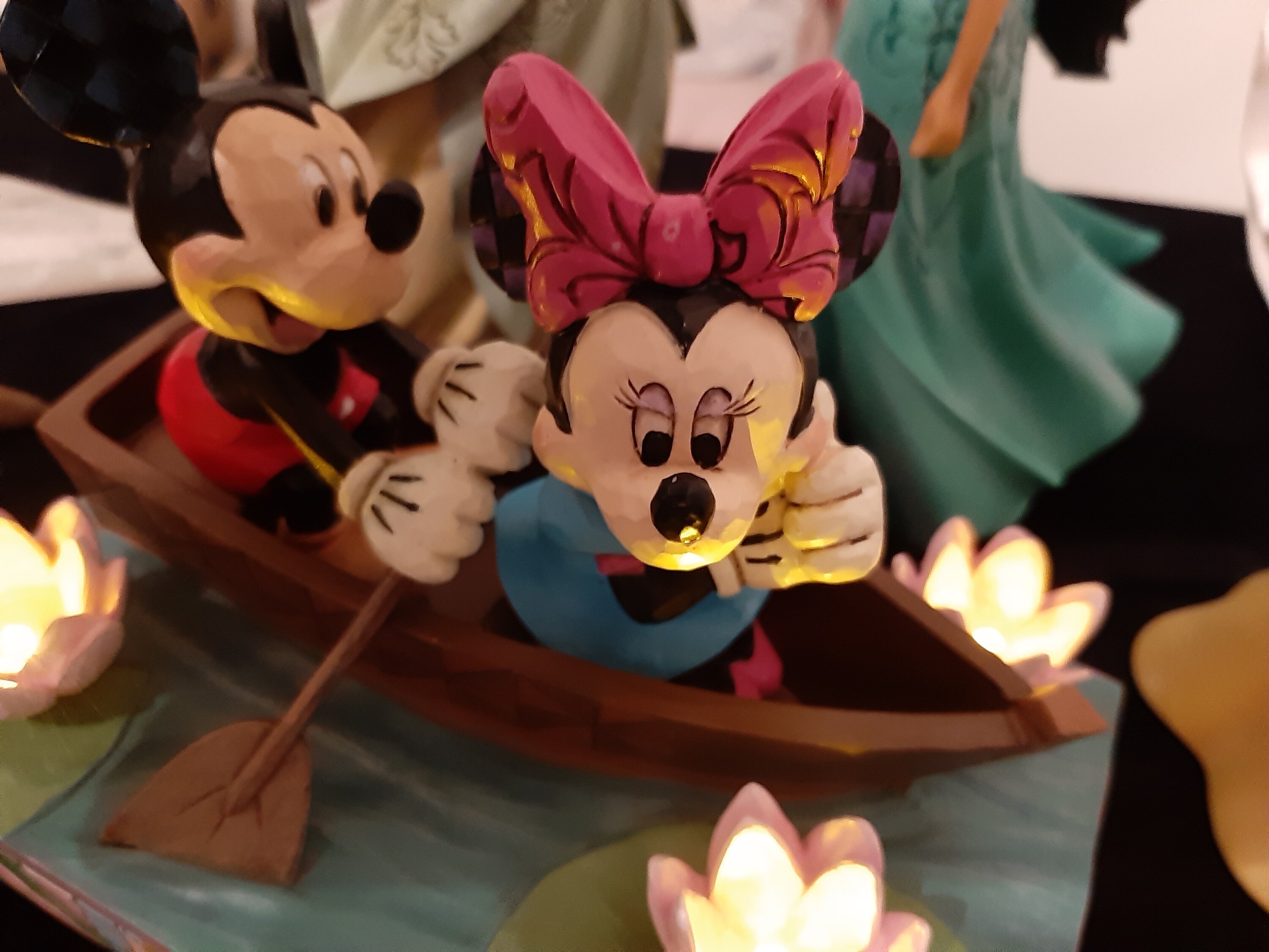 Jim Shore crée une scène romantique de personnages bien-aimés, Mickey et Minnie Mouse, à bord d'une barque pittoresque baignée dans la lueur de la tranquillité. Au milieu de la sérénité de la nature, des fleurs épanouies ornent leur rendez-vous fluvial tandis que les deux tourtereaux flottent.