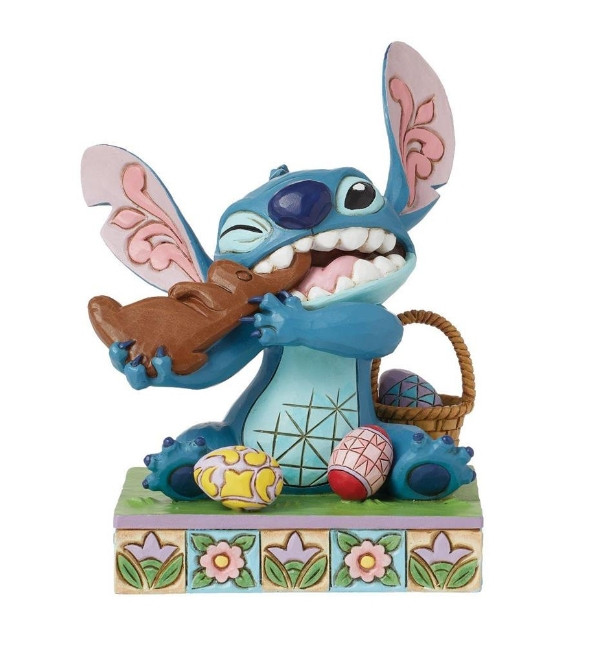 Délectez-vous du charme fantaisiste de Jim Shore alors que Stitch l'extraterrestre se livre aux festivités de Pâques , entouré d'une gamme colorée d'œufs de Pâques . Les yeux pétillants de malice, Stitch grignote joyeusement un lapin en chocolat avec une joie contagieuse.