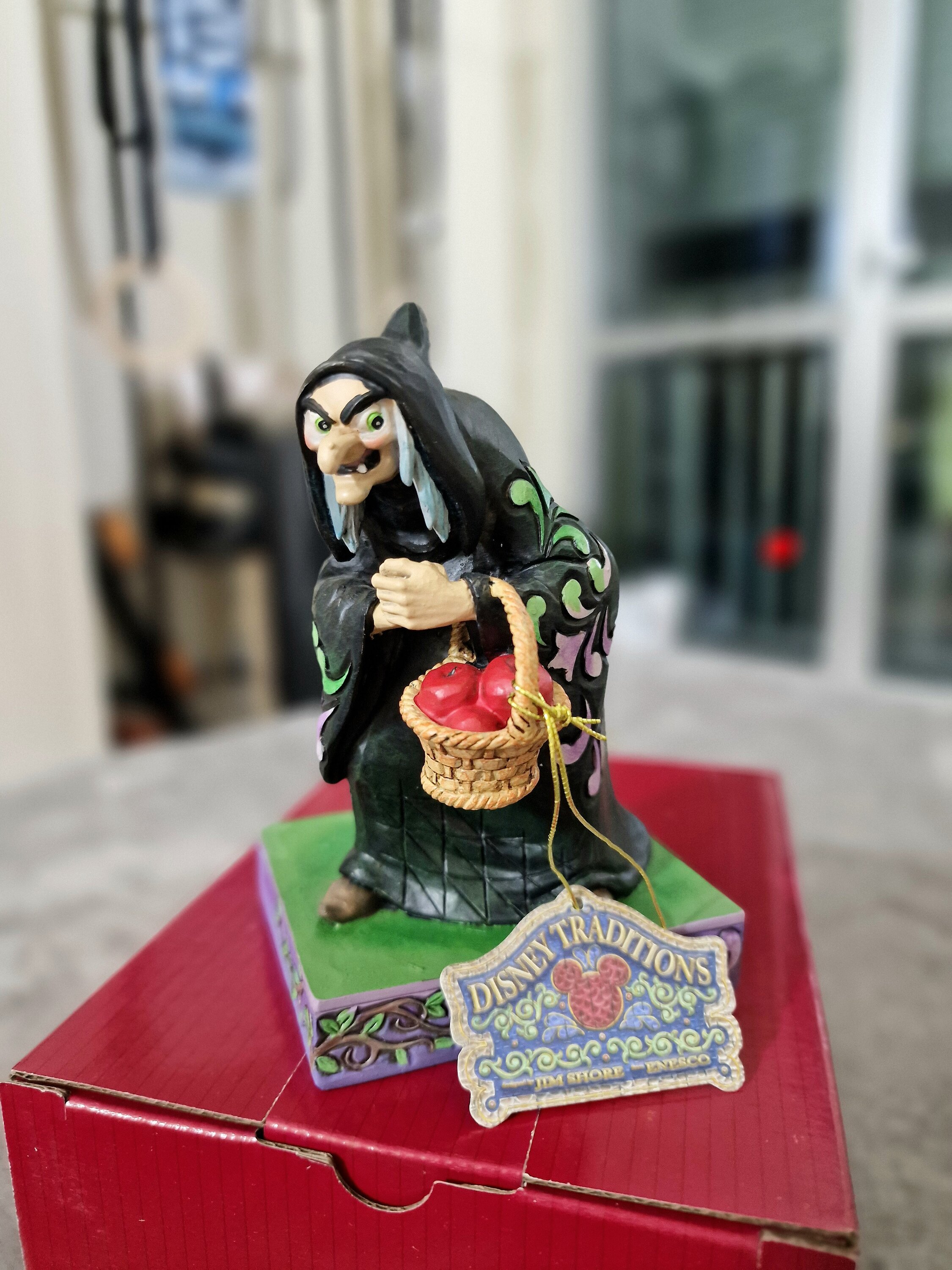 Sous une apparence sinistre, la méchante sorcière se cache dans l'ombre sous la forme d'une femme âgée, sa cape noire ornée de rosemaling Jim Shore vibrant, alors qu'elle porte un panier rempli de pommes empoisonnées. Ses intentions dégoulinent de malice et de tromperie.