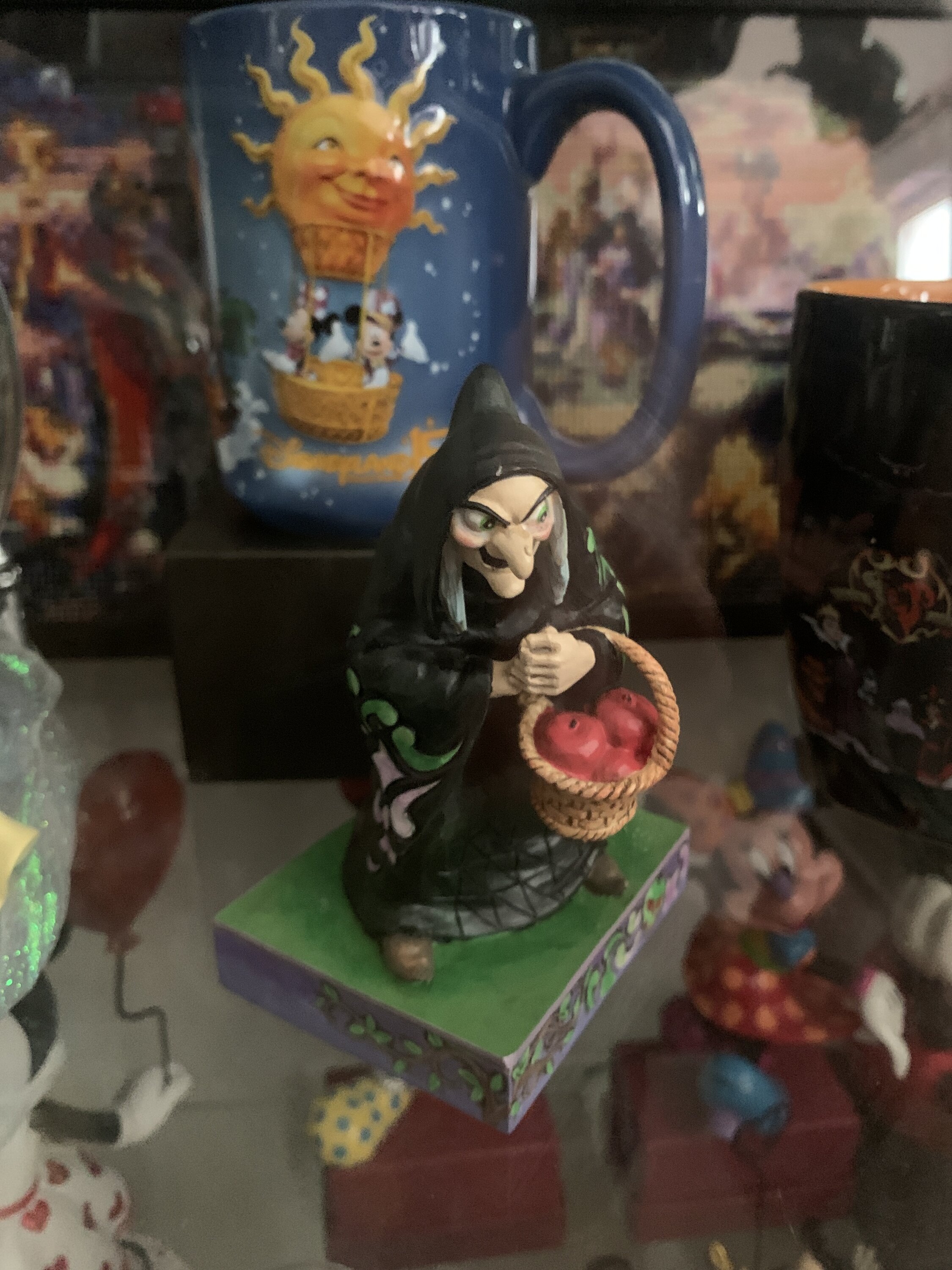 Sous une apparence sinistre, la méchante sorcière se cache dans l'ombre sous la forme d'une femme âgée, sa cape noire ornée de rosemaling Jim Shore vibrant, alors qu'elle porte un panier rempli de pommes empoisonnées. Ses intentions dégoulinent de malice et de tromperie.