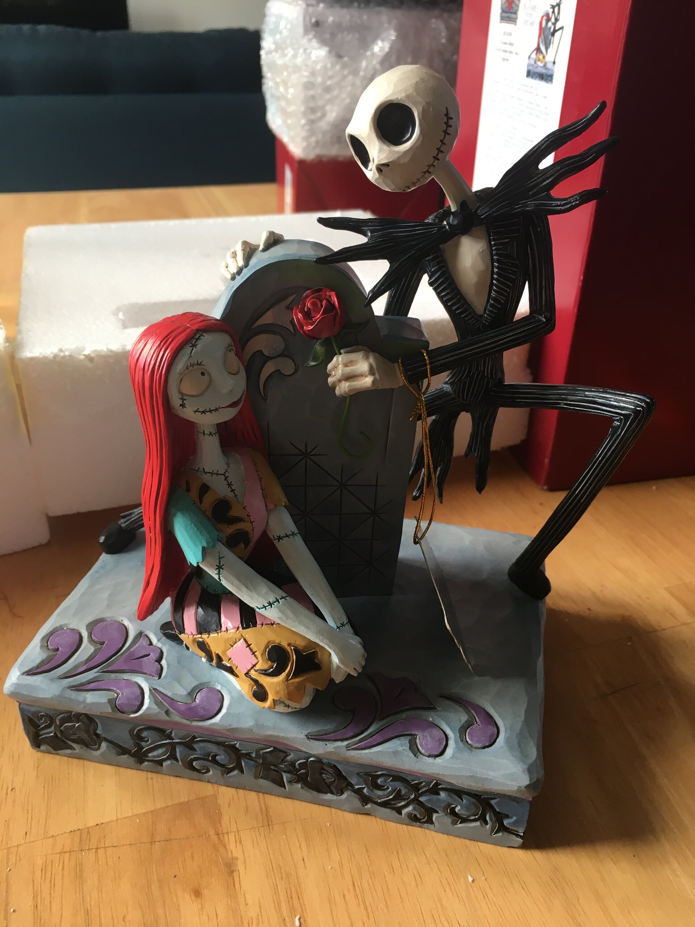 Dans cette magnifique figurine Jim Shore, Jack et Sally, le couple unique de L'étrange Noël de Monsieur Jack, partage un moment de tendresse dans un cimetière. À côté d'une pierre tombale, Jack offre une rose à Sally. Livrée dans un coffret cadeau. Conçue par l'artiste et sculpteur primé Jim Shore pour la marque Disney Traditions. Ces figurines ne sont pas des jouets pour enfants. Destinées aux adultes uniquement.