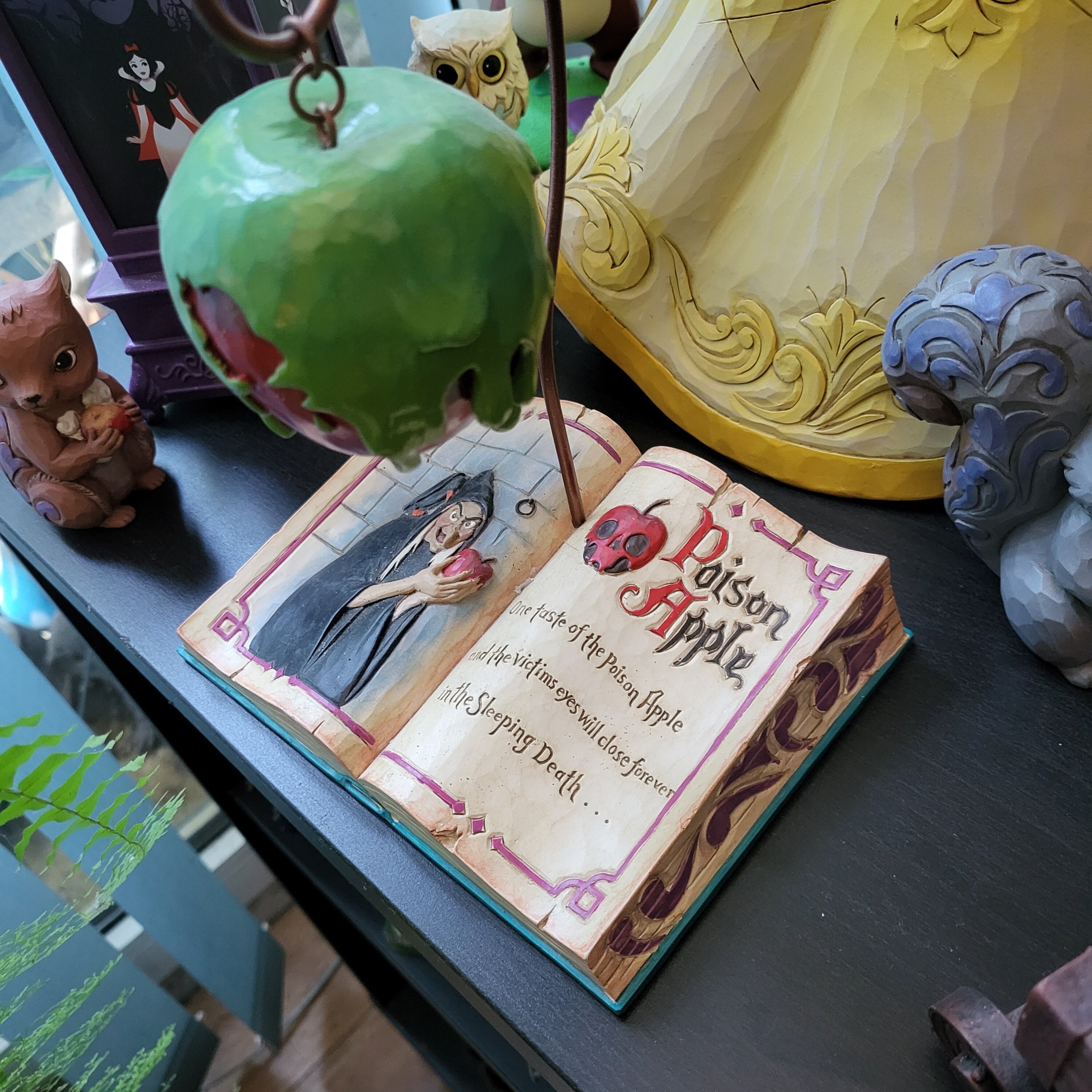 Cette figurine Jim Shore représente le livre de sorts de Blanche-Neige ouvert, révélant une page dédiée à la Pomme Empoisonnée avec une illustration de la Méchante Reine. La pomme est délicatement suspendue à un fil sortant du livre ! Conçue par l'artiste et sculpteur primé Jim Shore pour la marque Disney Traditions. Ces figurines ne sont pas des jouets pour enfants. Destinées aux adultes uniquement.