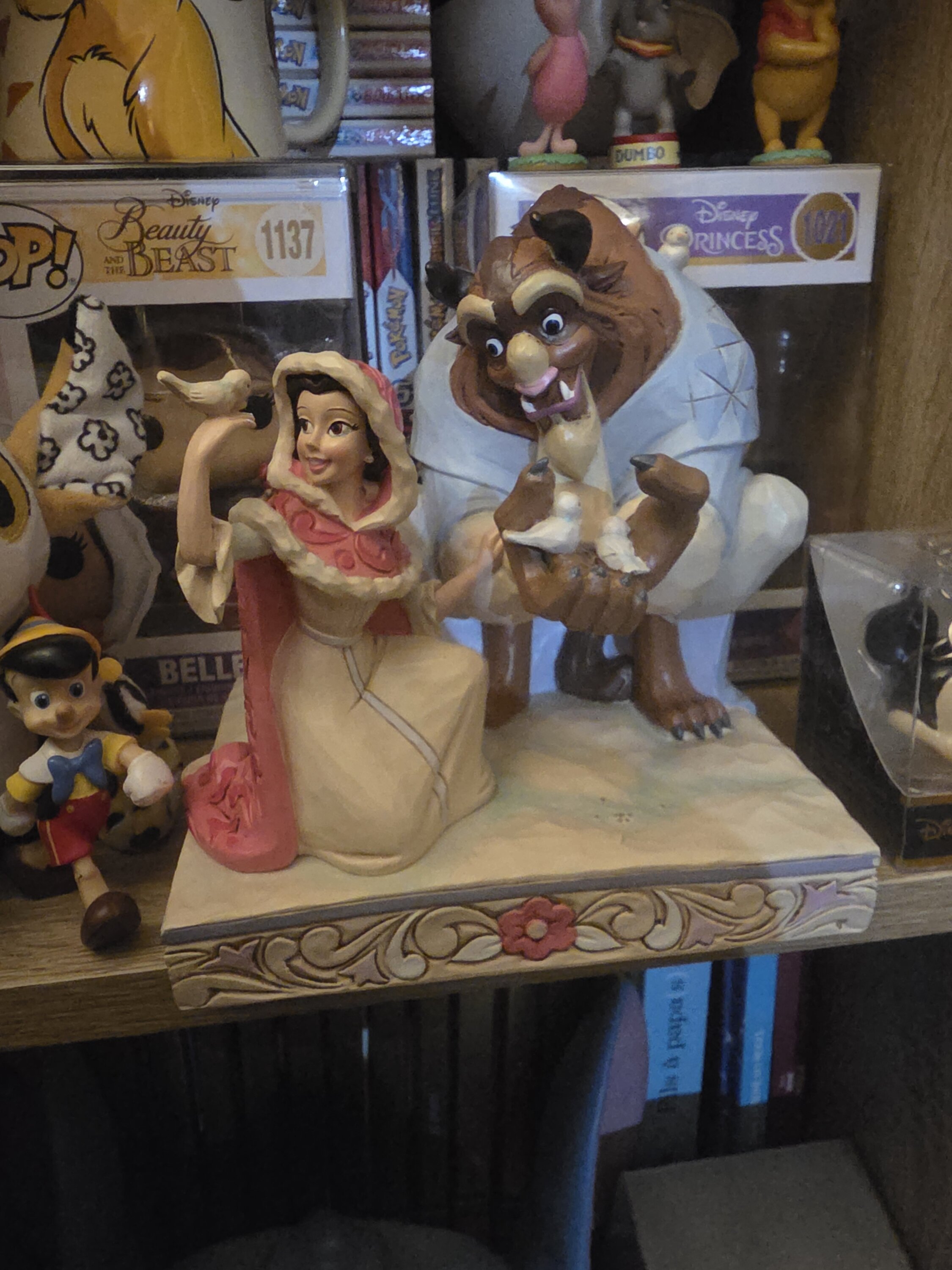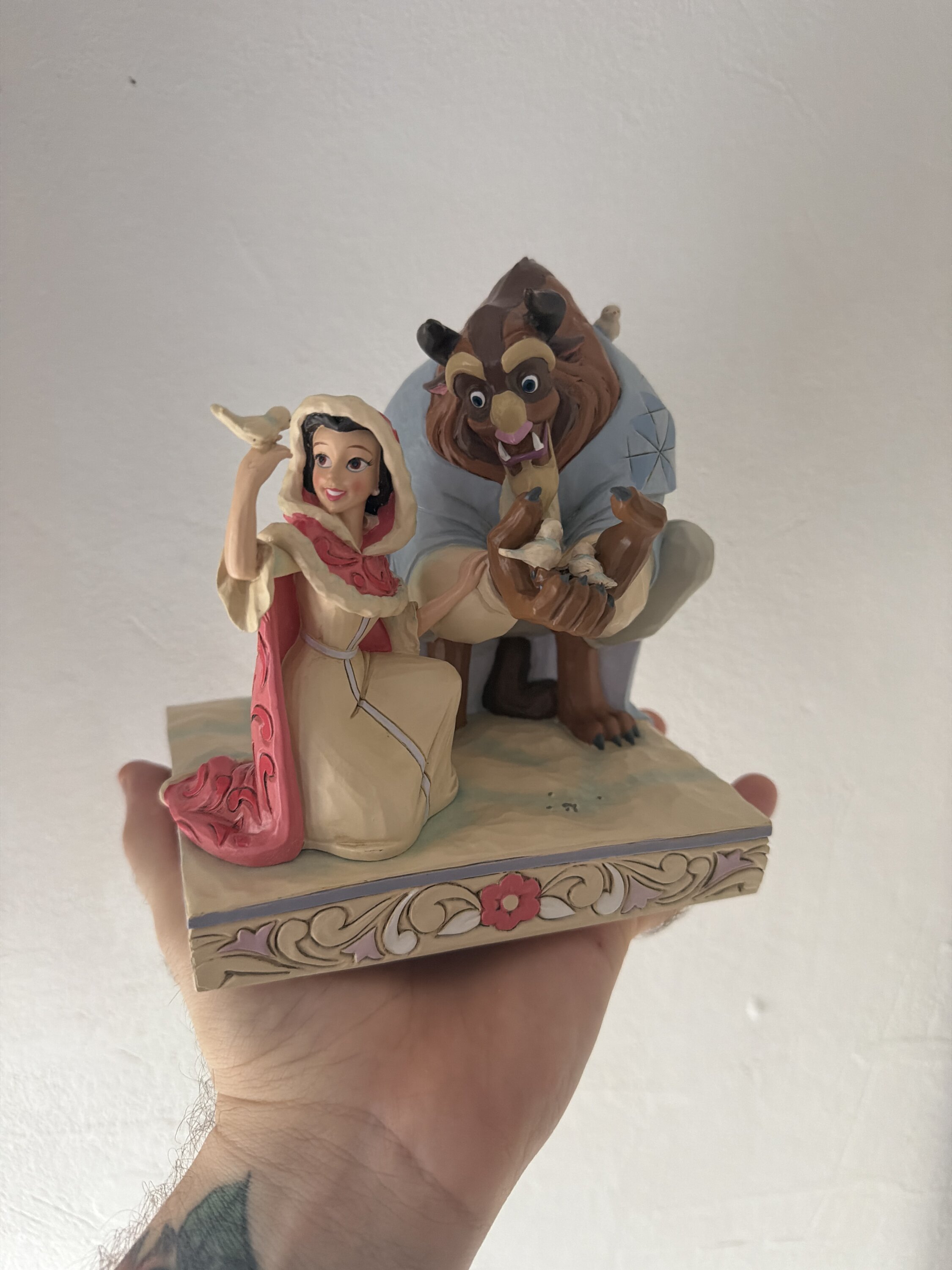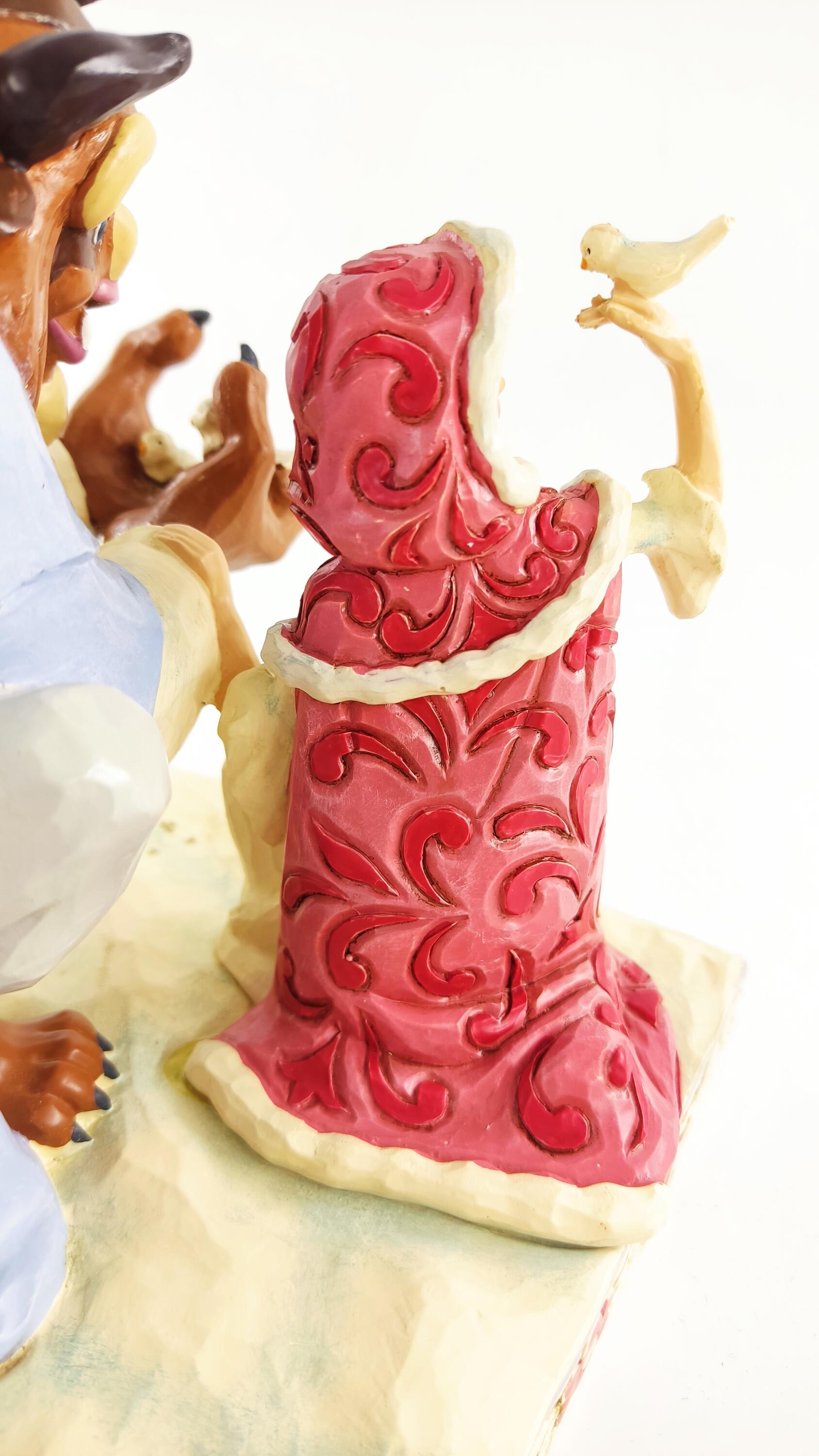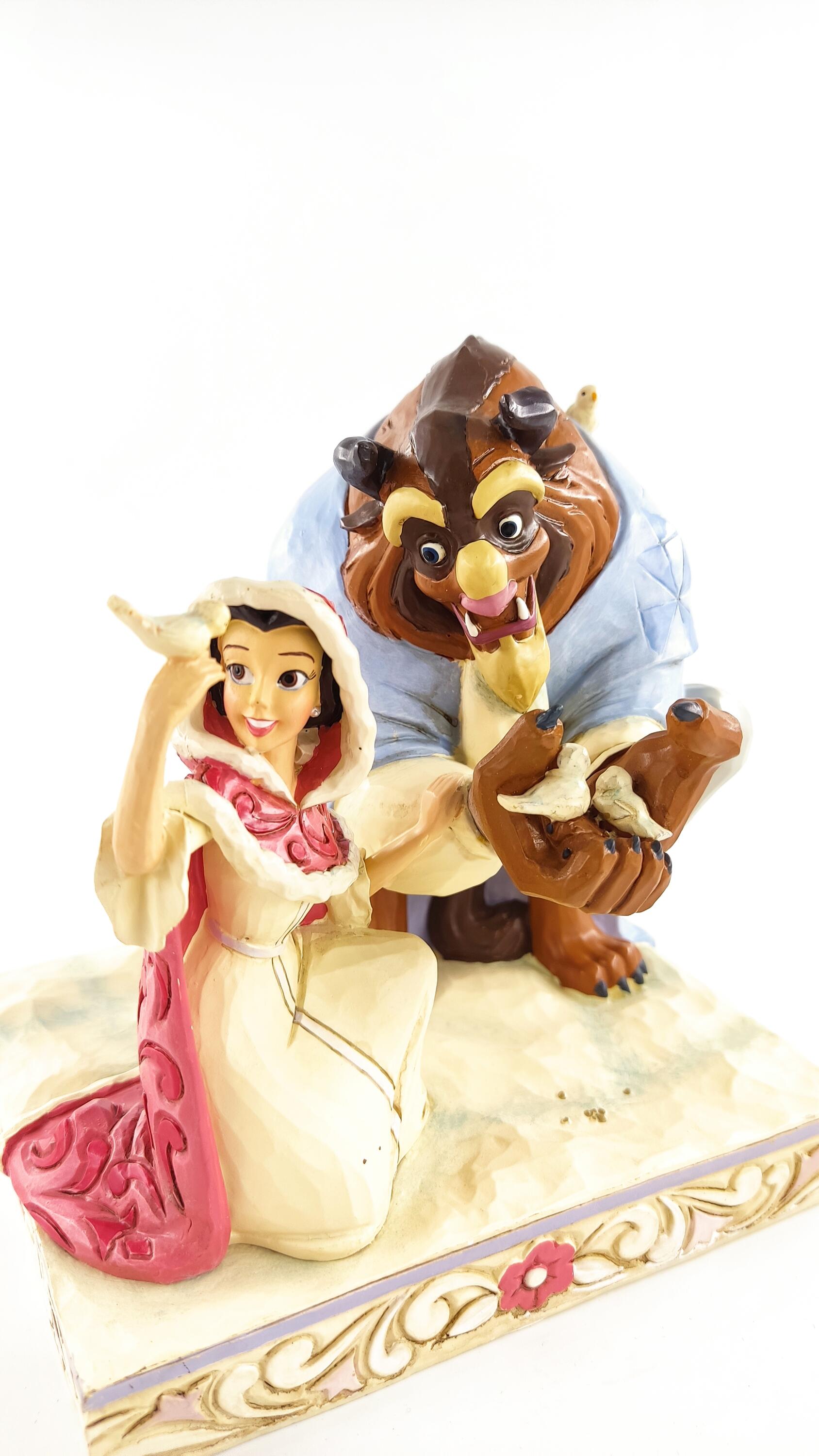 Belle et la Bête partagent un tendre moment hivernal ❄️ entourés d'oiseaux 🕊️ dans cette création réconfortante de Jim Shore . Une scène poétique qui célèbre l'amitié, la gentillesse et la beauté intérieure.