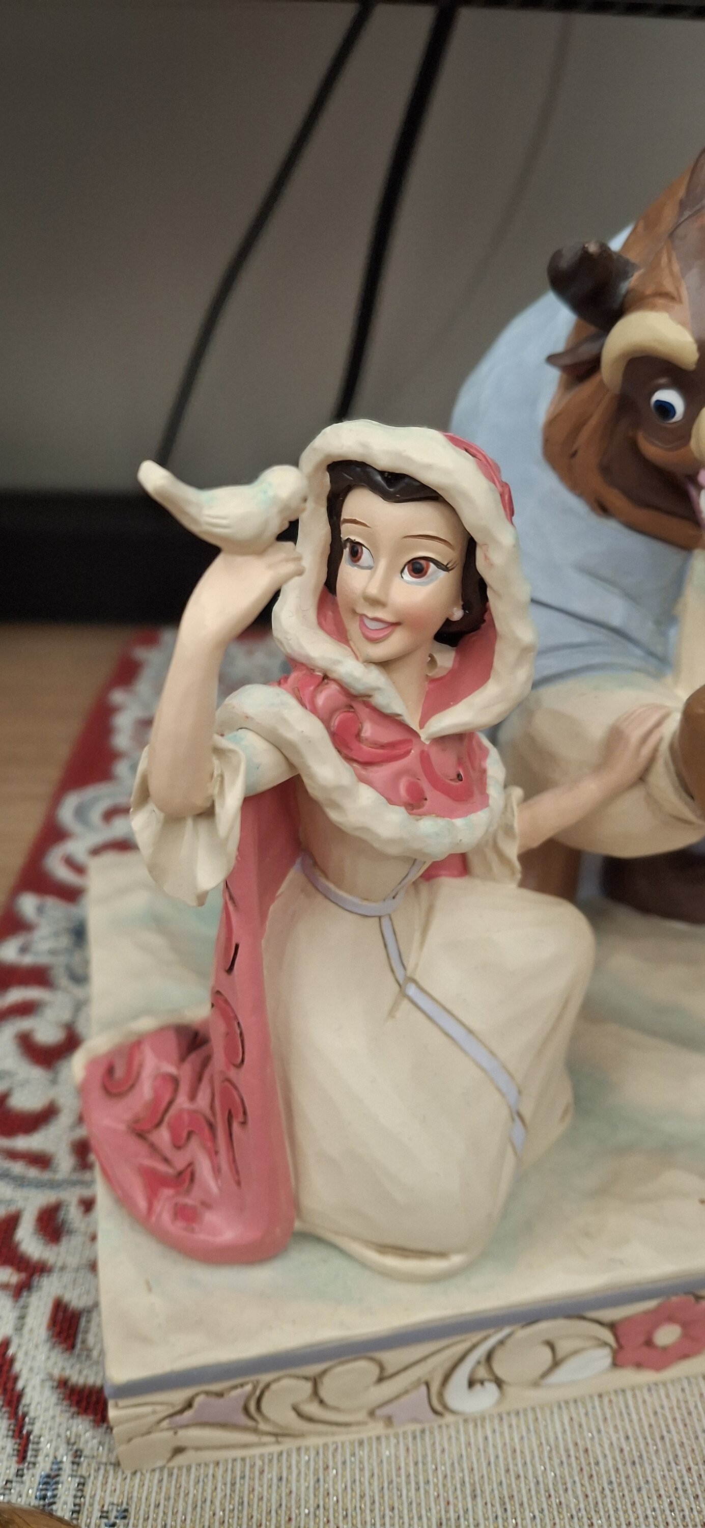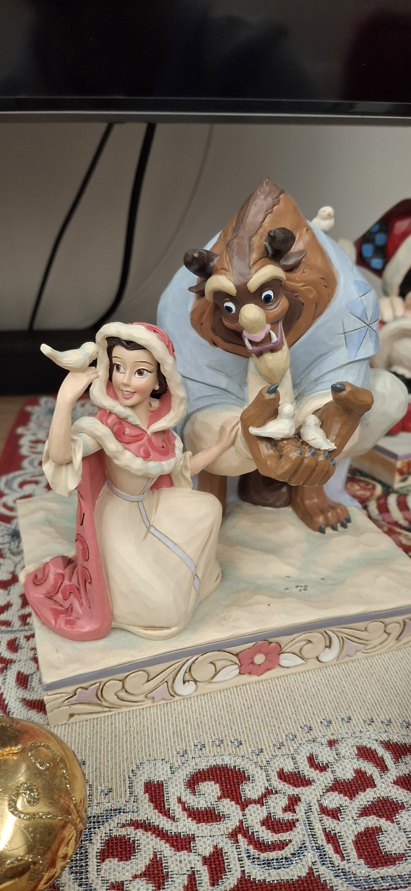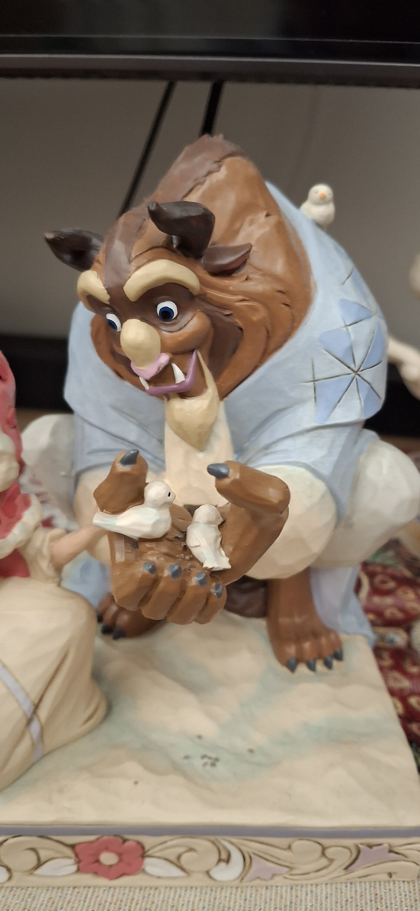 Belle et la Bête partagent un tendre moment hivernal ❄️ entourés d'oiseaux 🕊️ dans cette touchante création de Jim Shore . Une scène poétique qui célèbre l'amitié, la bonté et la beauté intérieure.