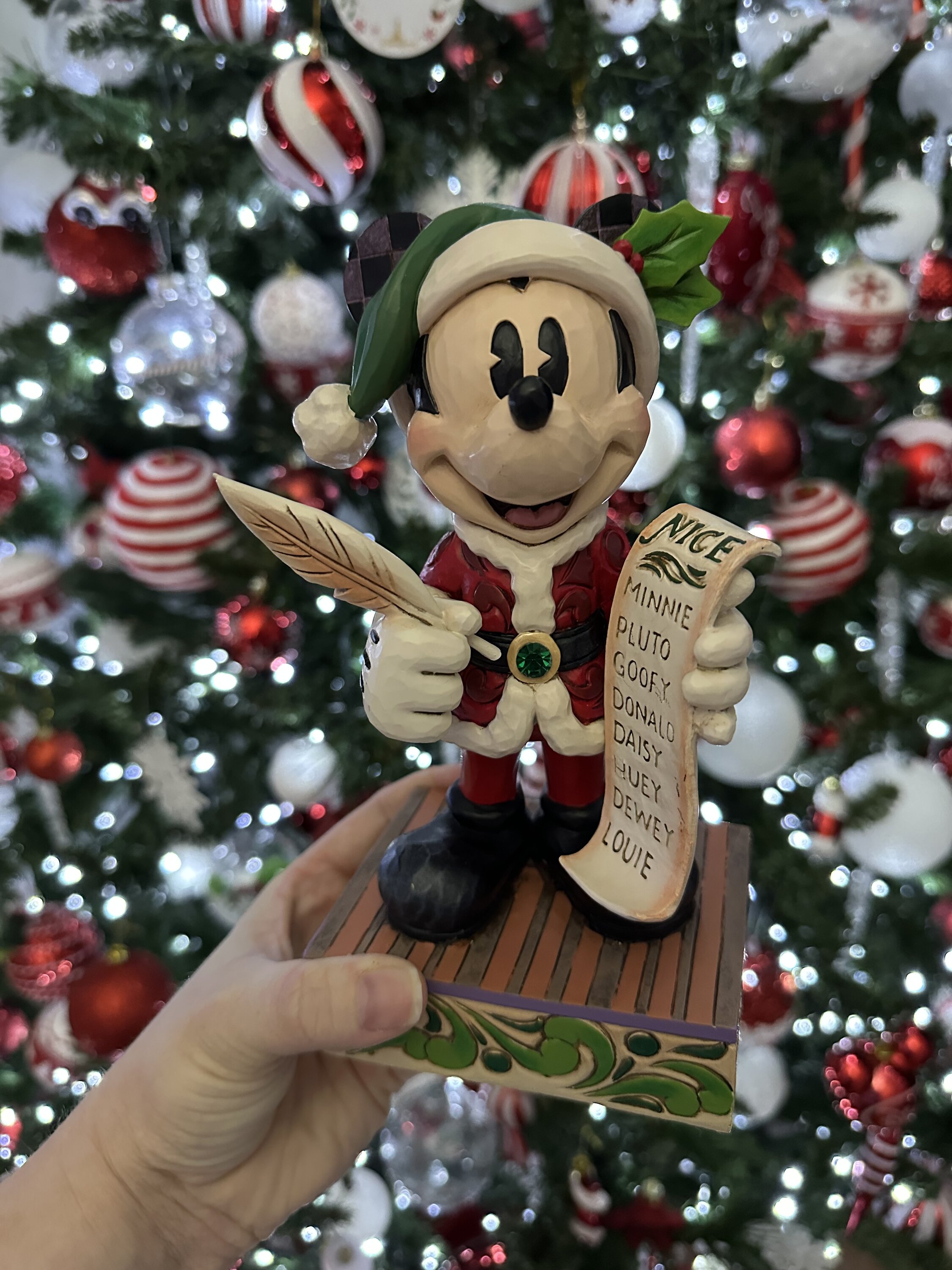 Dans cette scène de Noël enchanteresse de Jim Shore, Mickey Mouse porte un costume de rosemaling rouge frappant accentué d'une ceinture verte ornée de bijoux et d'un chapeau de Père Noël garni de houx. Il tient une plume et une liste de personnages Disney méchants et gentils avec un sourire.