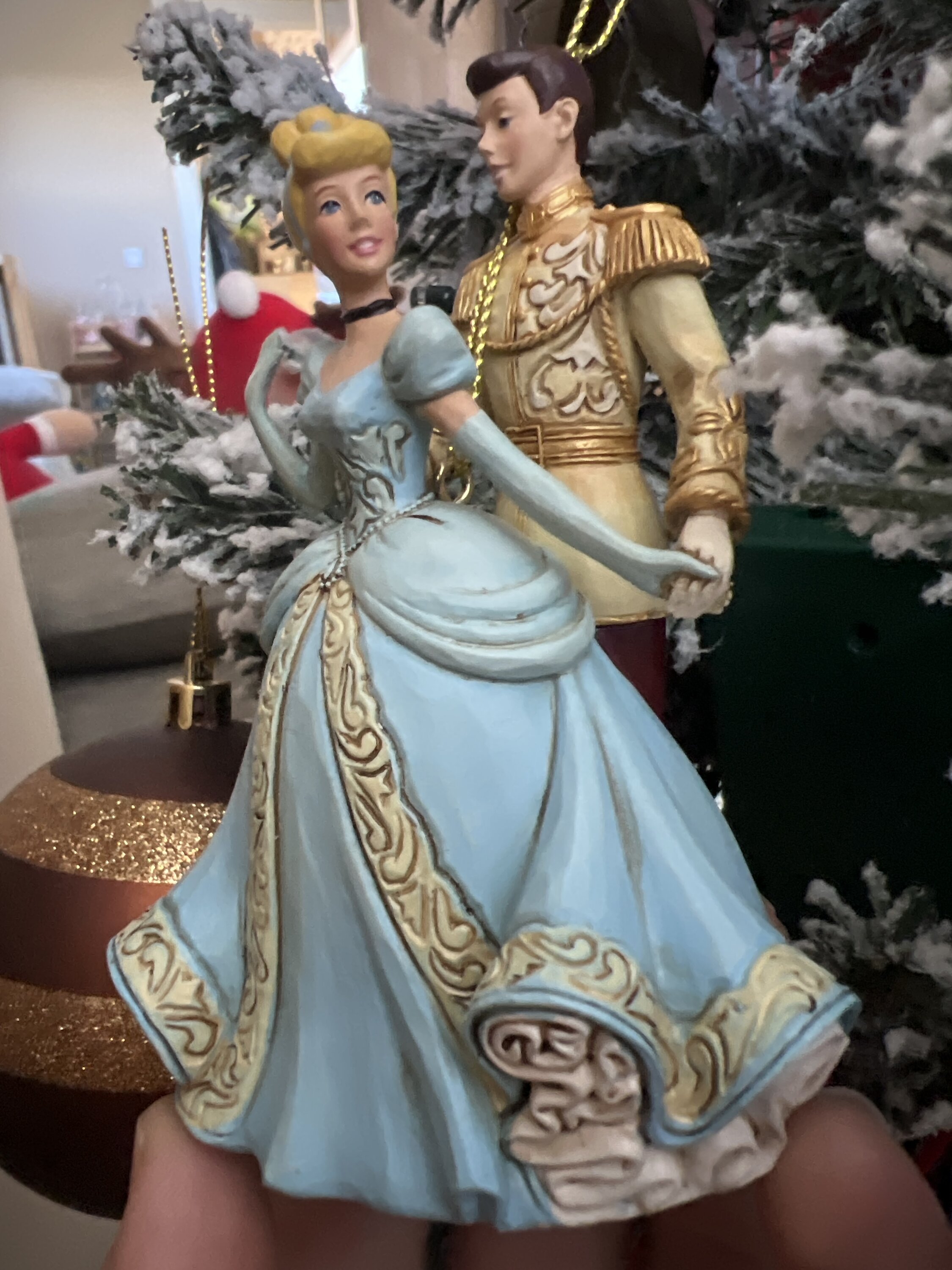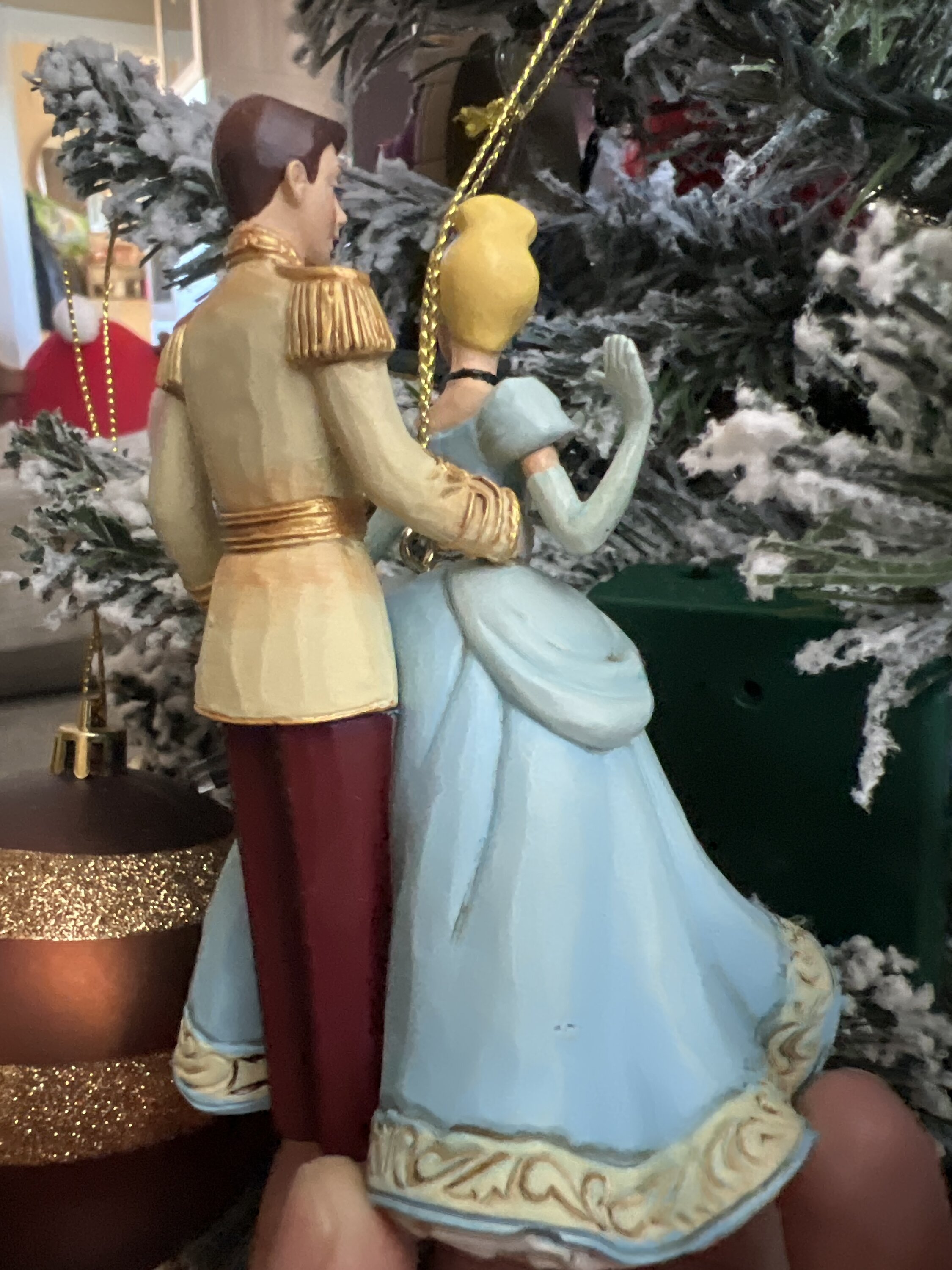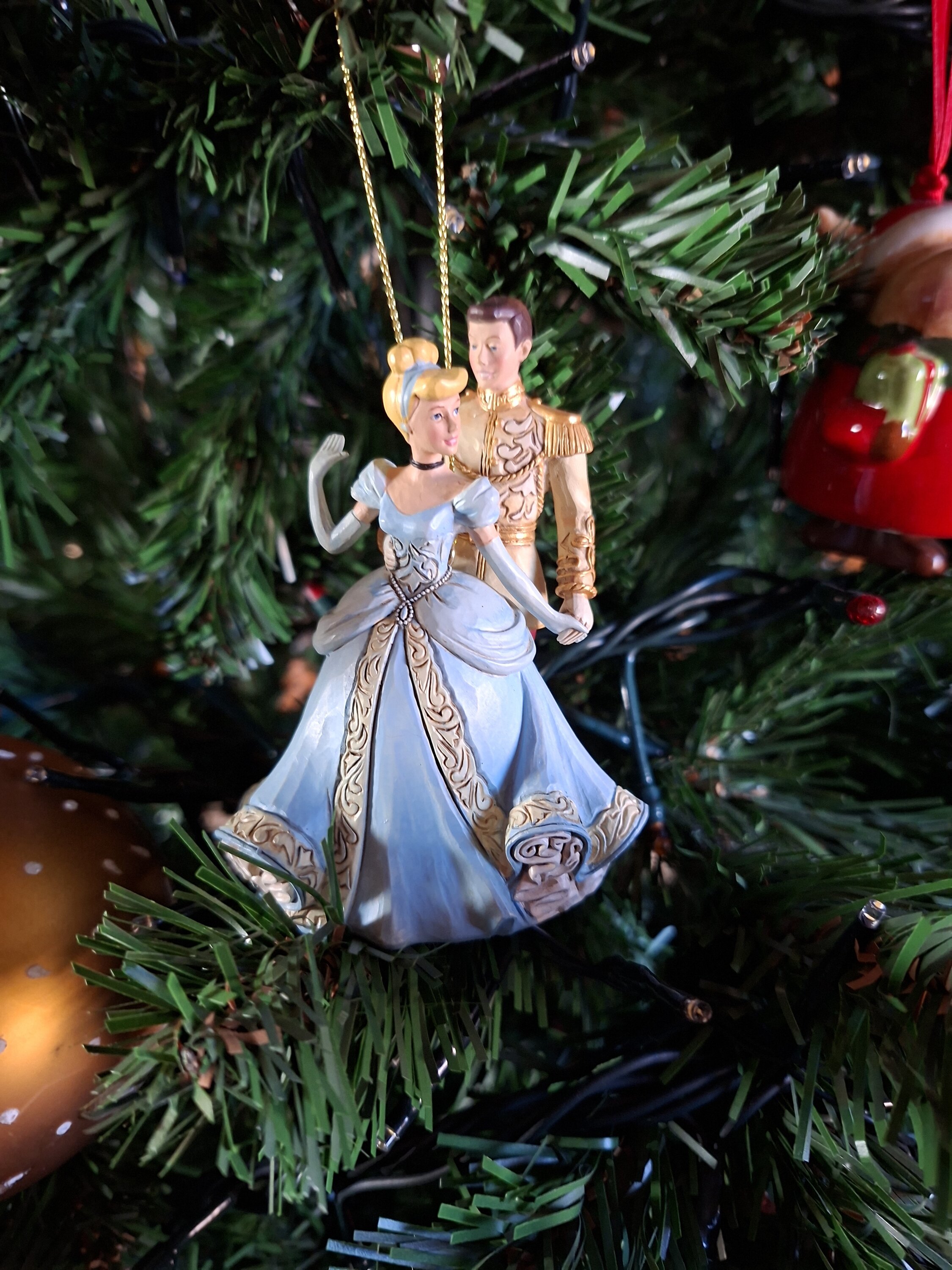 Cendrillon et le Prince : plus beaux en vrai qu'en photo. Bien que la figurine soit conçue pour être suspendue, je l'ai adorée car elle peut être posée sur une surface sans tomber.