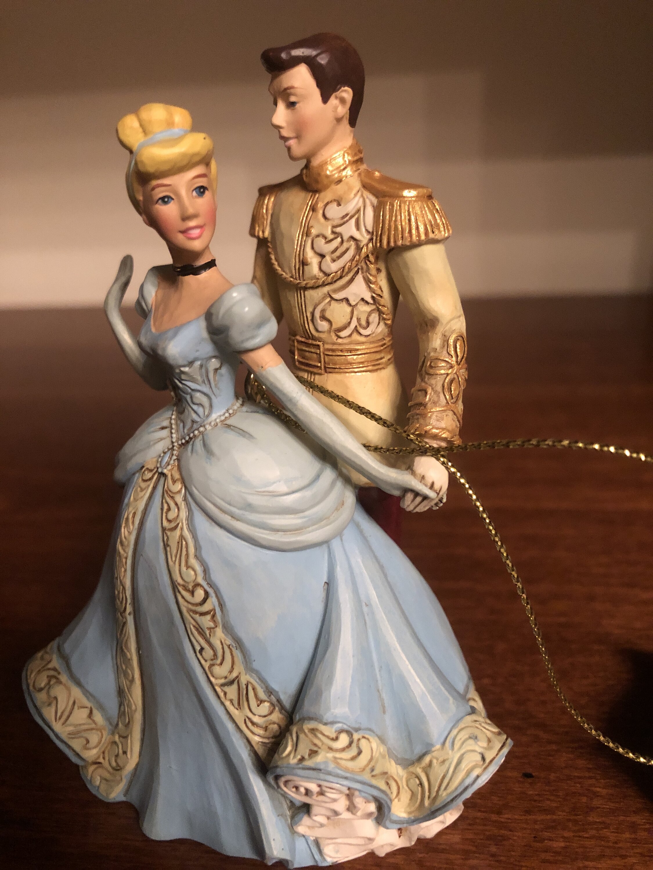 Cendrillon et le Prince : plus beaux en vrai qu'en photo. Bien que la figurine soit conçue pour être suspendue, je l'ai adorée car elle peut être posée sur une surface sans tomber.