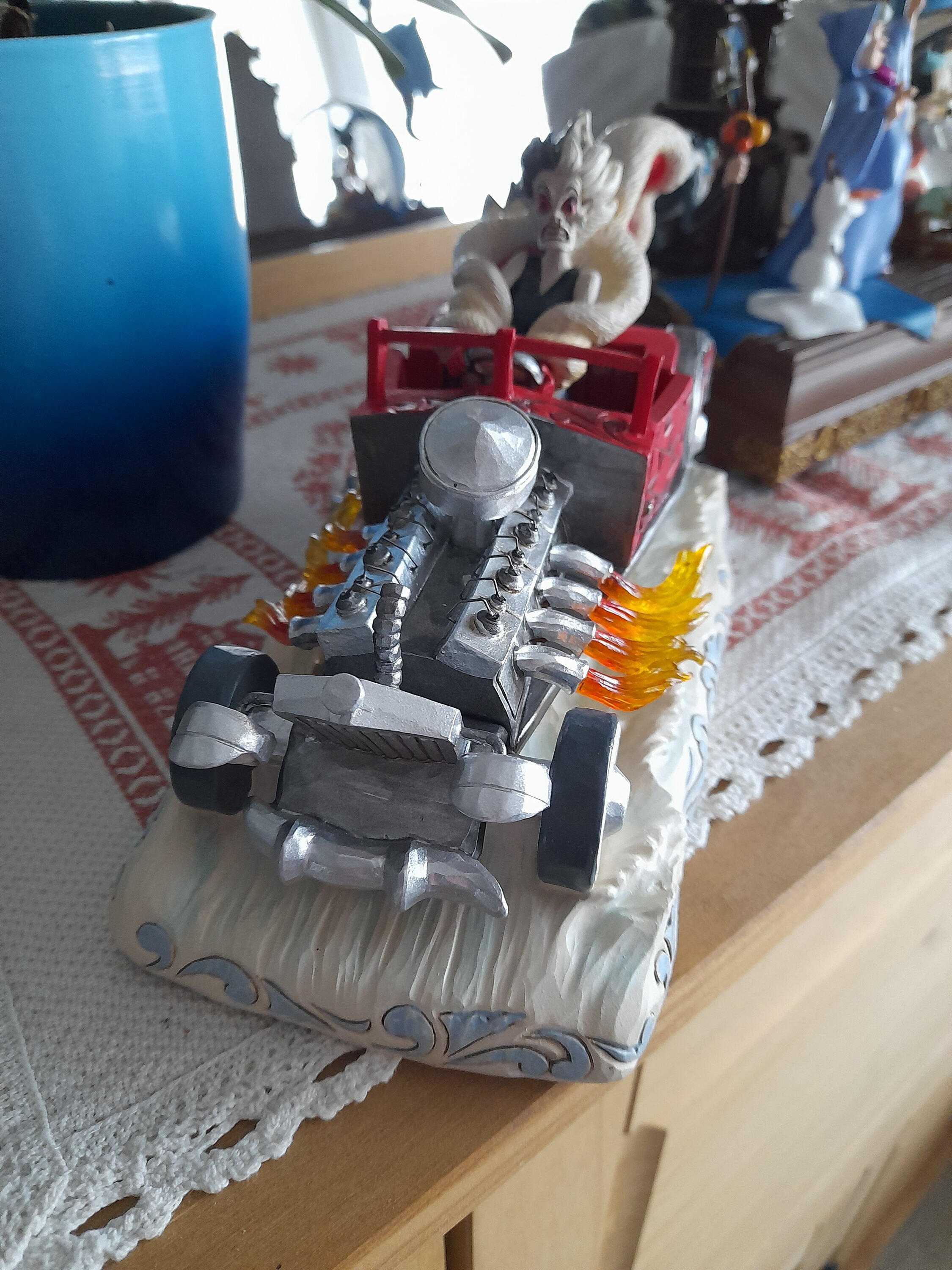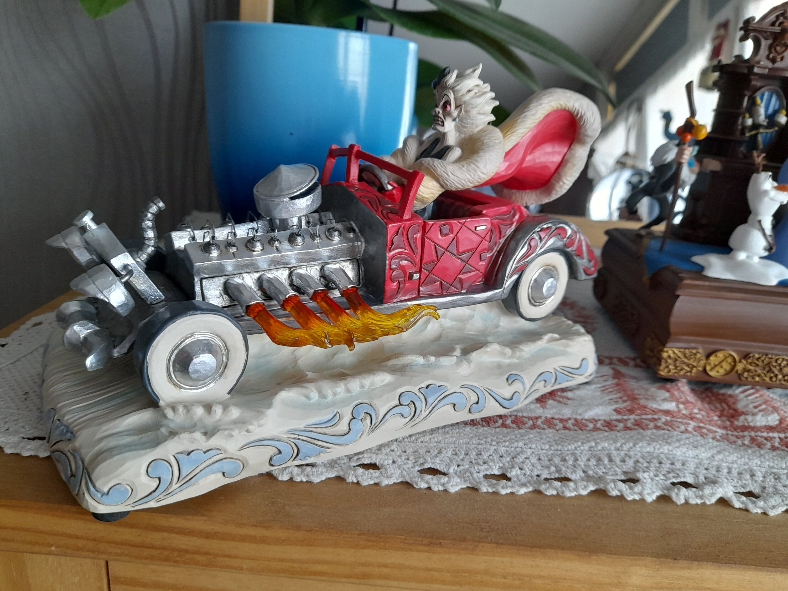 Pour célébrer le 65e anniversaire des 101 Dalmatiens, Jim Shore immortalise Cruella d'Enfer fonçant à toute allure dans sa voiture rouge ornée de roses et de patchwork. Des flammes jaillissent du moteur tandis que sa chevelure et son manteau de fourrure volent au rythme de sa mélodie emblématique.