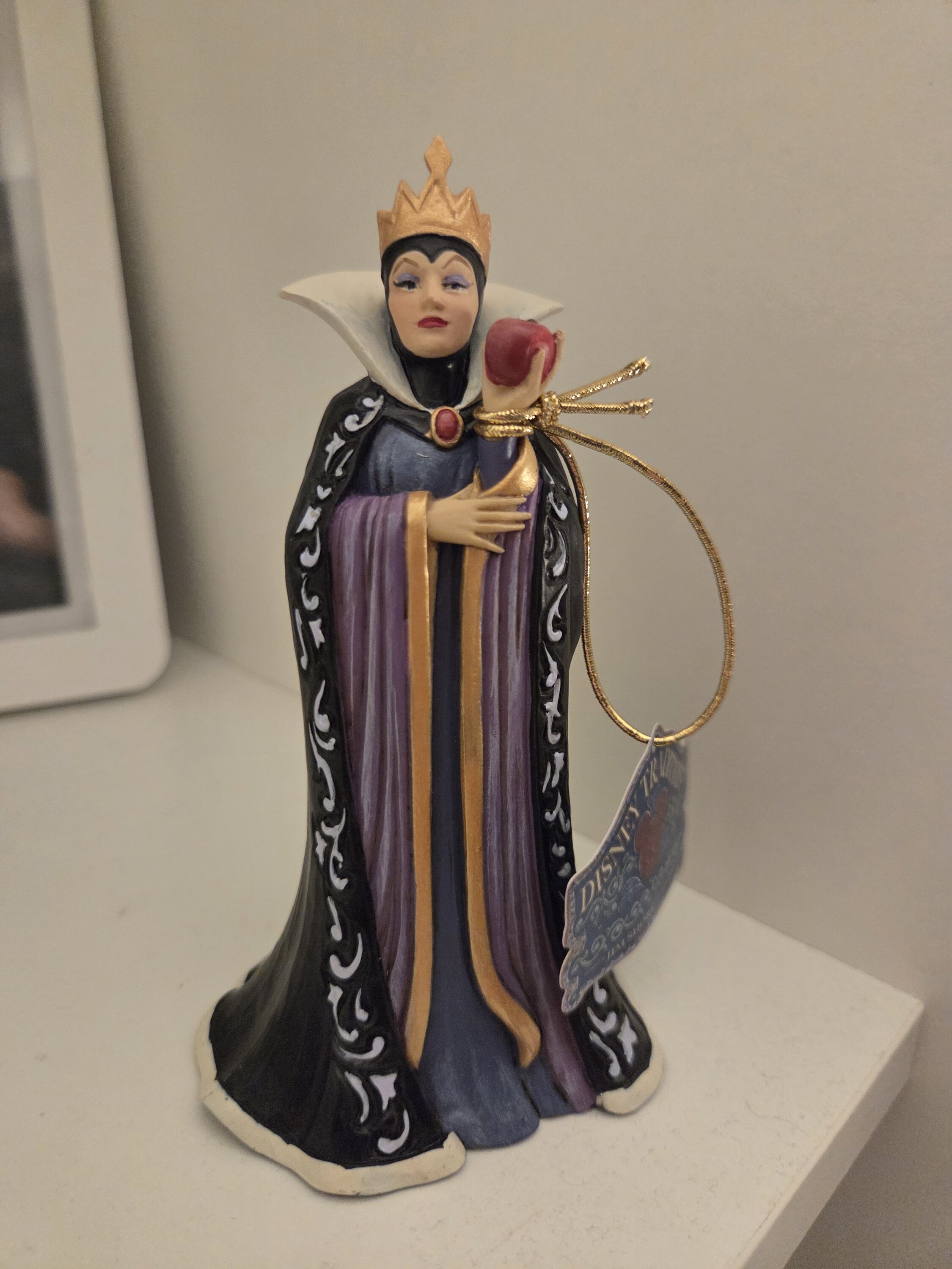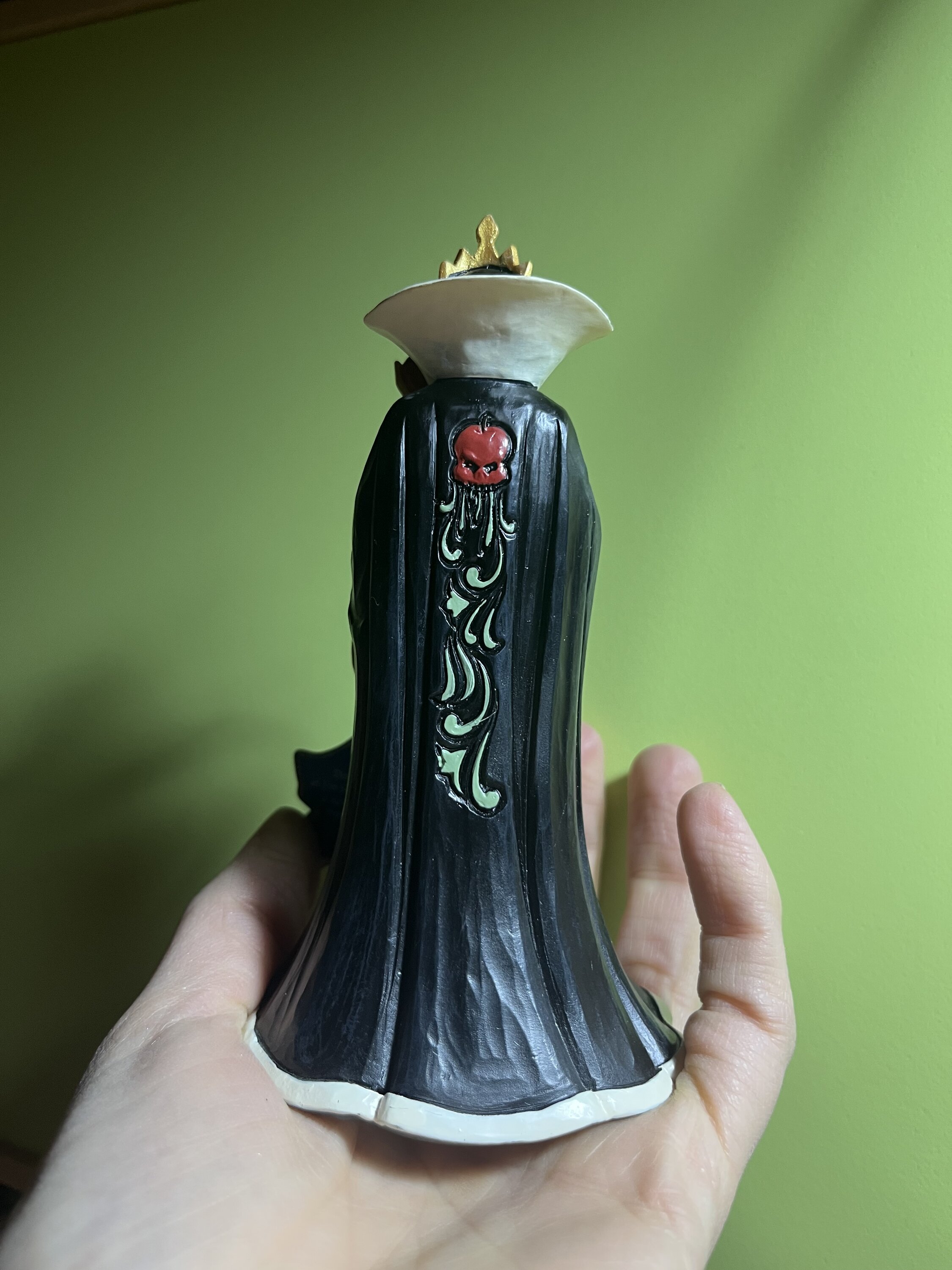 La Reine, Grimhilde, porte une robe noire et violette saisissante, ornée des motifs de rosemaling et de courtepointe emblématiques de Jim Shore. Tenant une pomme empoisonnée destinée à Blanche-neige, son cœur jaloux nourrit ses sombres intentions tandis qu'elle prépare son prochain coup.