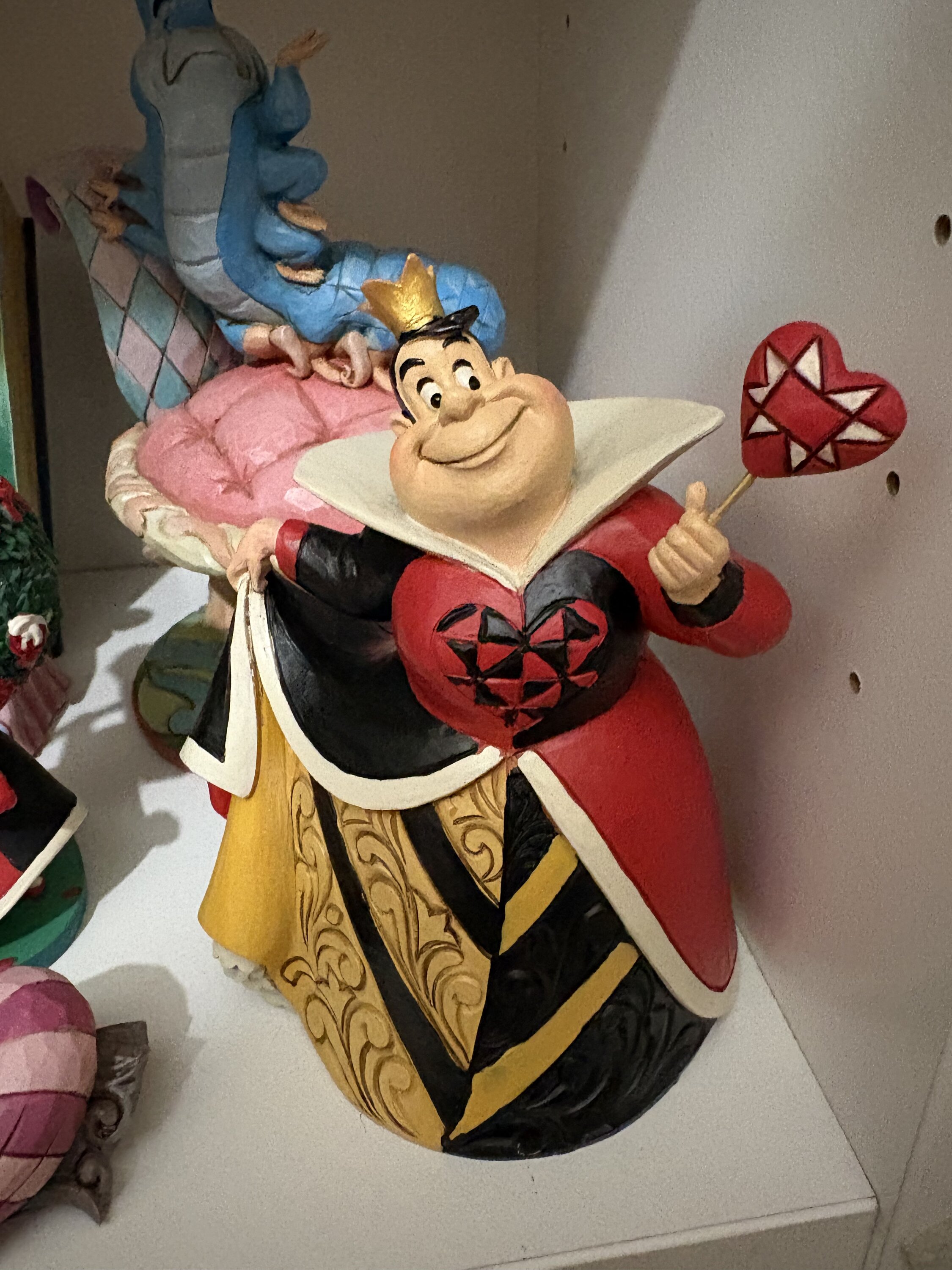 Cette création Jim Shore représente la Reine de Cœur du Pays des Merveilles dans une robe rouge et noire rehaussée de rosemaling et d'un cœur matelassé. Peu soucieuse des autres, elle se pavane avec assurance, un sourire écœurant aux lèvres, prête à crier : « À bas les têtes ! »