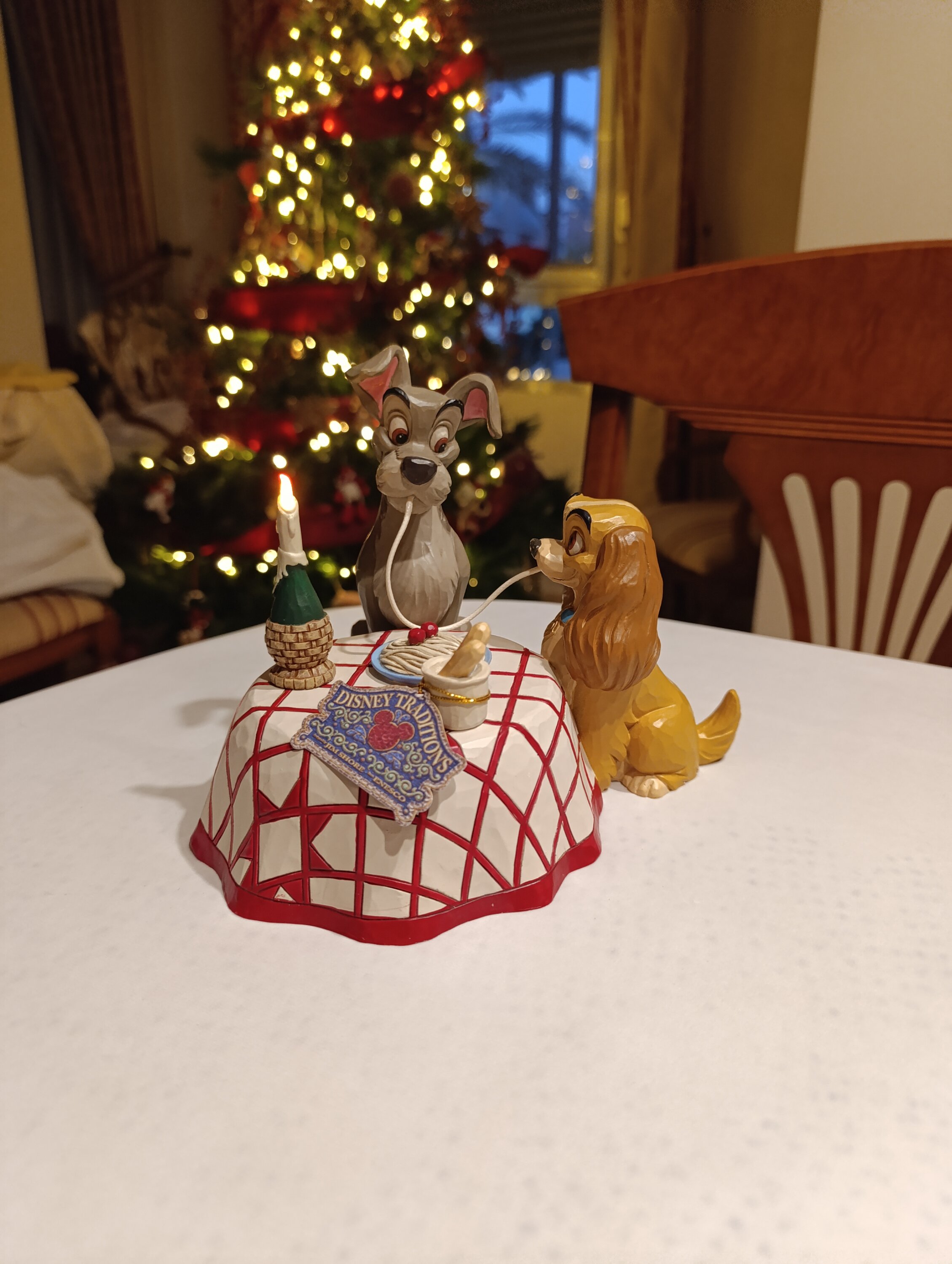 Je suis un grand fan des films Disney dont je collectionne les figurines, en particulier celles réalisée par l'artiste Jim Shore. La statuette représente la plus célèbre scène d'anthologie du film celle où Belle et le Clochard mangent un plat de spaghettis en se regardant timidement et tendrement à la fois. Quel spectateur ne fredonne pas à la fin du film la célèbre chanson romantique que le patron du restaurant italien chante accompagné de son accordéon. N'osant se regarder dans les yeux les deux amoureux mangent le même spaghetti sans s'en apercevoir le tout se terminant par un baiser. Une célèbre scène donc que tout collectionneur de figurines Disney désire avoir dans sa collection. L'objet est bien réalisé même s'il manque un peu de finesse à mon goût. La diamètre de la table est bizarrement un peu trop large par rapport aux personnages. Peut-être, et l'idée est bonne, pour pouvoir loger la pile qui permet à la flamme de la bougie de s'allumer. Je suis donc dans l'ensemble satisfait de cette sympathique figurine qui vient compléter ma collection Disney.