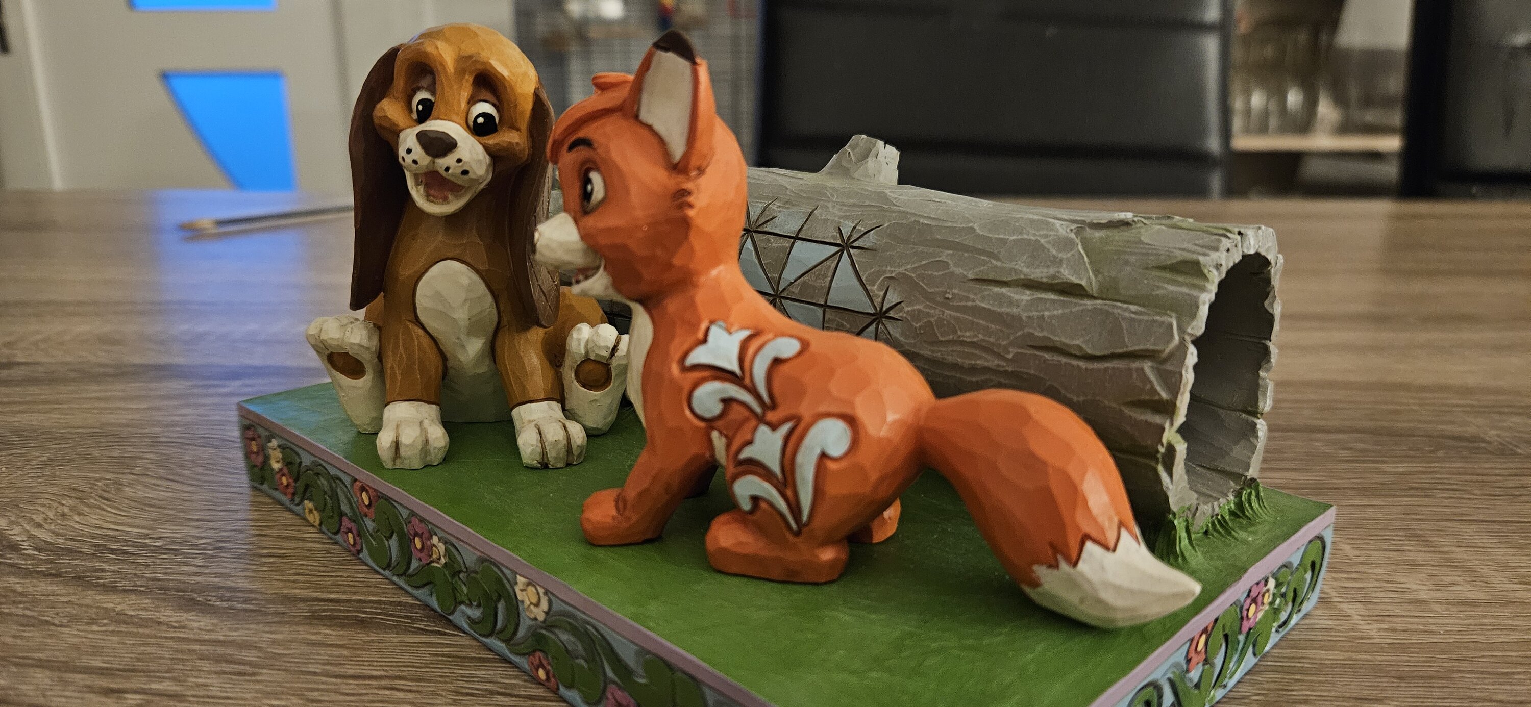 Célébrez l'amitié improbable entre Rox et Rouky dans cette charmante scène de Jim Shore . Tandis qu'ils jouent dans les bois, les motifs emblématiques de Jim Shore, les motifs patchwork et les détails floraux donnent vie à cette scène vibrante.