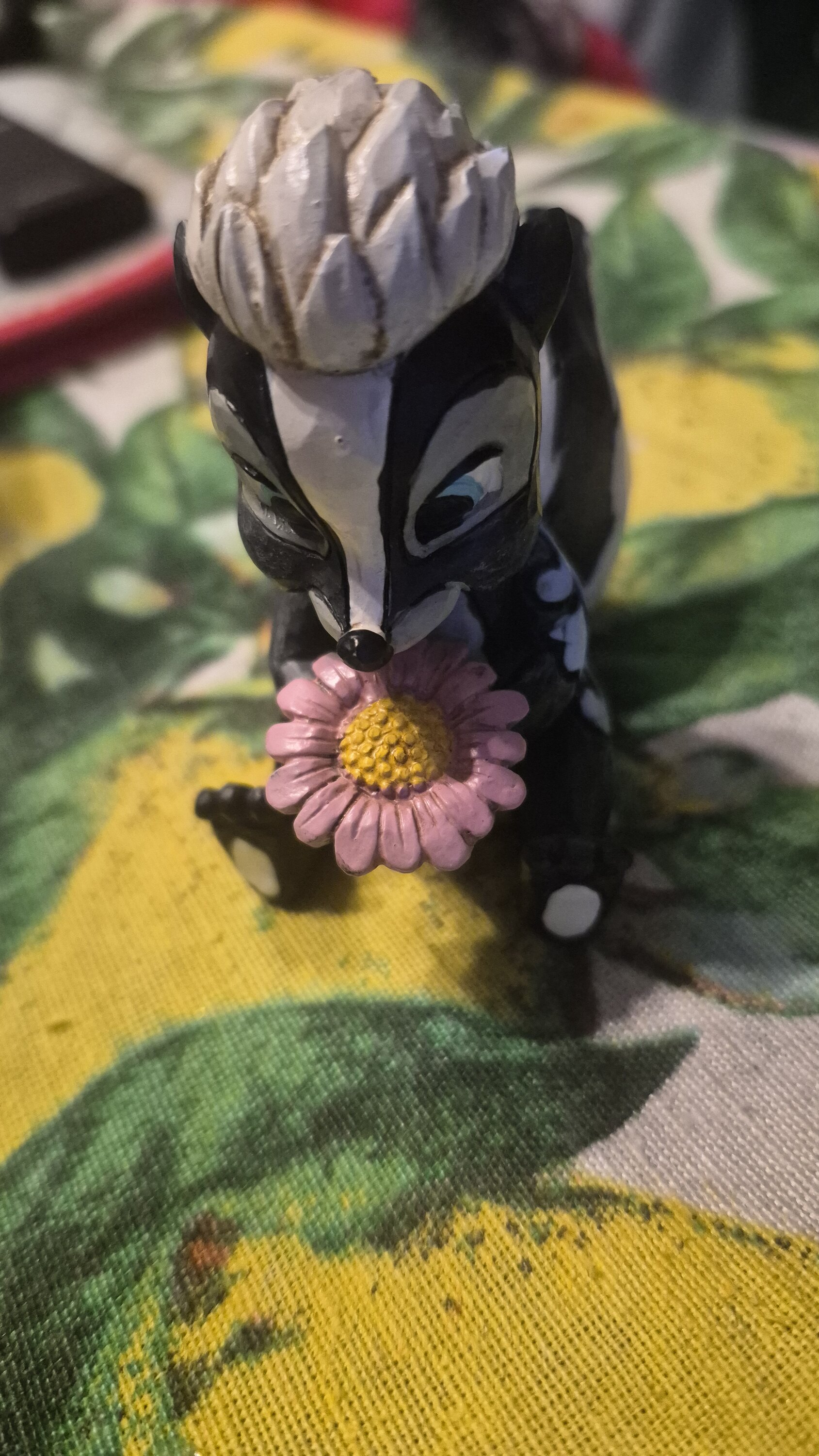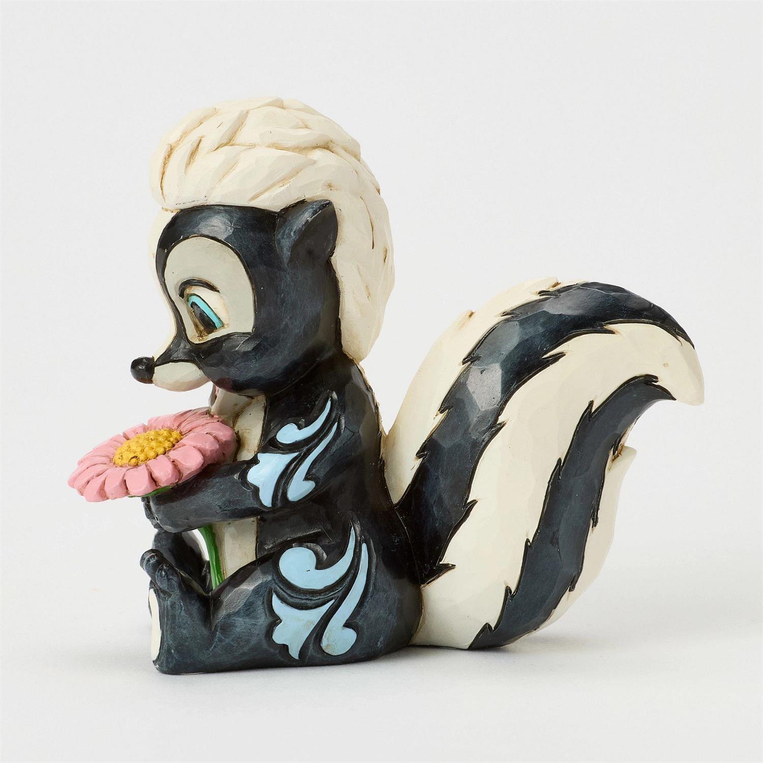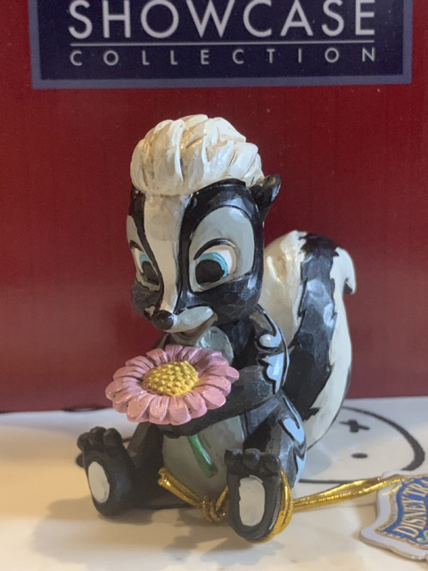 Cette adorable miniature de Jim Shore représente Flower, la mouffette de Bambi, parée d'un magnifique rosemaling et tenant une poignée de fleurs fraîches. Avec son sourire éclatant et son amour enfantin, elle rayonne de douceur et de charme.