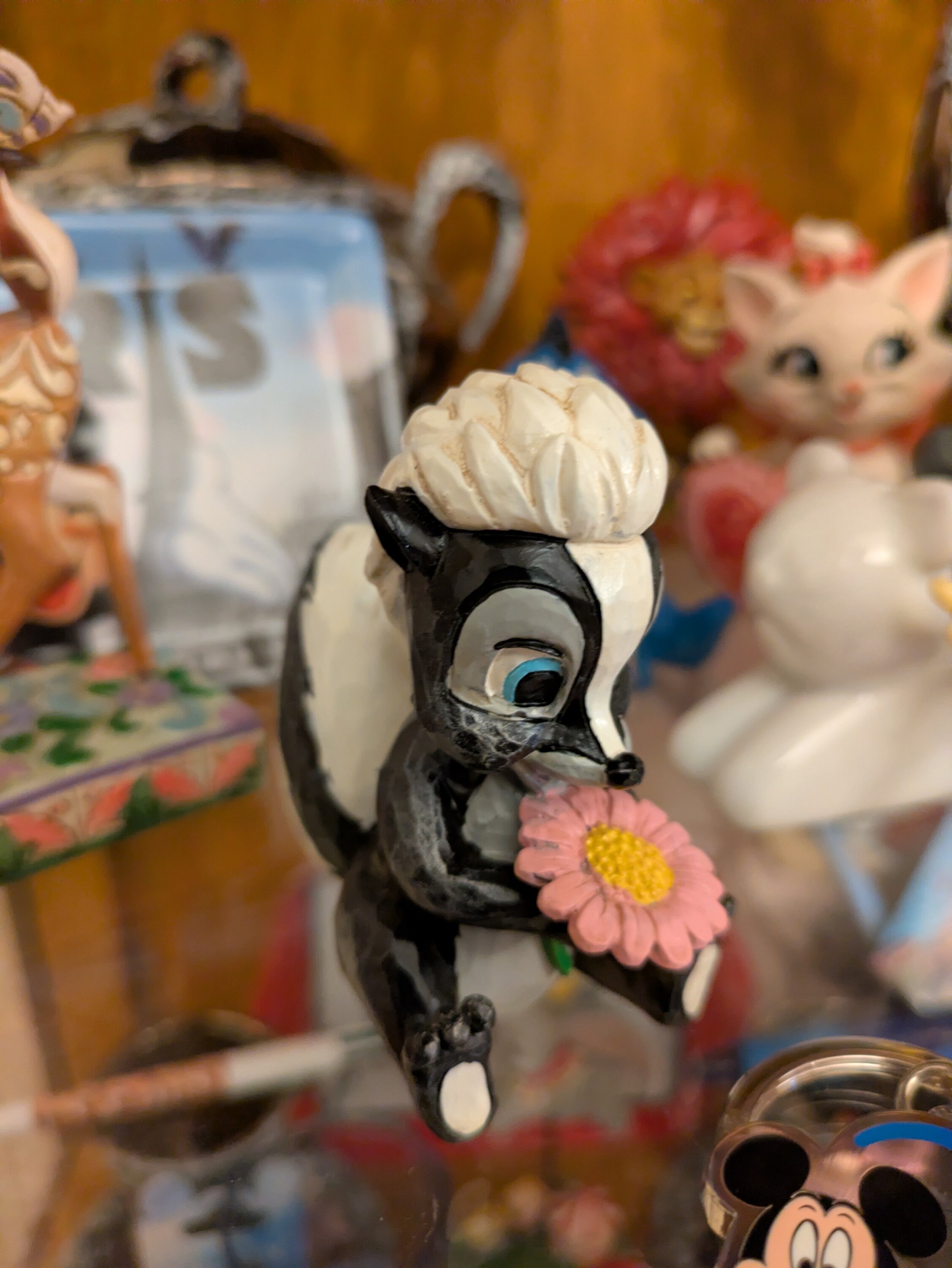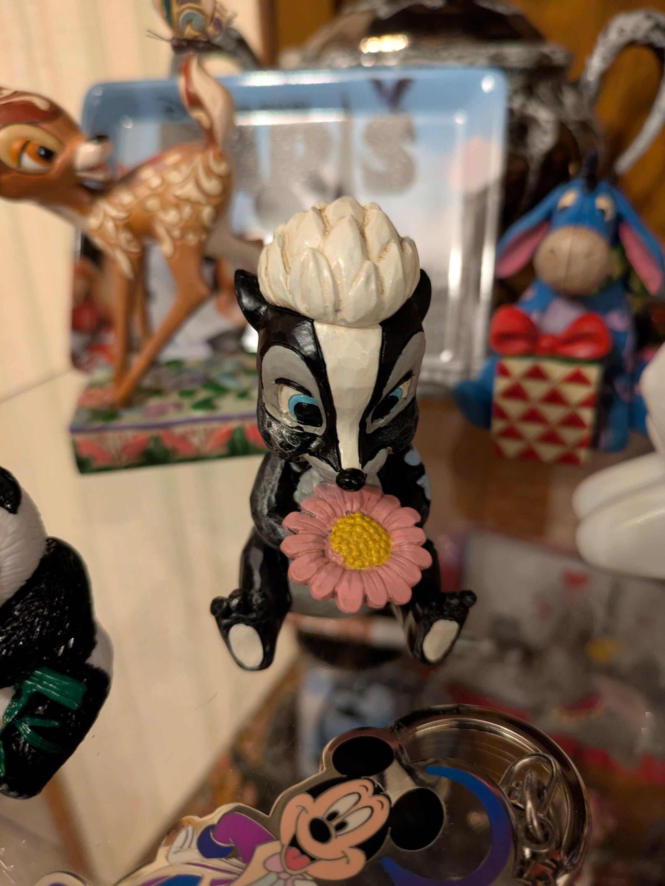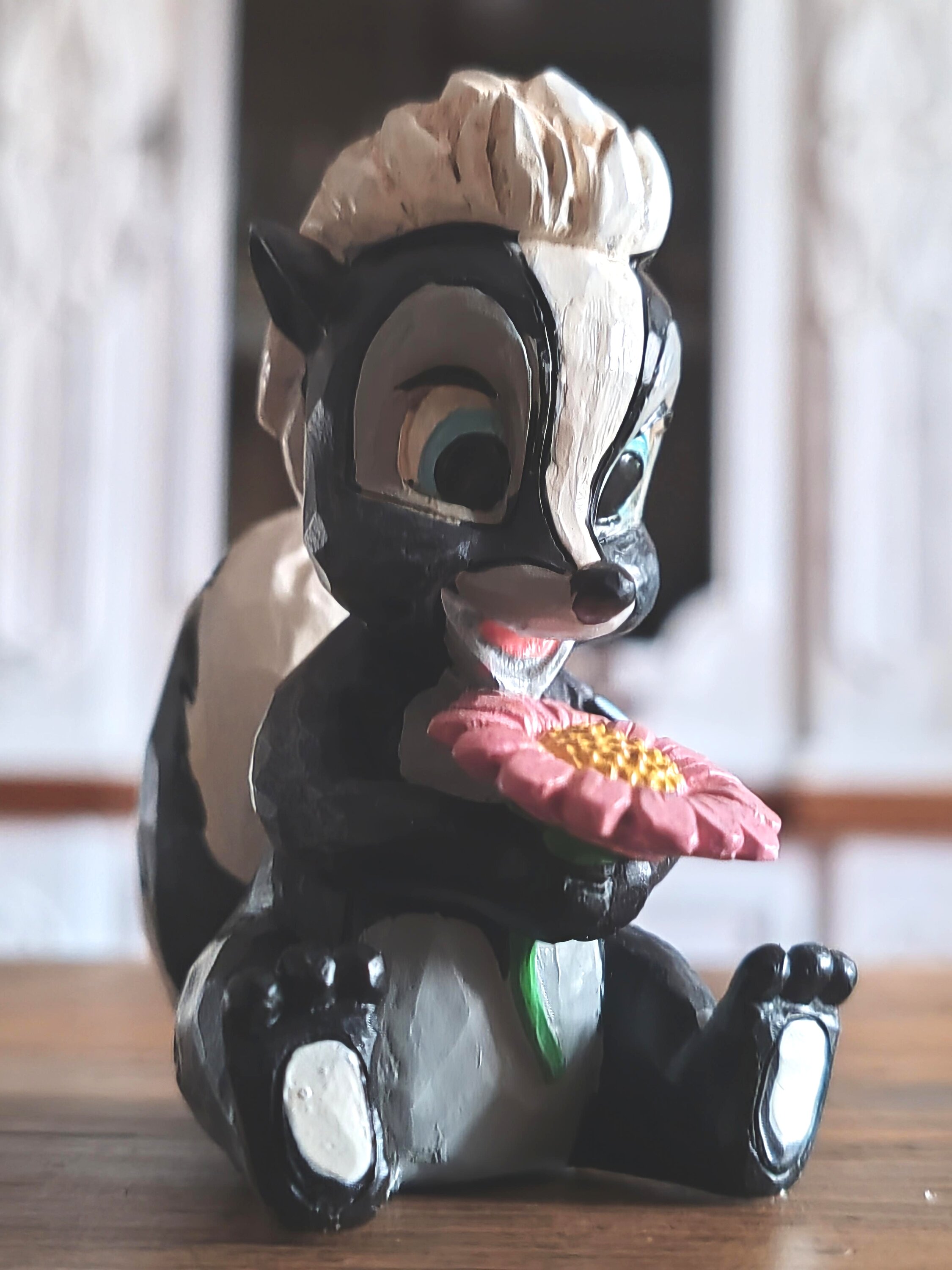 Cette adorable miniature de Jim Shore représente Flower, la mouffette de Bambi, parée d'un magnifique rosemaling et tenant une poignée de fleurs fraîches. Avec son sourire éclatant et son amour enfantin, elle rayonne de douceur et de charme.