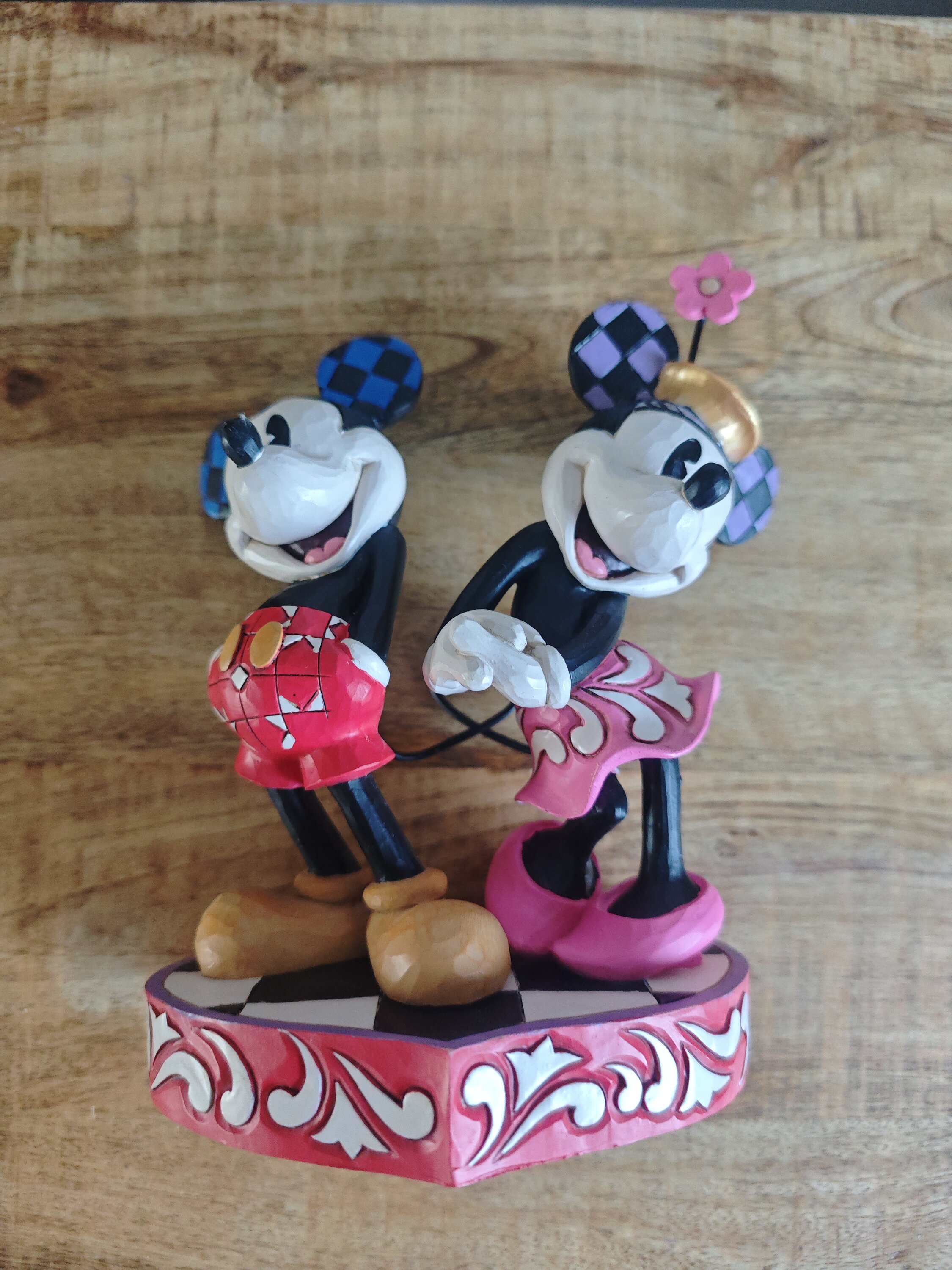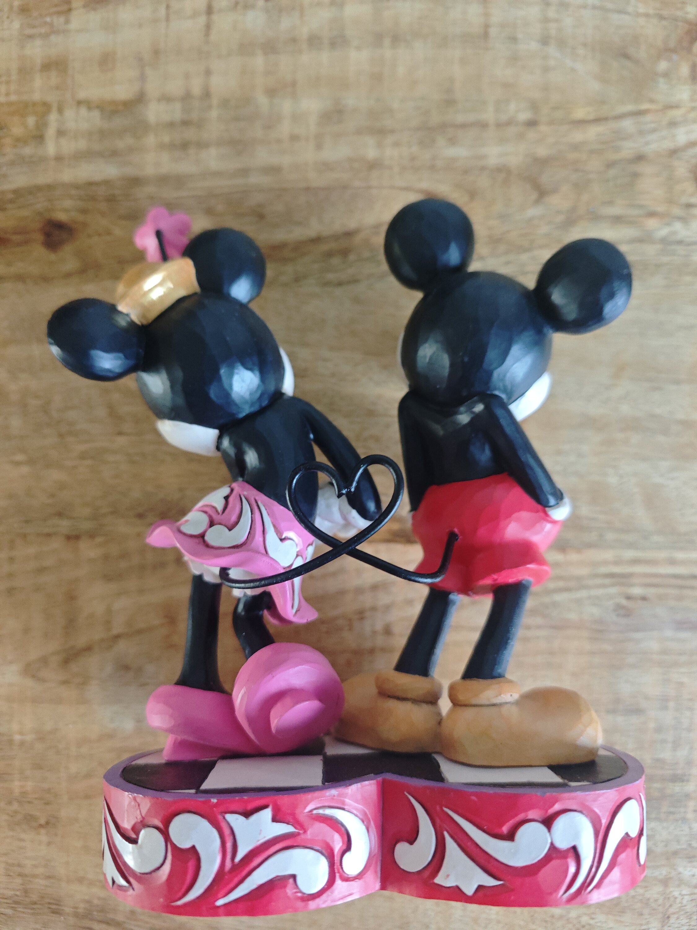 Cette création romantique de Jim Shore met en scène Mickey et Minnie, vêtus des motifs roses et patchwork caractéristiques de l'artiste. Réunis avec tendresse sur un socle en forme de cœur, ils rayonnent de douceur et incarnent à merveille la Hauteur de leur amour éternel.