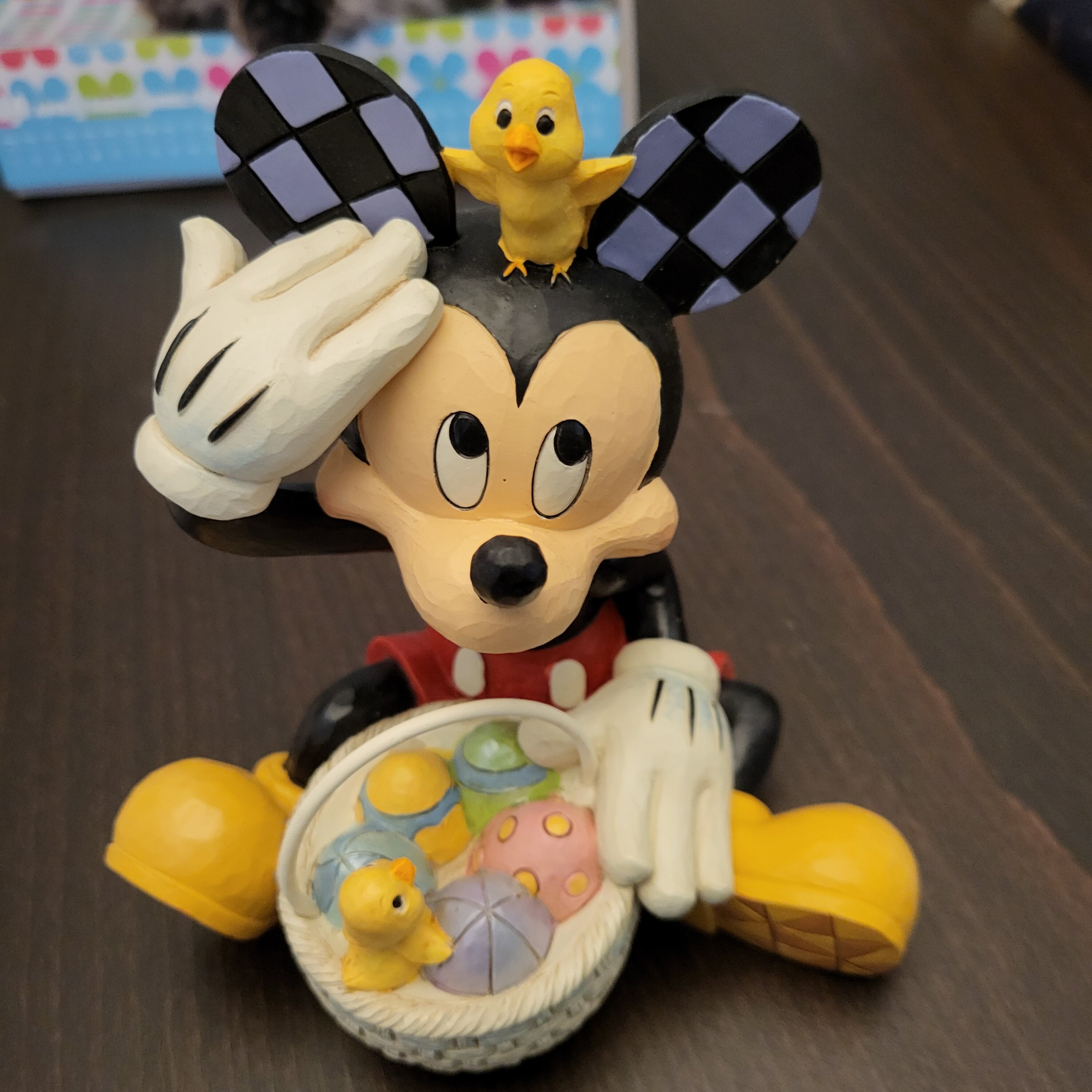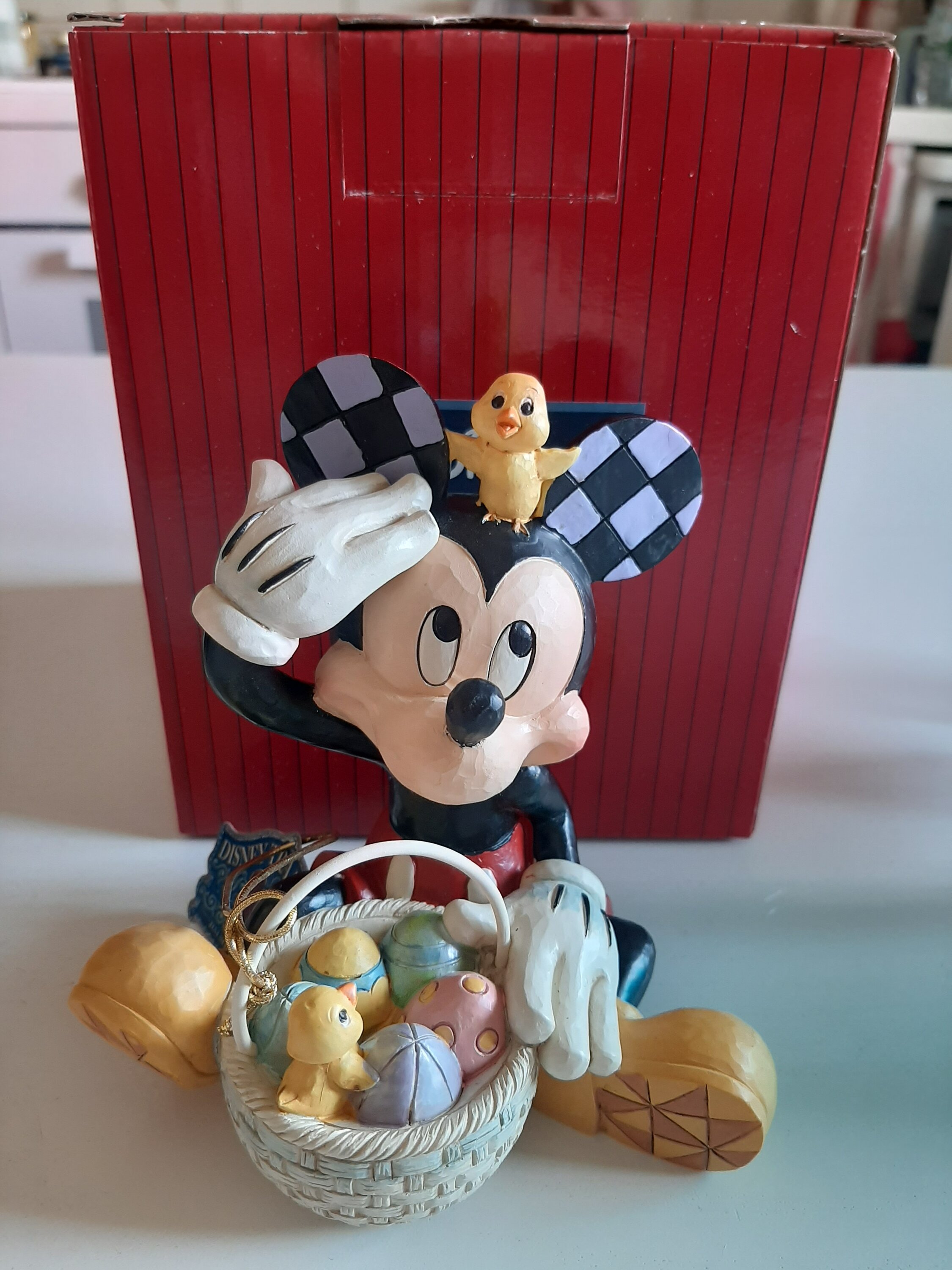 Cette figurine est magnifique et imposante : un adorable Mickey Mouse avec son poussin. De superbes couleurs printanières.