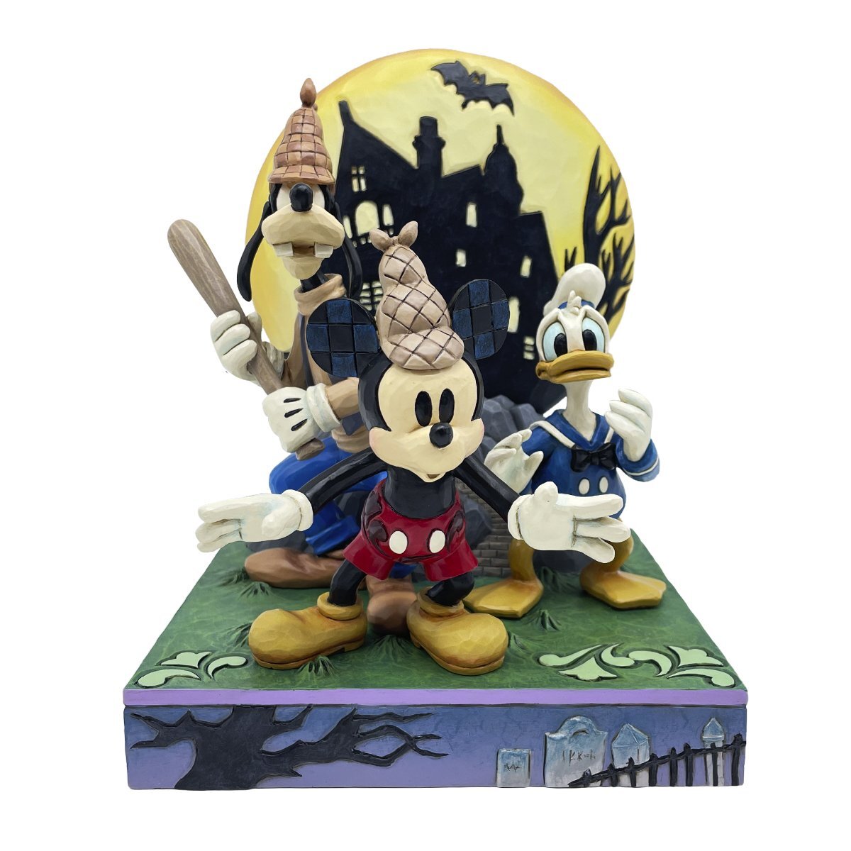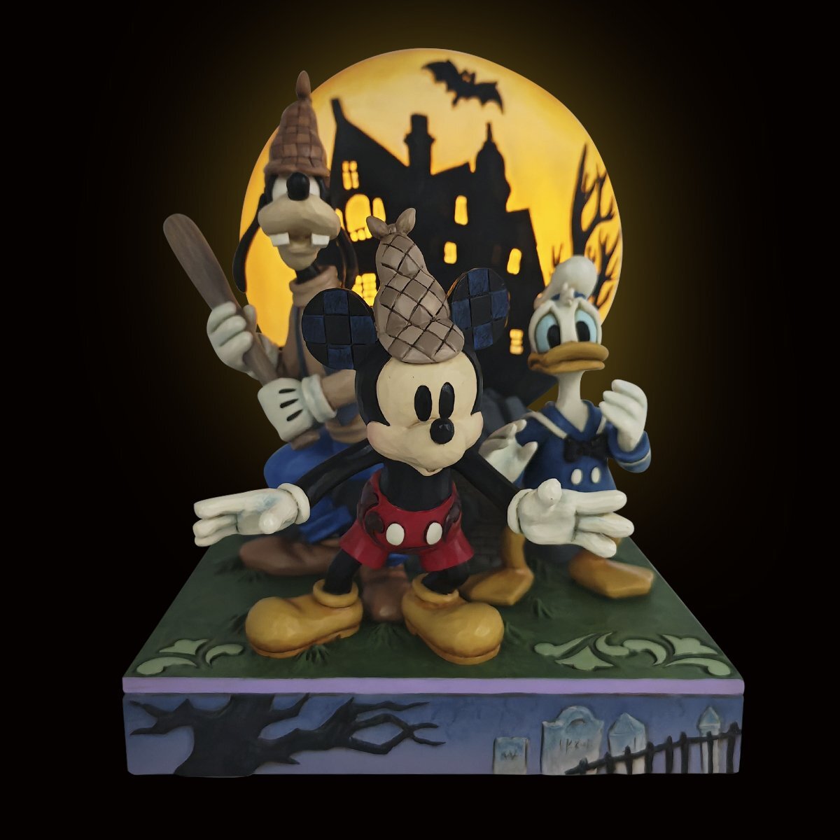À la fois mystérieuse et nostalgique, Mickey Mouse s'associe à Dingo et Donald dans cette superbe sculpture Disney Traditions inspirée de Lonesome Ghosts. Sur fond de lune scintillante et de silhouette de maison hantée, le trio affronte courageusement les esprits espiègles de la nuit Halloween . Une pièce magnifiquement détaillée qui allie l'animation Disney classique au style folk art caractéristique de Jim Shore, idéale pour les décorations Halloween et les collectionneurs.