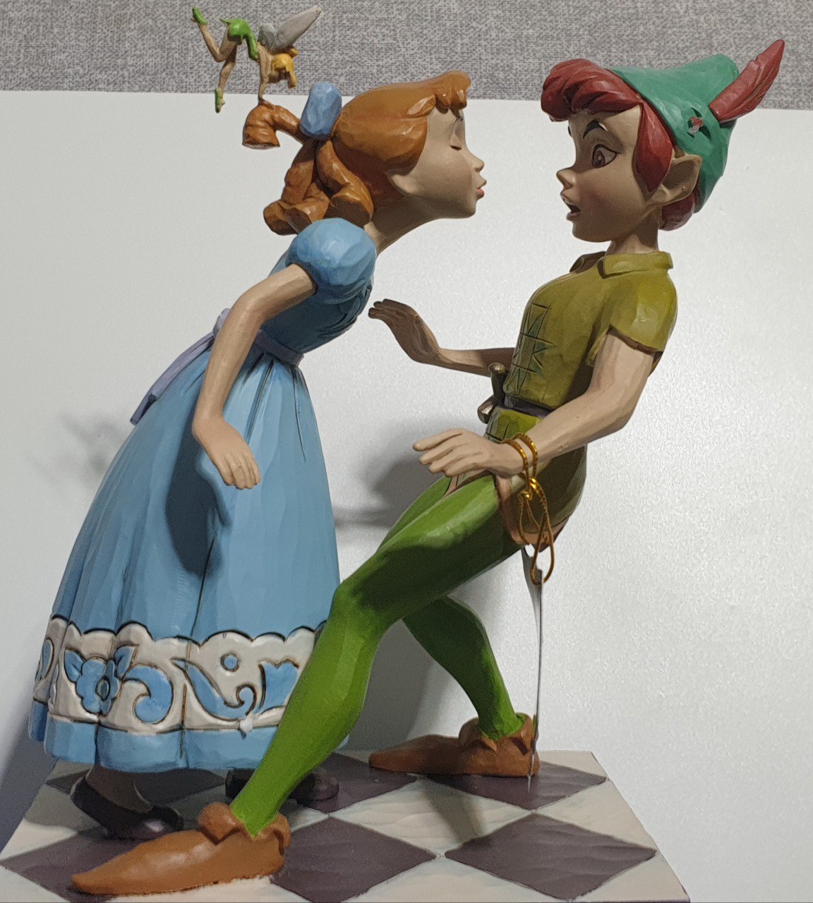 Cette figurine Traditions capture à merveille le moment crucial du début du film où Wendy, déjà espiègle, tente d'embrasser l'innocent Peter Pan, la Fée Clochette jalouse intervenant de justesse. La scène est magnifiquement rendue, et ce petit bijou a immédiatement trouvé sa place dans ma vitrine Disney.