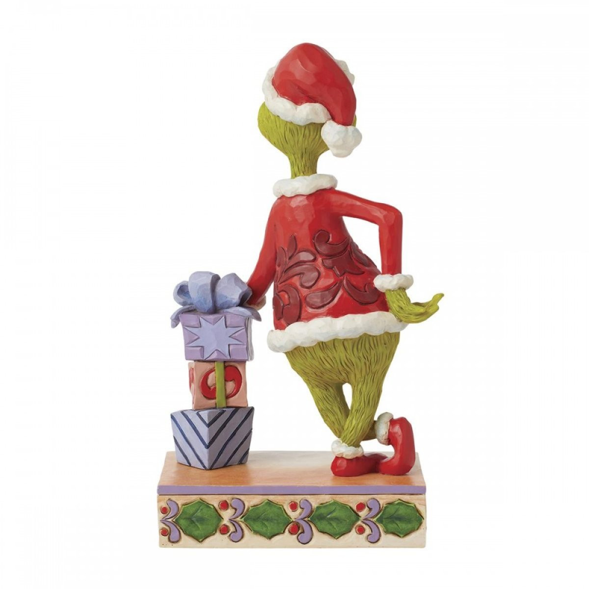 Cette figurine de Jim Shore représente le Grinch habillé en Père Noël appuyé contre une pile de cadeaux joliment emballés. Les jambes croisées, le Grinch se tient avec attitude et une main sur sa hanche. Va-t-il voler Noël ou apprendre à aimer la saison ? De la collection Grinch, conçue par l'artiste et sculpteur primé Jim Shore. Chaque figurine est peint à la main et de légères variations de couleurs sont à prévoir, rendant chaque pièce unique. Emballé dans une boîte cadeau. Ces articles ne sont pas des jouets pour enfants. Destiné aux adultes uniquement.