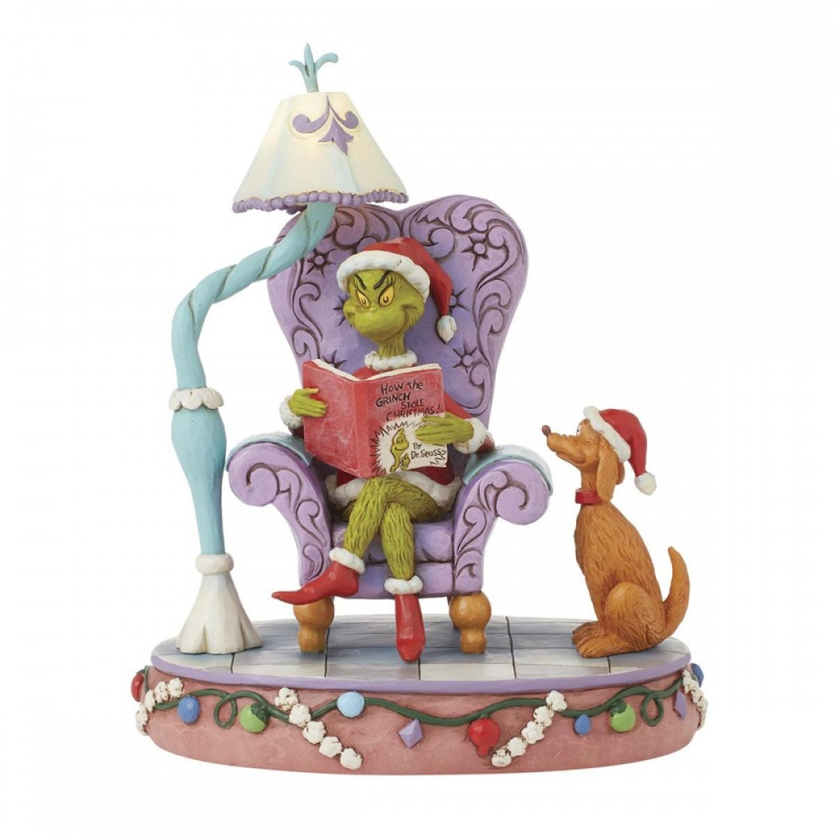 Cette figurine représente le Grinch assis confortablement dans un fauteuil bleu et violet. Le Grinch lit son livre déguisé en Père Noël. Son fidèle chien, Max, est assis à côté d'elle. S'il fait trop sombre, allumez sa lampe pour que le Grinch puisse continuer à lire. De la collection Grinch, conçue par l'artiste et sculpteur primé Jim Shore. Chaque figurine est peint à la main et de légères variations de couleur sont attendues, ce qui rend chaque pièce unique. Emballé dans un coffret cadeau. Ces articles ne sont pas des jouets pour enfants. Réservé aux adultes uniquement.
