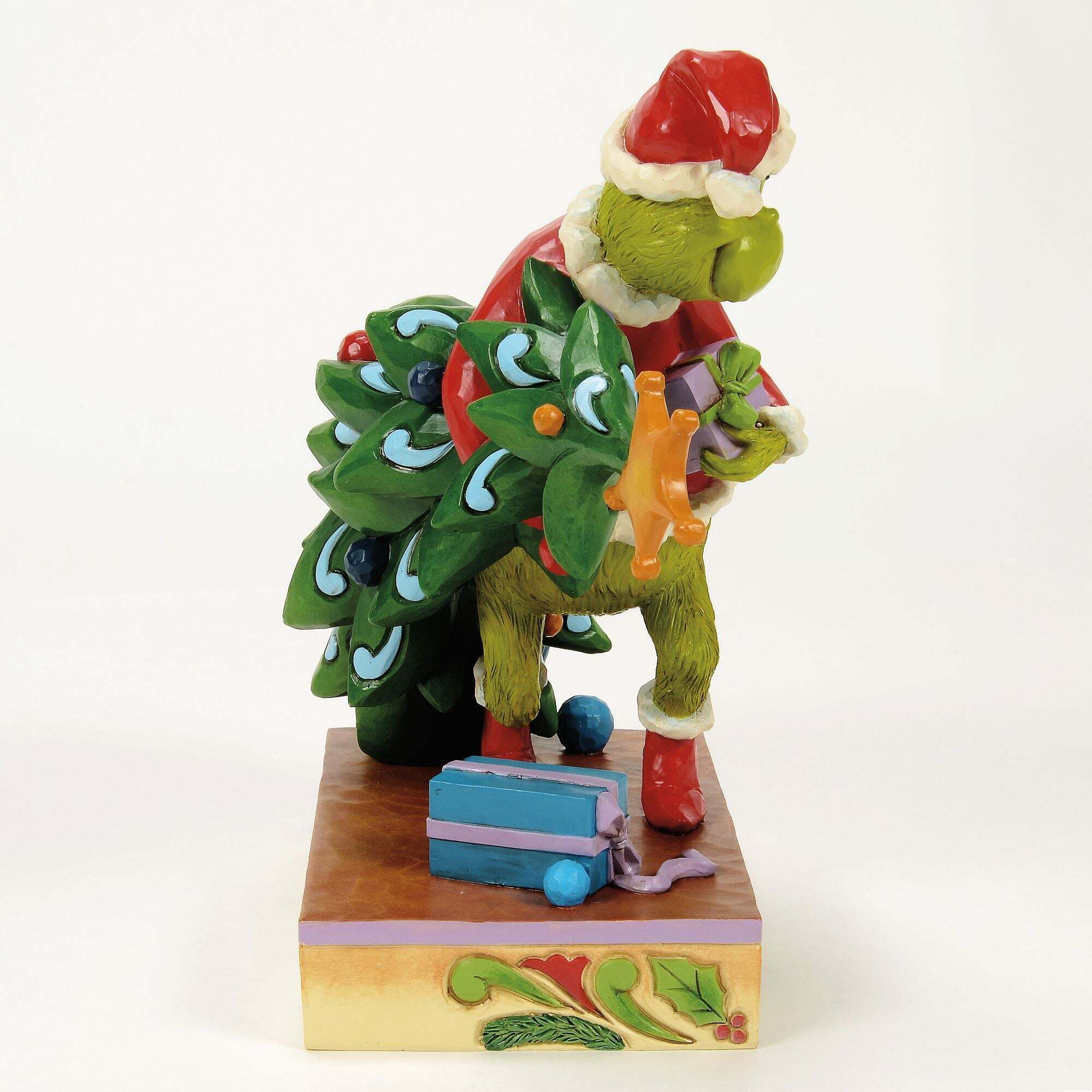 Déguisé en Noël, le Grinch débarque pour voler Noël. Il s'empare discrètement du sapin et s'enfuit. Les motifs complexes et les couleurs vives soulignent son esprit malicieux, ajoutant une touche d'humour et de charme artistique à votre décoration. Conçues par l'artiste et sculpteur primé Jim Shore pour la collection Grinch. Ces figurines ne sont pas des jouets pour enfants. Réservées aux adultes. Hauteur: 18,5 cm