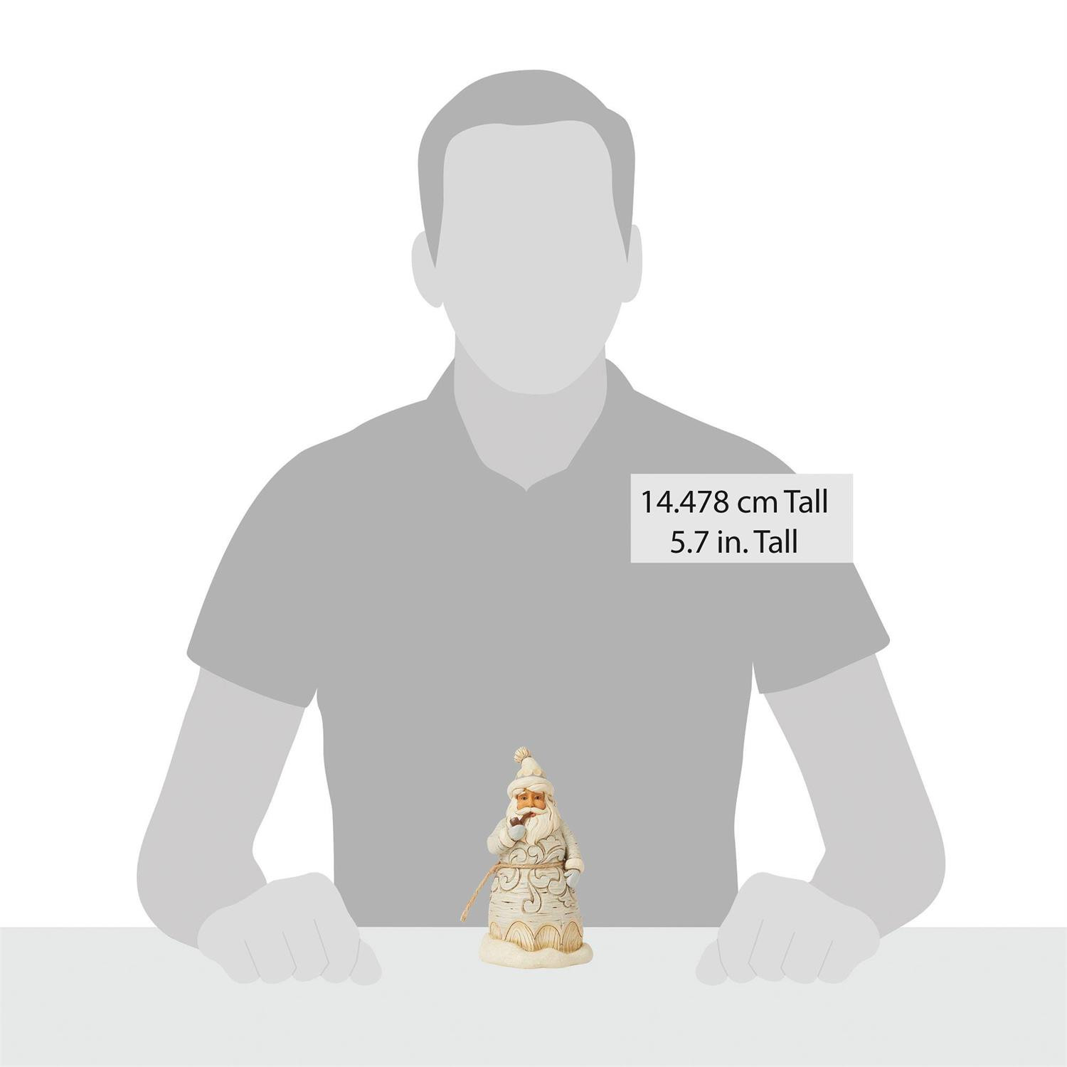 Cette petite figurine du Père Noël met en valeur Noël avec une robe et un chapeau en rosemaling blanc accentués. Fumant une pipe, ce Père Noël apporte une chaleur supplémentaire à votre décoration hivernale. Célébrez la saison avec la collection White Woodland de Jim Shore.