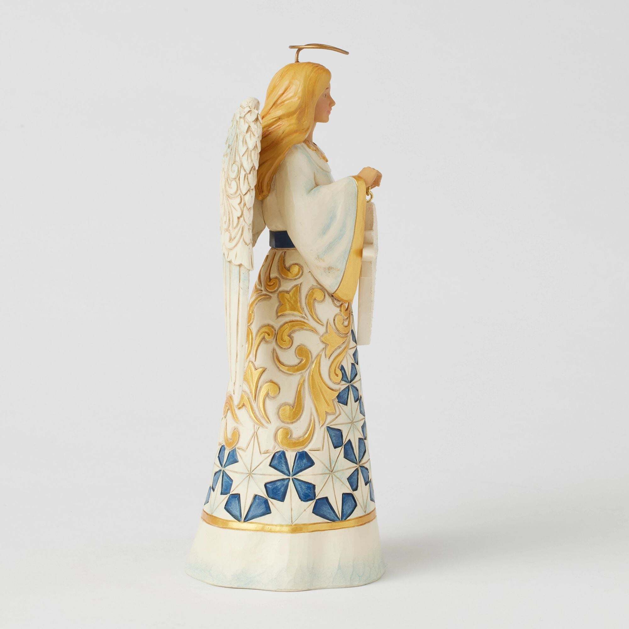 Ce magnifique angel Jim Shore incarne la beauté avec sa robe étoilée dorée et bleue, tenant une étoile de Noël scintillante. Ses ailes décorées ajoutent une touche de grâce, faisant d'elle un symbole céleste de majesté et de paix pour les fêtes.