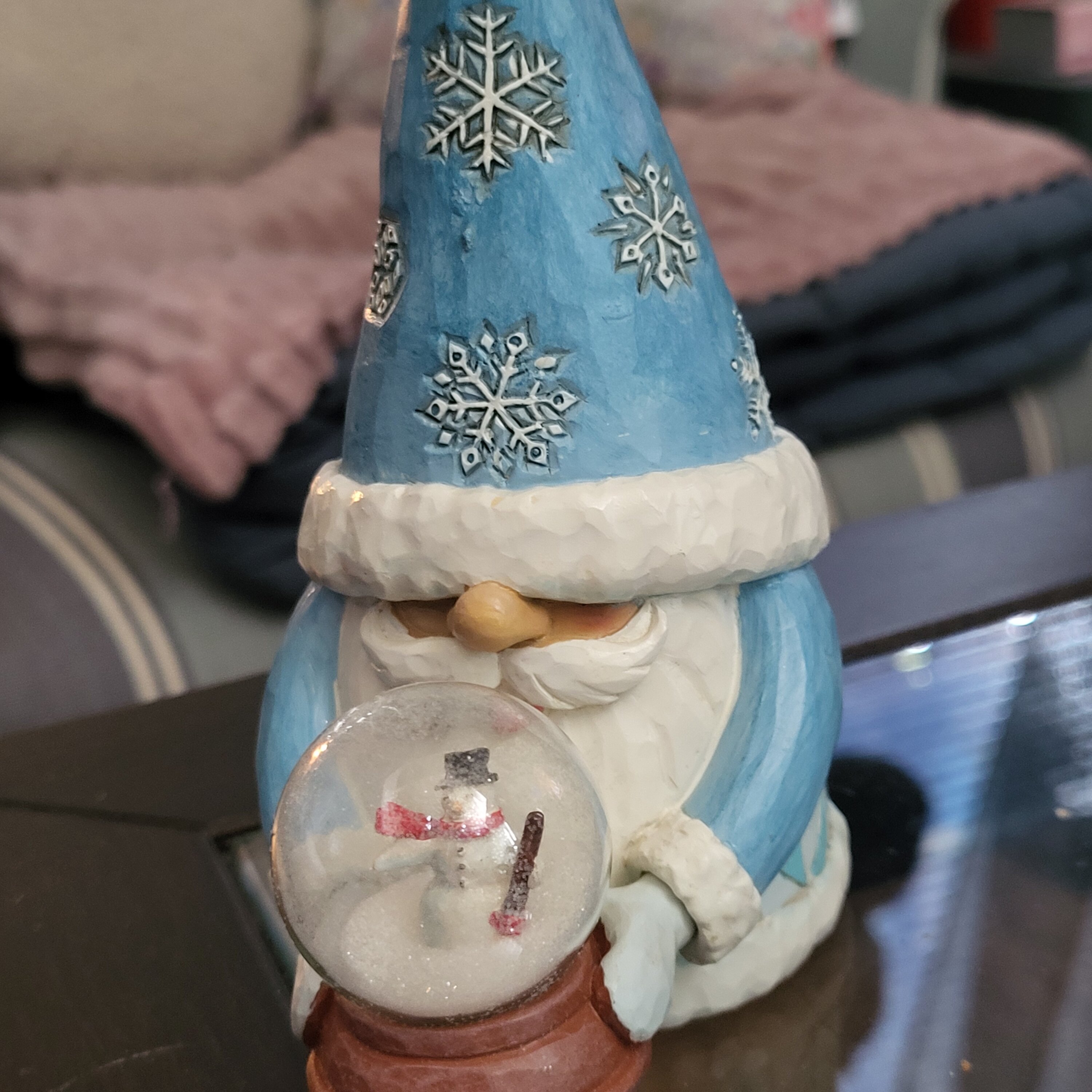 Ce gnome de Noël Jim Shore porte un chapeau orné de flocons de neige. Il porte également une charmante boule à neige représentant un bonhomme de neige miniature, capturant la magie des fêtes et ajoutant une touche chaleureuse et magique à votre décoration de Noël.