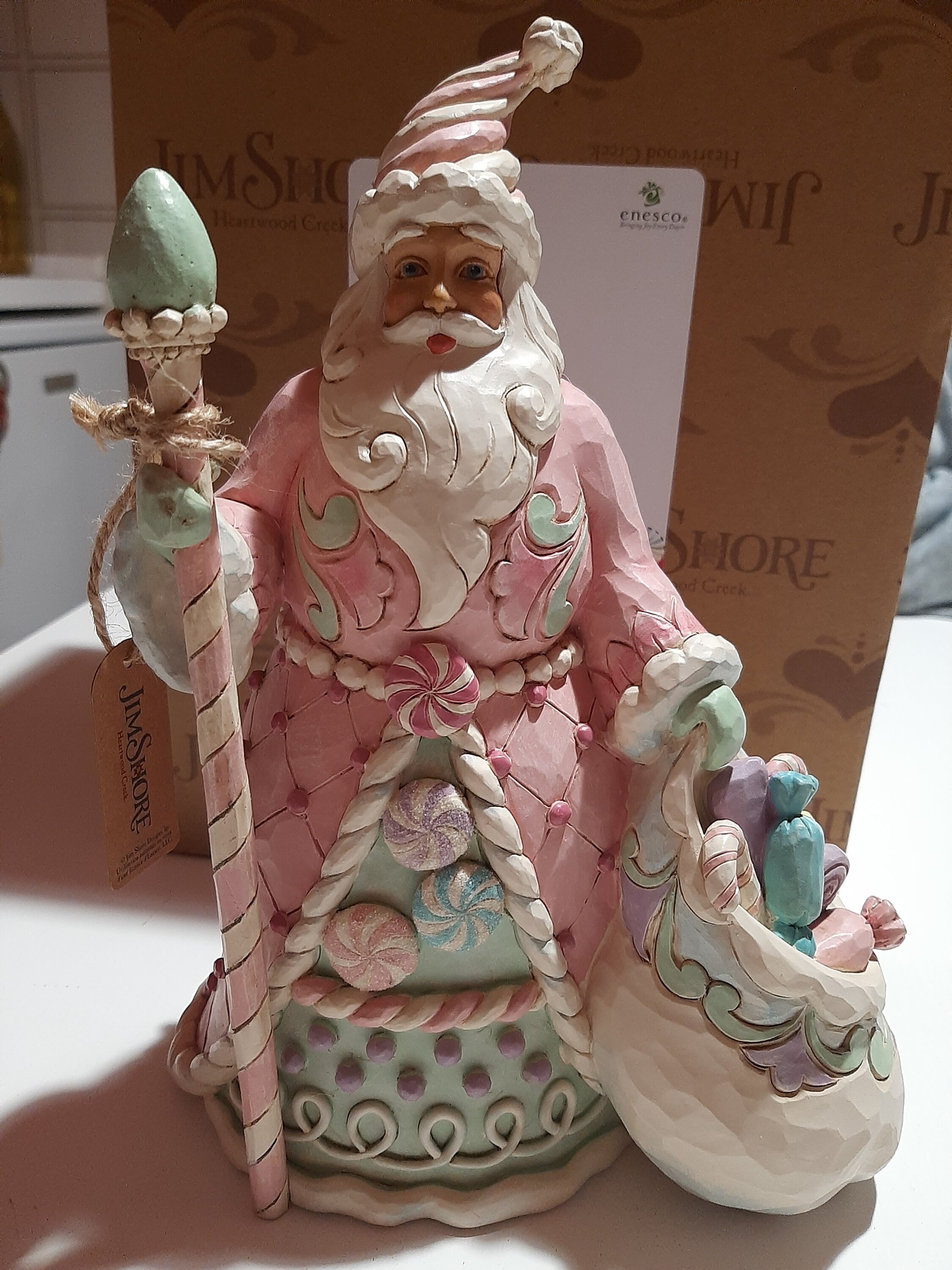 Cette charmante figurine de Noël de la collection Heartwood Sweets, créée par Jim Shore, arbore de jolies nuances pastel de rose et de vert, décorées de bonbons. Tenant une canne en sucre d'orge et un sac de friandises, son chapeau évoque une glace tourbillonnante, tandis que sa cape arbore les motifs de l'artiste.