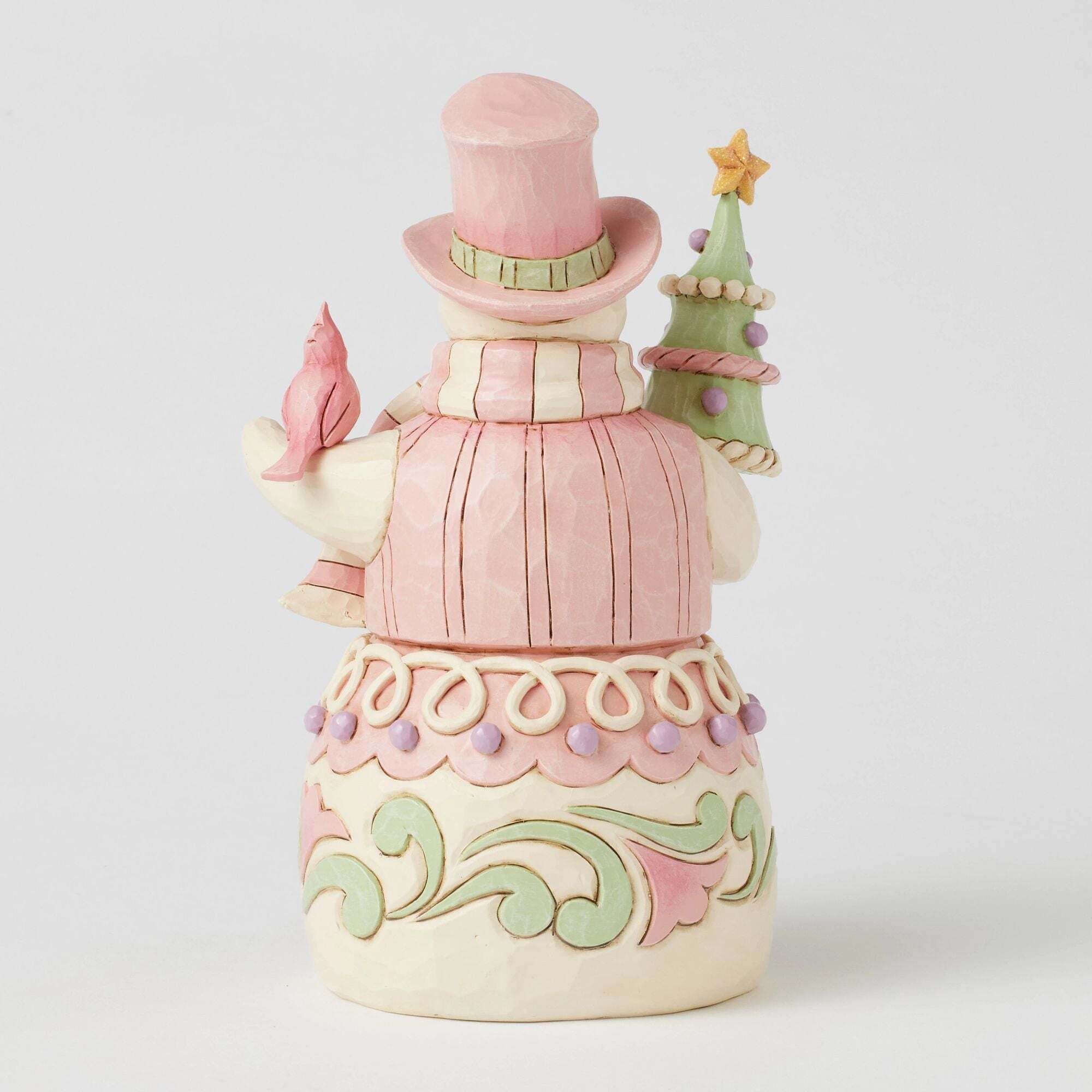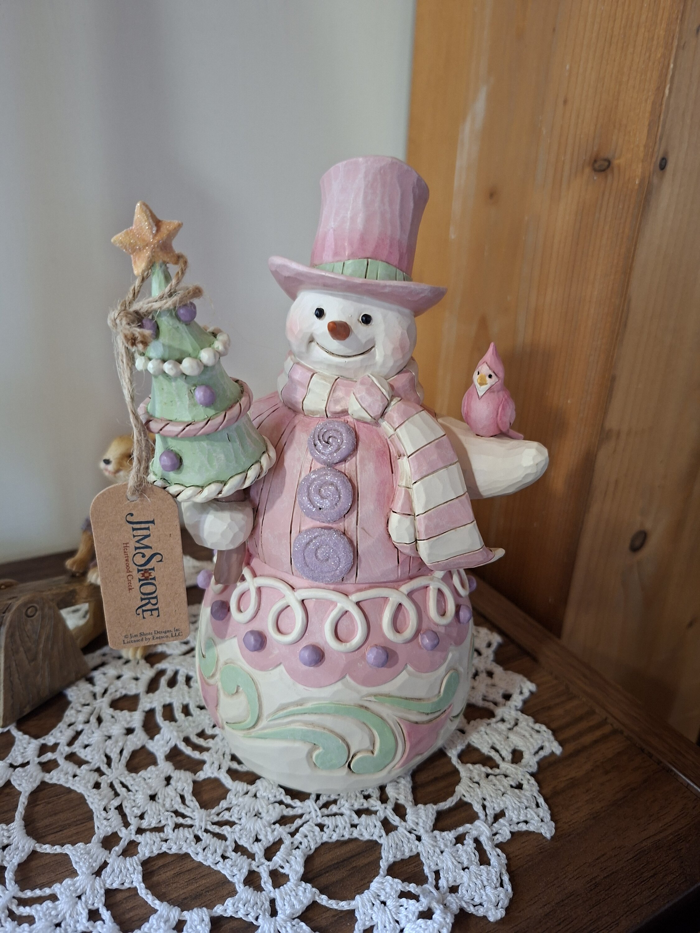 Ce bonhomme de neige rose pastel de la collection Heartwood Sweets, conçu par Jim Shore, déborde de charme avec ses motifs délicats, ses paillettes et ses détails, reflétant l'esprit des fêtes. Il tient affectueusement un sapin décoré et un cardinal.
