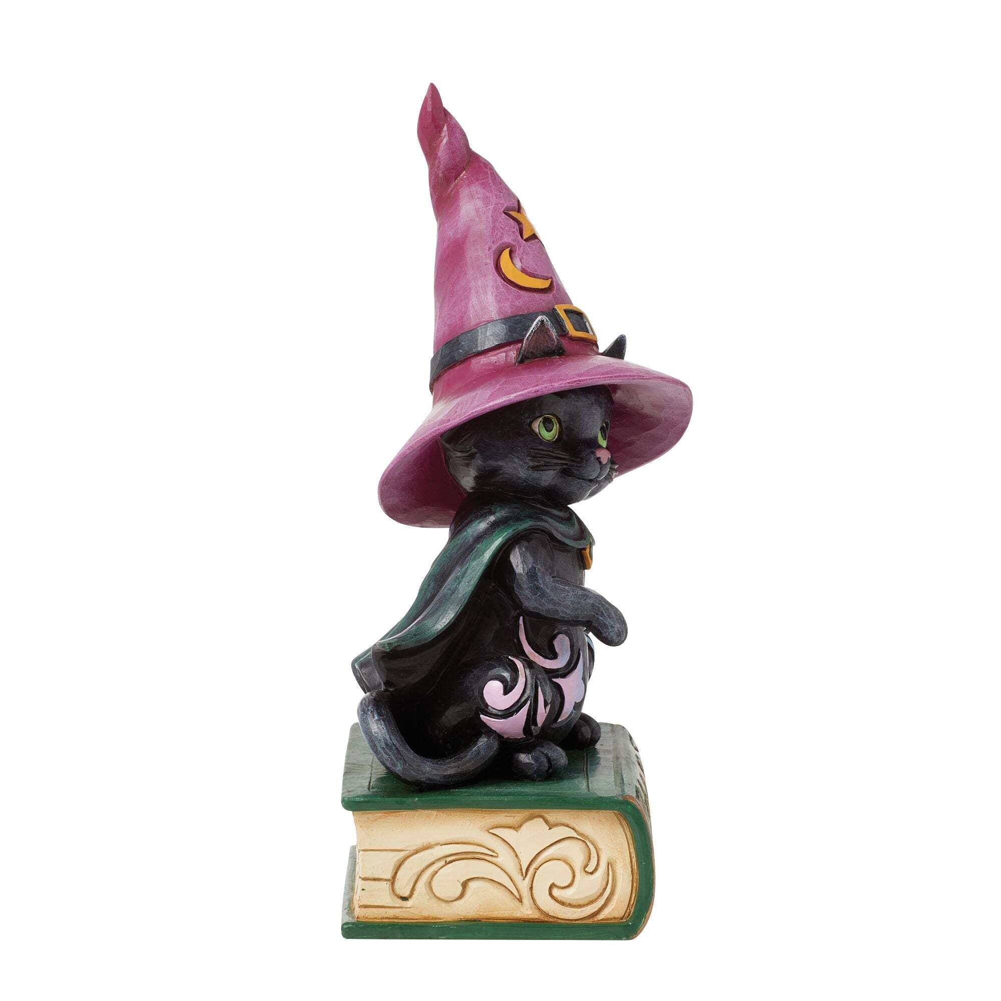 Apportez une touche de magie avec cette adorable figurine Jim Shore représentant un chat noir portant un chapeau et une cape de sorcière. Posé sur un grimoire, ce petit félin ajoute une touche de charme et d'envoûtement à votre décoration Halloween .