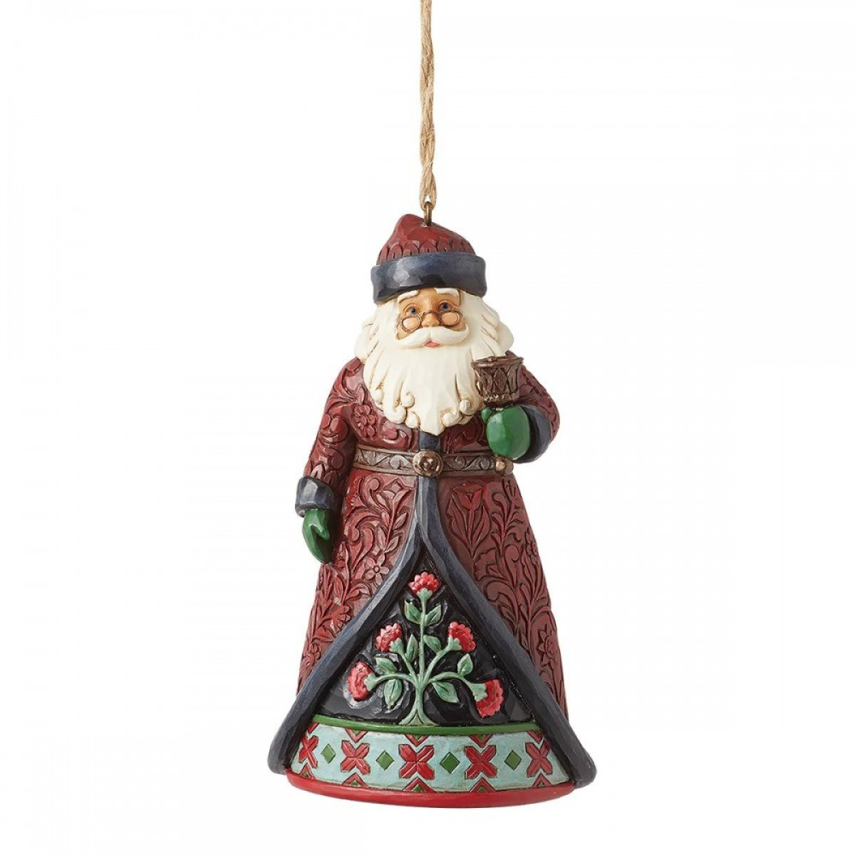 Suspension du Père Noël tenant une cloche de Noël. Conçue par l'artiste primé Jim Shore dans le cadre de la collection de Holiday Manor Heartwood Creek.