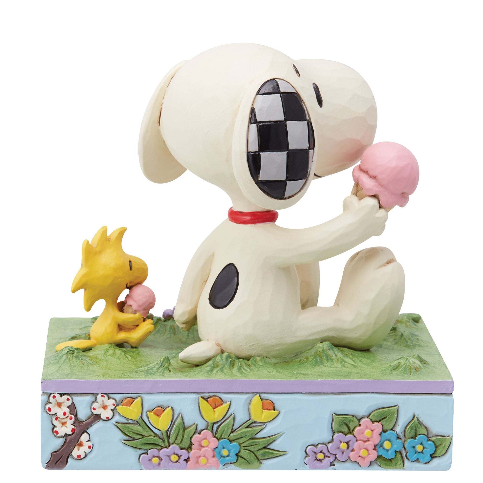 Cette figurine exclusive de Jim Shore représente le duo Peanuts, chouchou des fans, profitant d'une belle journée d'été. Allongés sur l'herbe, entourés de fleurs, ils savourent leur glace comme si l'été ne finirait jamais. Ces figurines ne sont pas des jouets pour enfants. Réservées aux adultes. Hauteur: 13cm