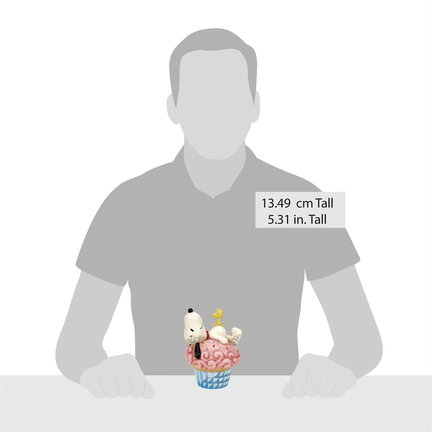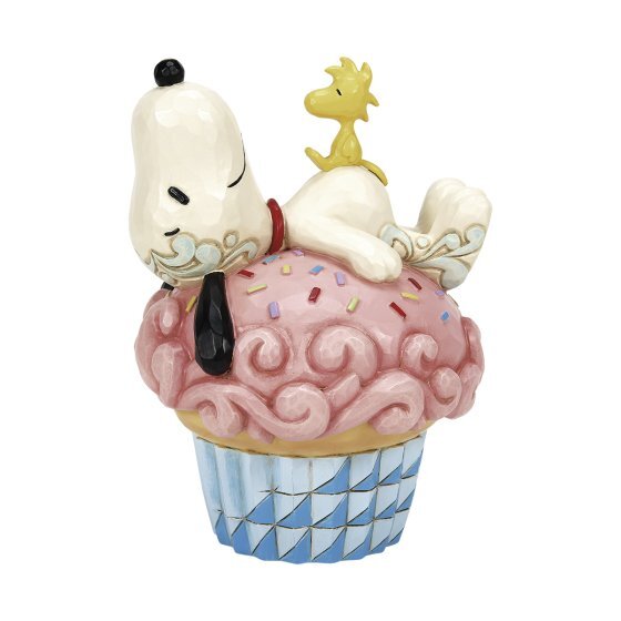 Dans le design charmant de Jim Shore, Snoopy fait une sieste confortable au sommet d'un grand cupcake rose saupoudré, avec des détails complexes de rosemaling et un glaçage tentant. Pour ajouter à la douceur, Woodstock rejoint la soirée pyjama sur Snoopy.