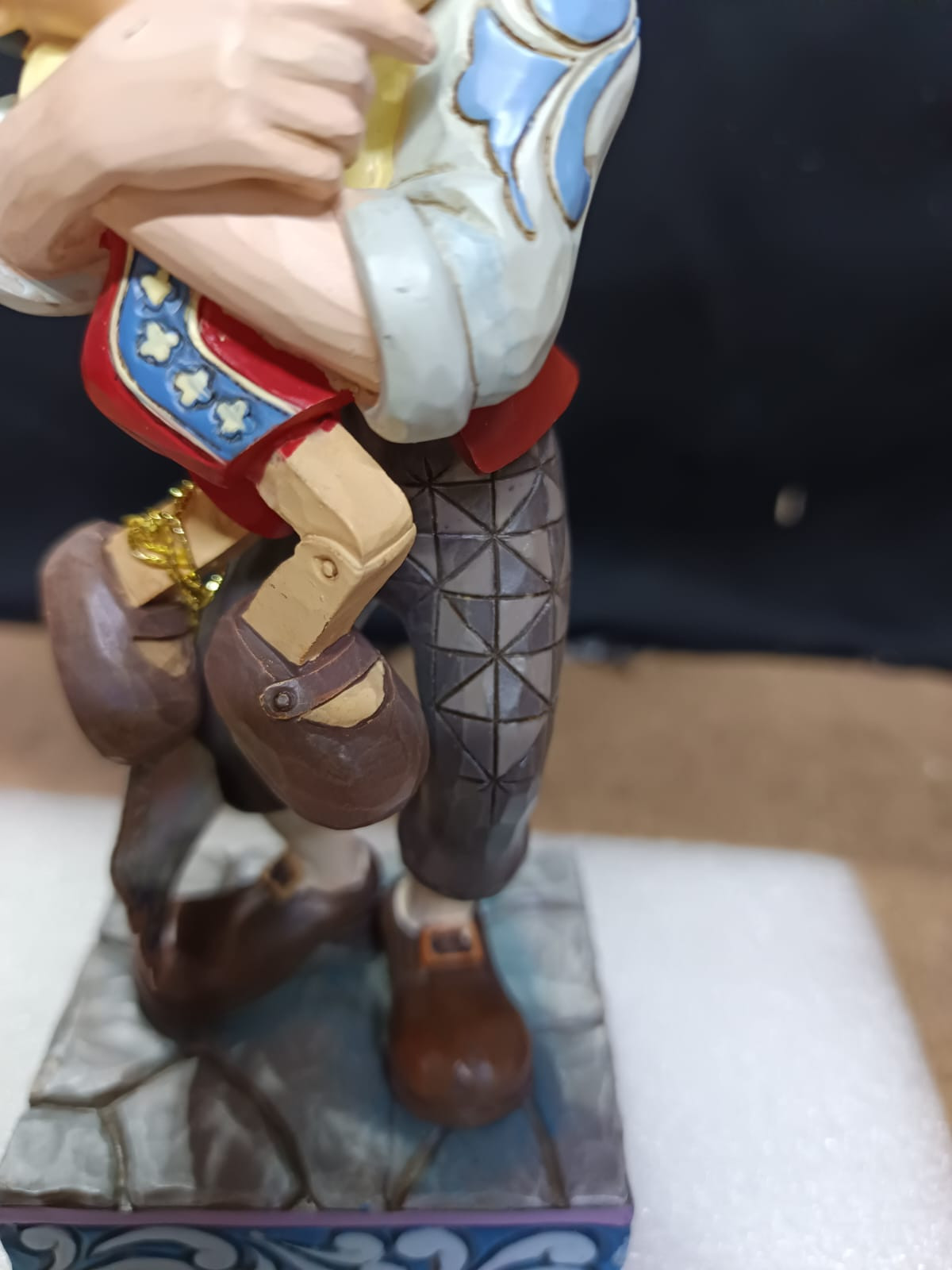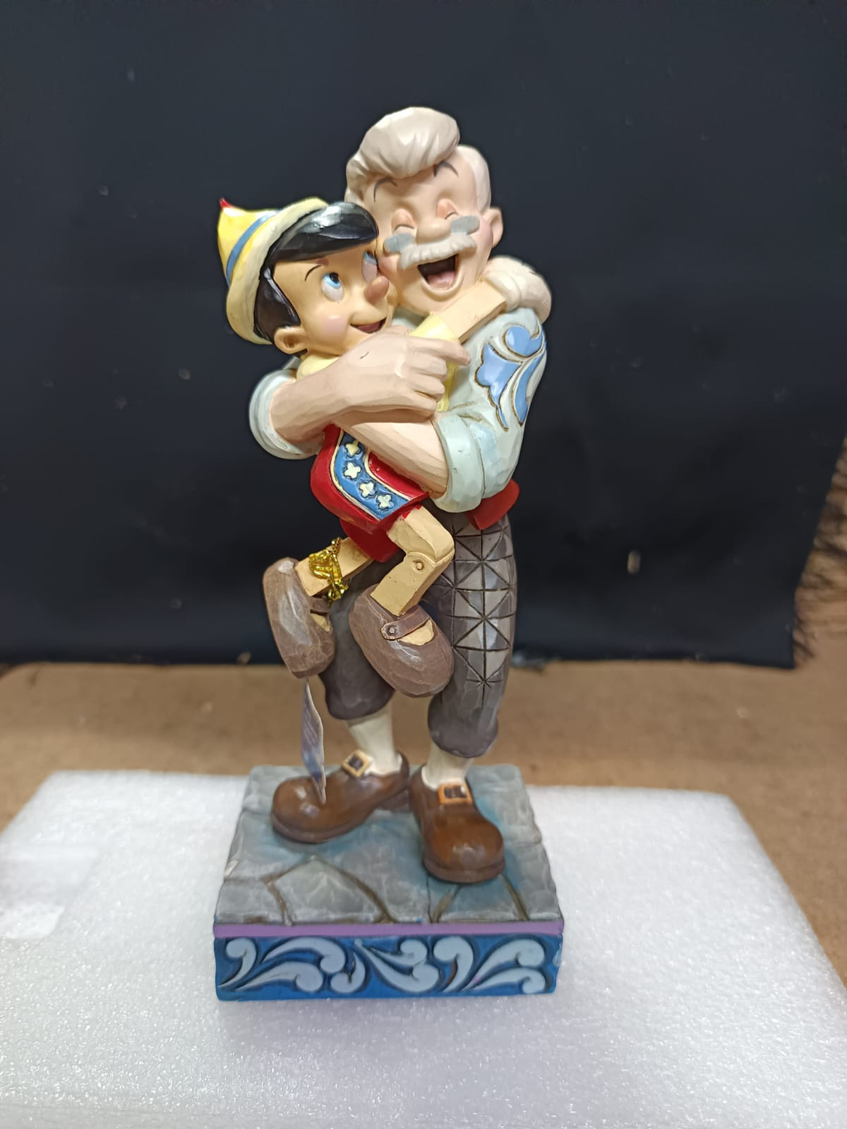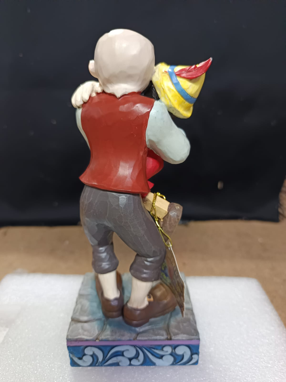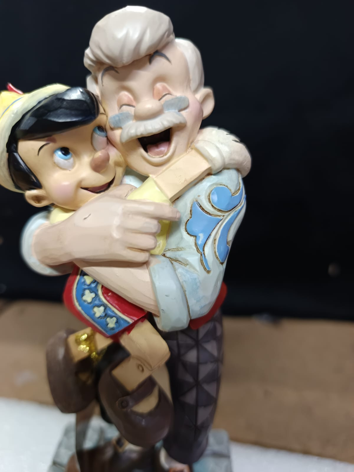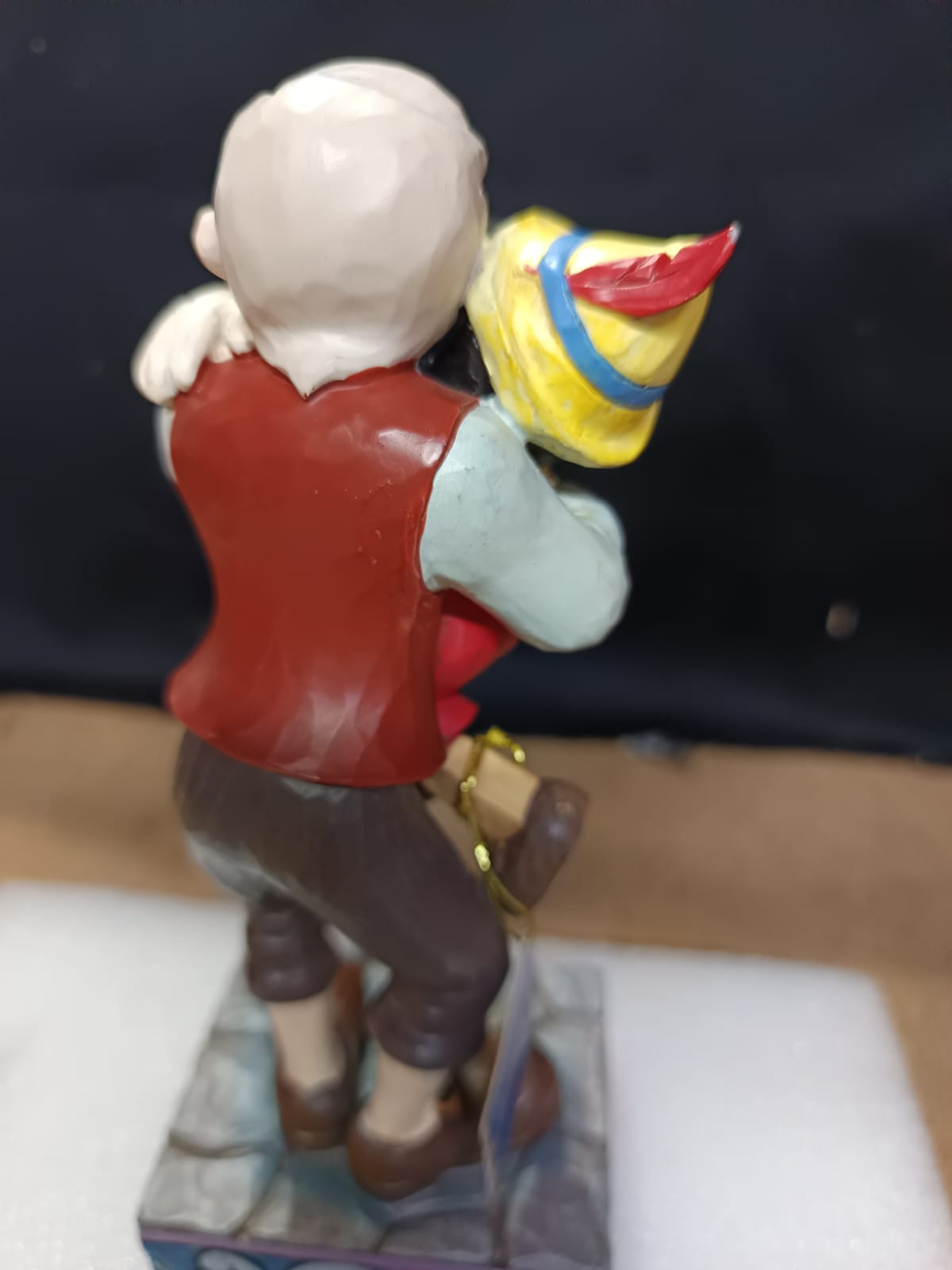 - Petits défauts de peinture sur le front de Pinocchio, la main de Gepetto et au dos de la veste de Gepetto