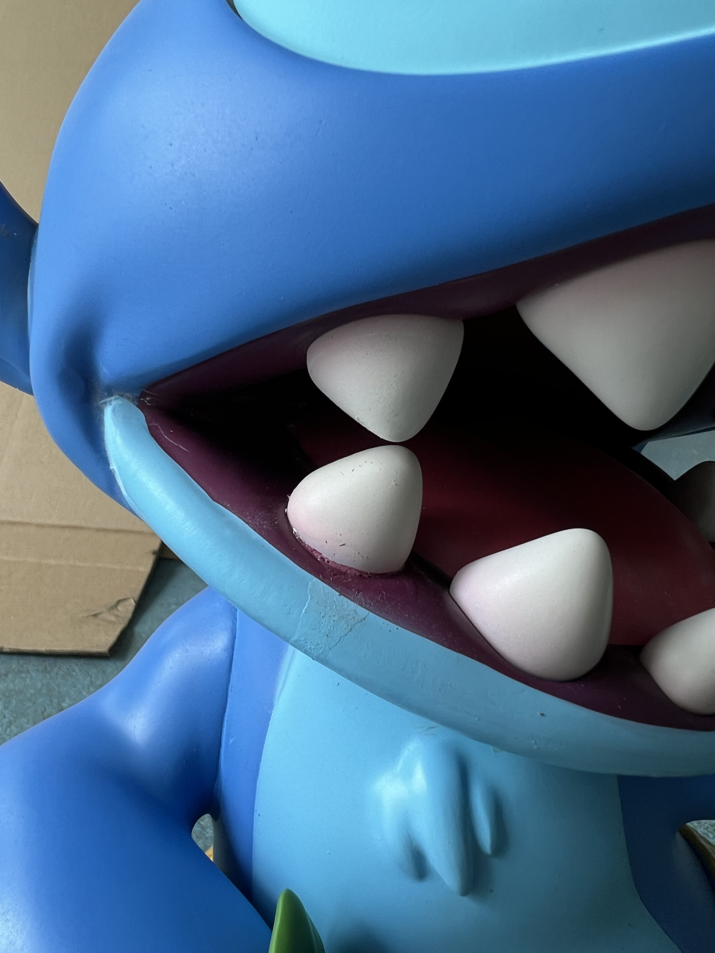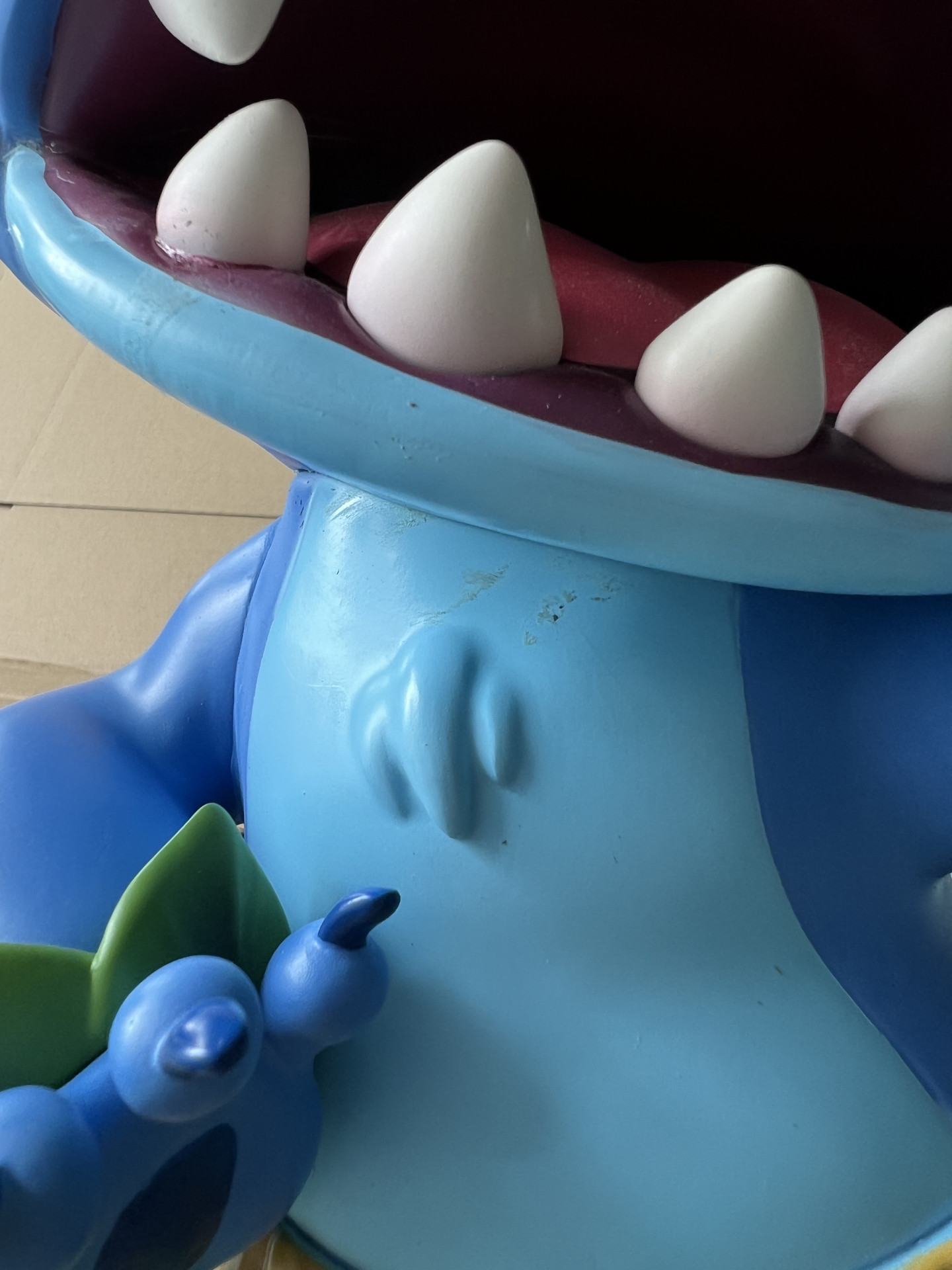 - Défauts de peinture et de colle sur le torse et sur la mâchoire, trace blanche sur le bras gauche et pied droite ne reposant pas sur le socle